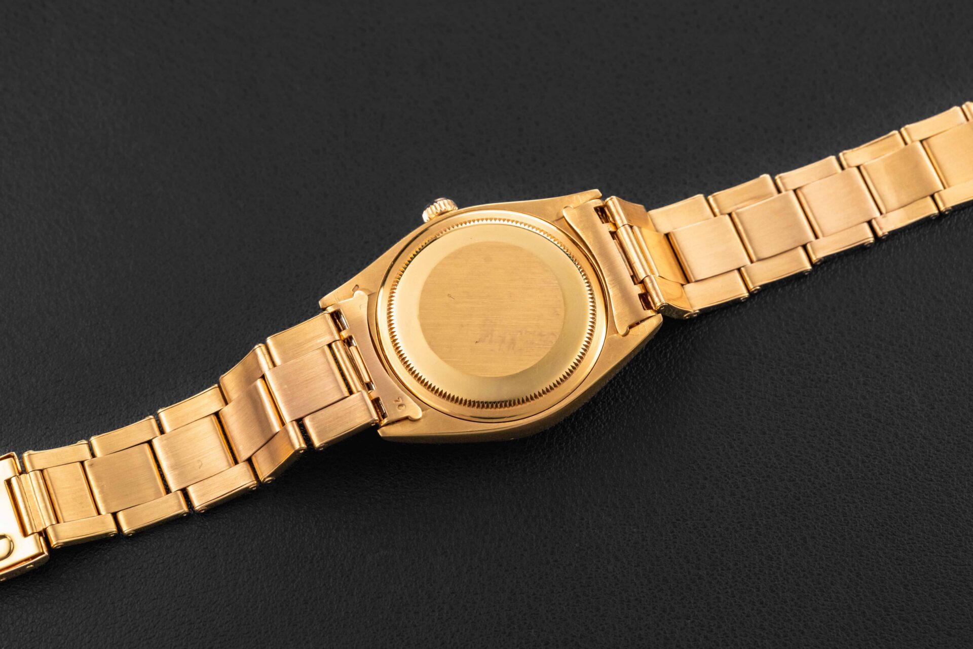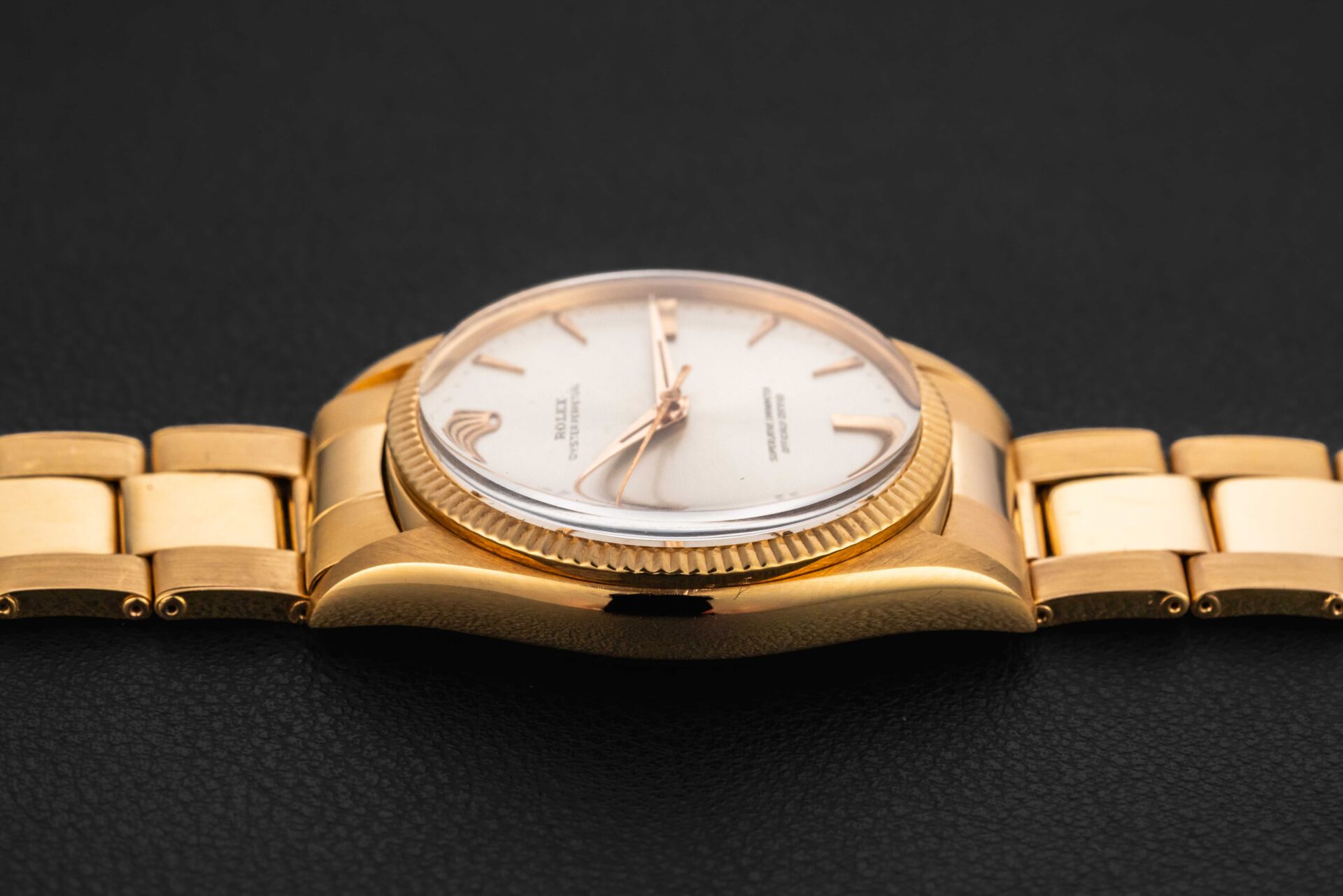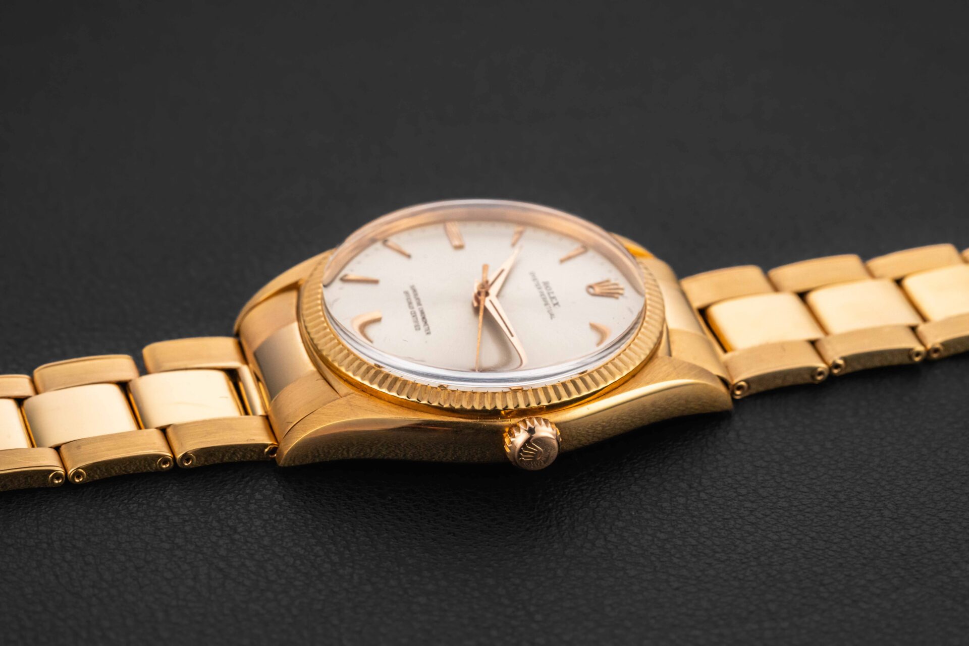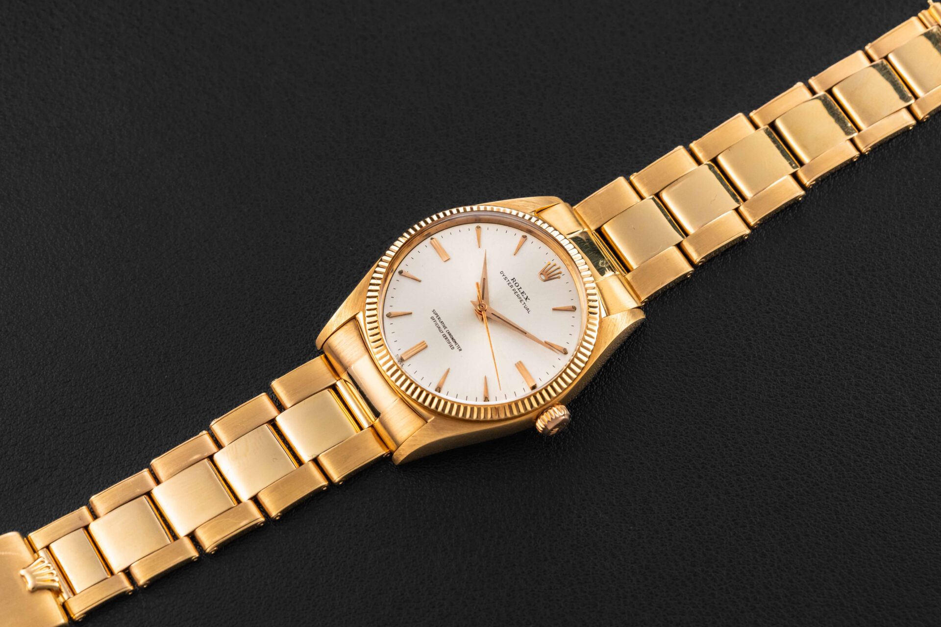 Up for grabs is a very rare and early oversized (36mm) Oyster Perpetual by Rolex in solid 18kt yellow gold, given the reference 1003. This watch was produced in the late 1950s, and this reference was larger than the standard fare 34mm. The condition on this rare Rolex Oyster Perpetual is excellent, with a sharp and seemingly unpolished case, and beautiful sunburst silver dial with original radium luminous on both dial and original alpha hands. Further, the watch remains on its incredibly rare 1950s Rolex rivet bracelet produced by Gay Freres, dated to 1956, and has 11 full links with almost no stretch. Please Note: one of the endlinks to the bracelet is not stamped “76” and may have been replaced at some point in the past.