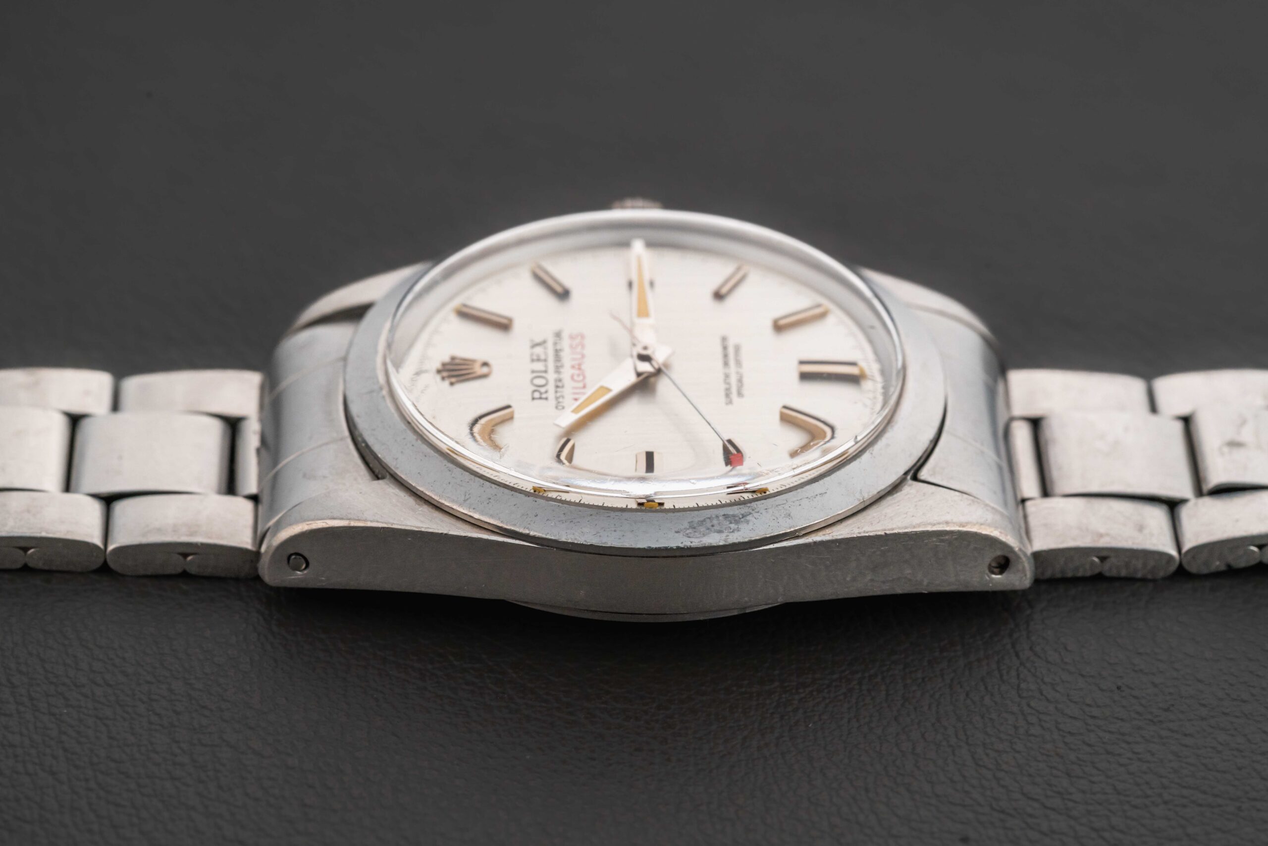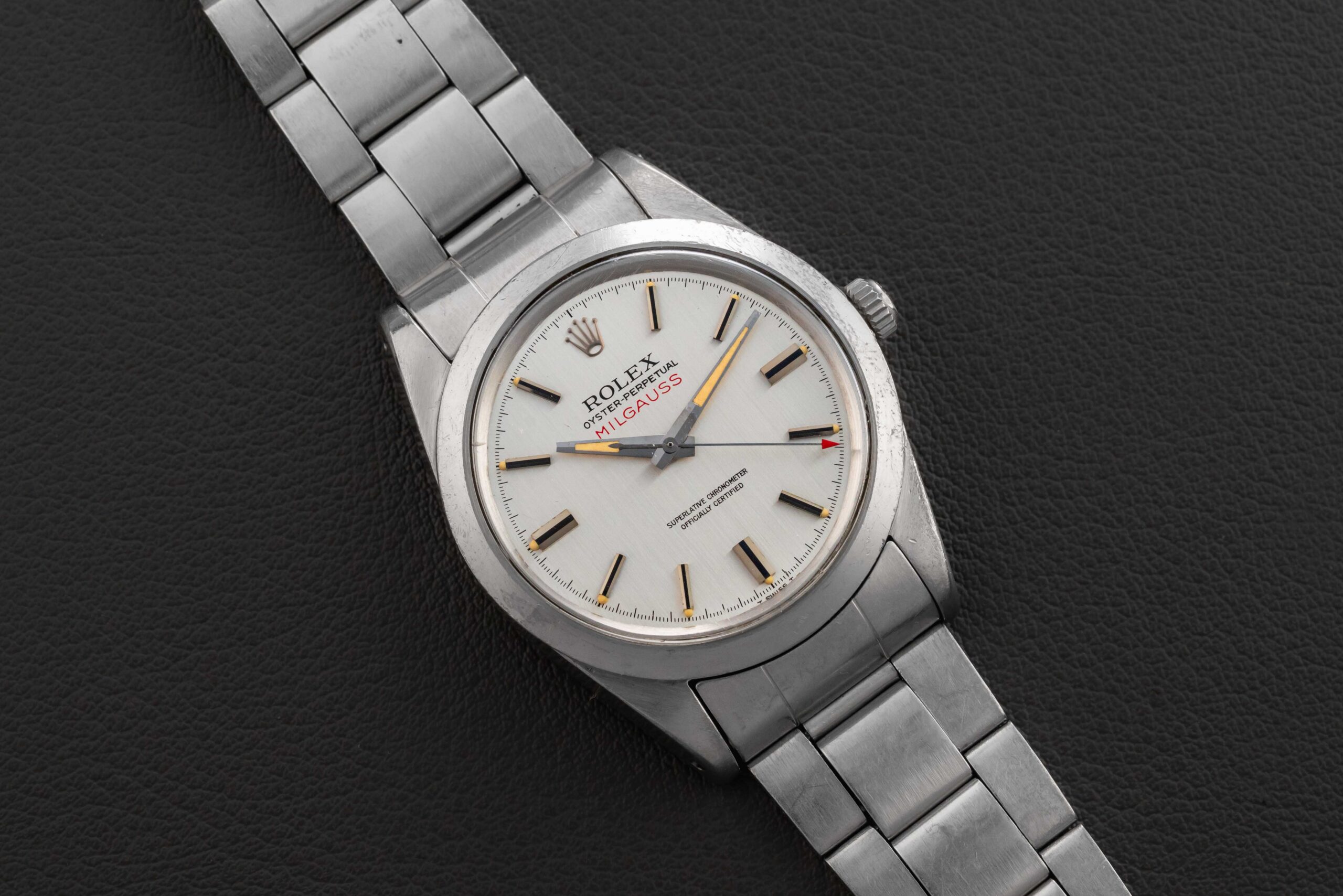 Offered here is a very early Rolex Milgauss, Ref. 1019, circa 1968 (serial 1.9m). Introduced in 1956, the Milgauss was designed as Rolex’s answer to magnetism at the workplace, and was made for workers in power plants, scientific fields, and medical fields, where the magnetism of a watch would often be a disrupting problem.