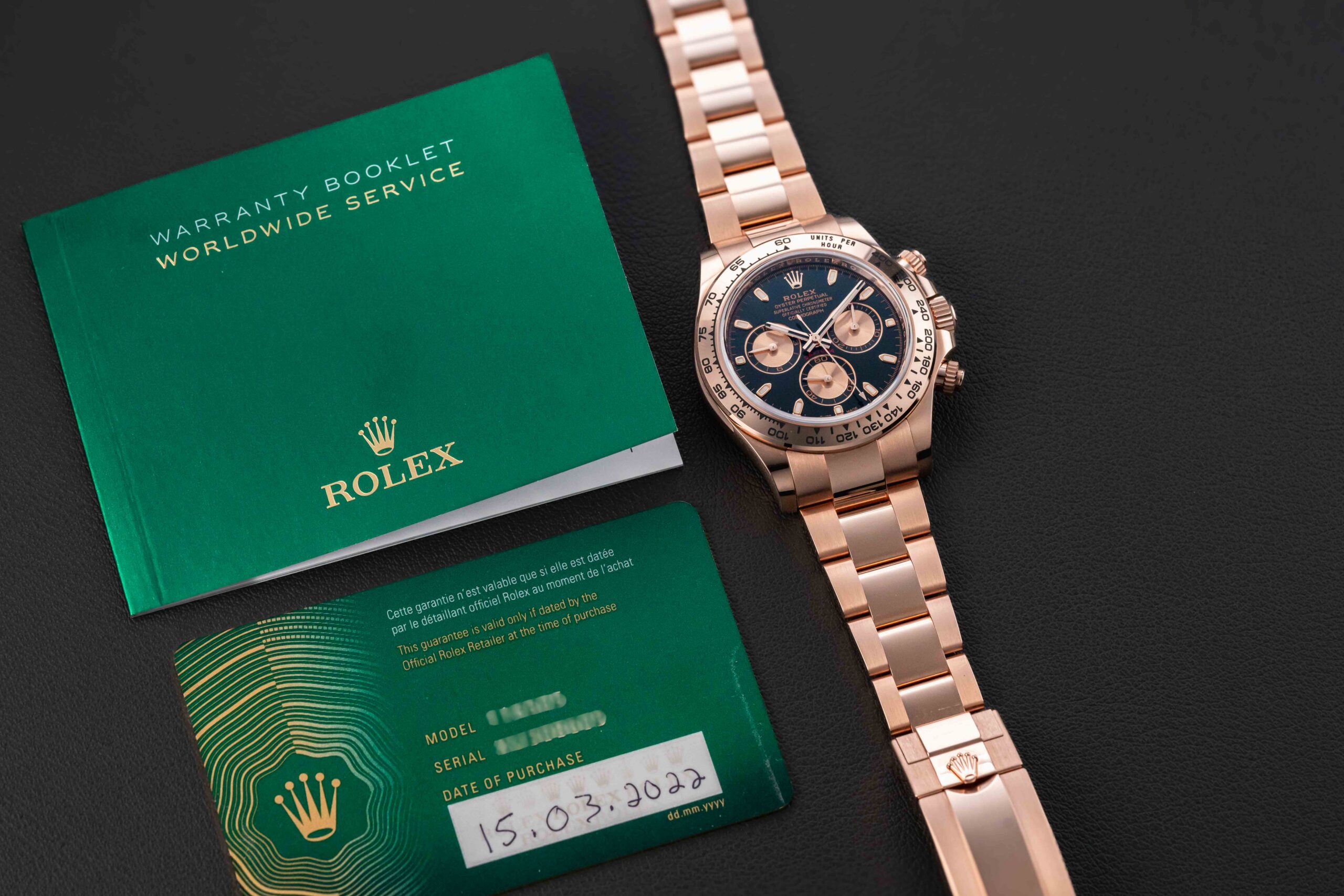 Up for grabs is a 2022 Rolex Daytona, reference 116505, in 18kt Rose gold, fitted with a black dial. This Rolex Daytona comes with its original Rolex box, and has a strong case, showing no major scuffs or scratches, overall very attractive near mint condition. This watch comes full-set with the original box papers and booklets.