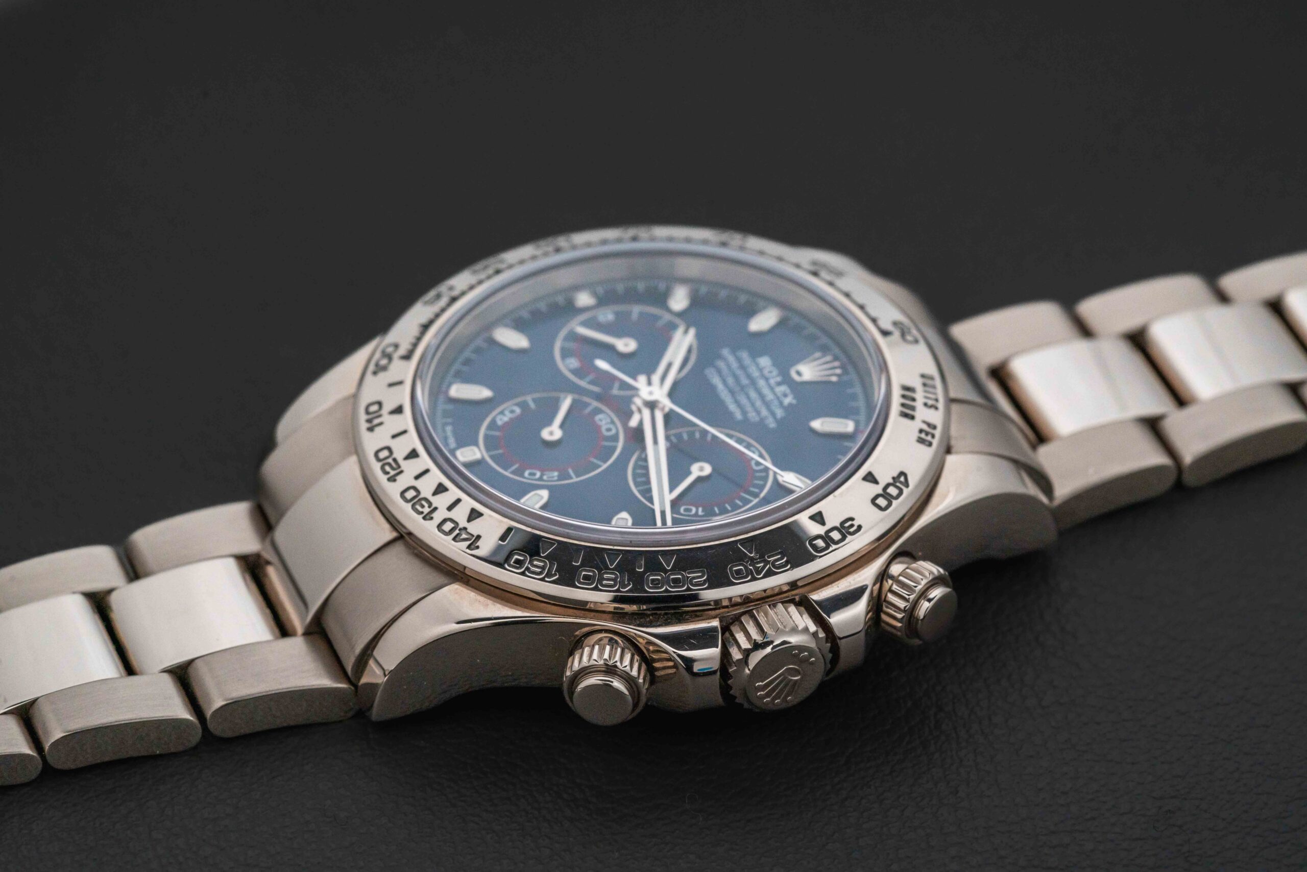 Up for grabs is a Rolex Daytona, reference 116509, in 18kt white gold, fitted with an uncommon blue dial. This Rolex Daytona comes with its original Rolex box, and service card (serviced in 2022 not pictured). This solid gold Rolex Daytona is in nice pre-owned with some small scratched from regular wear, but no major damage. The watch can be professionally detailed upon request.