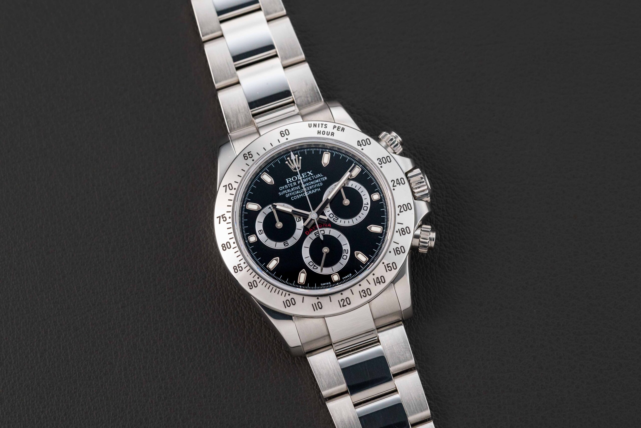 Up for grabs is a Rolex Daytona, reference 116520, this reference of Daytona was the very first in-house automatic chronograph movement, the Caliber 4130, produced by Rolex, following the success of their Zenith-produced Caliber 4030 movement Daytonas. This Daytona is a late 116520 production with a scrambled serial and blue lume.