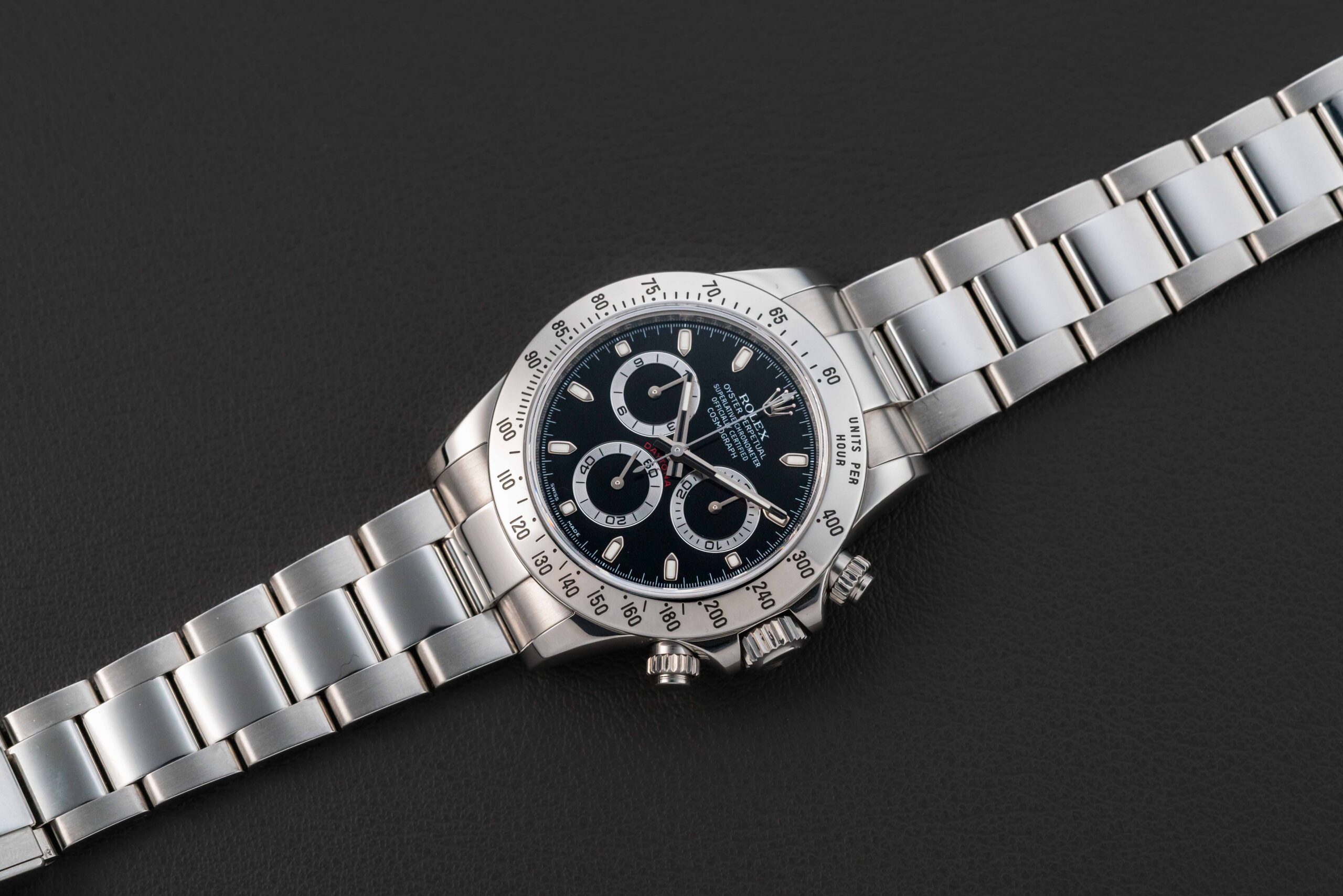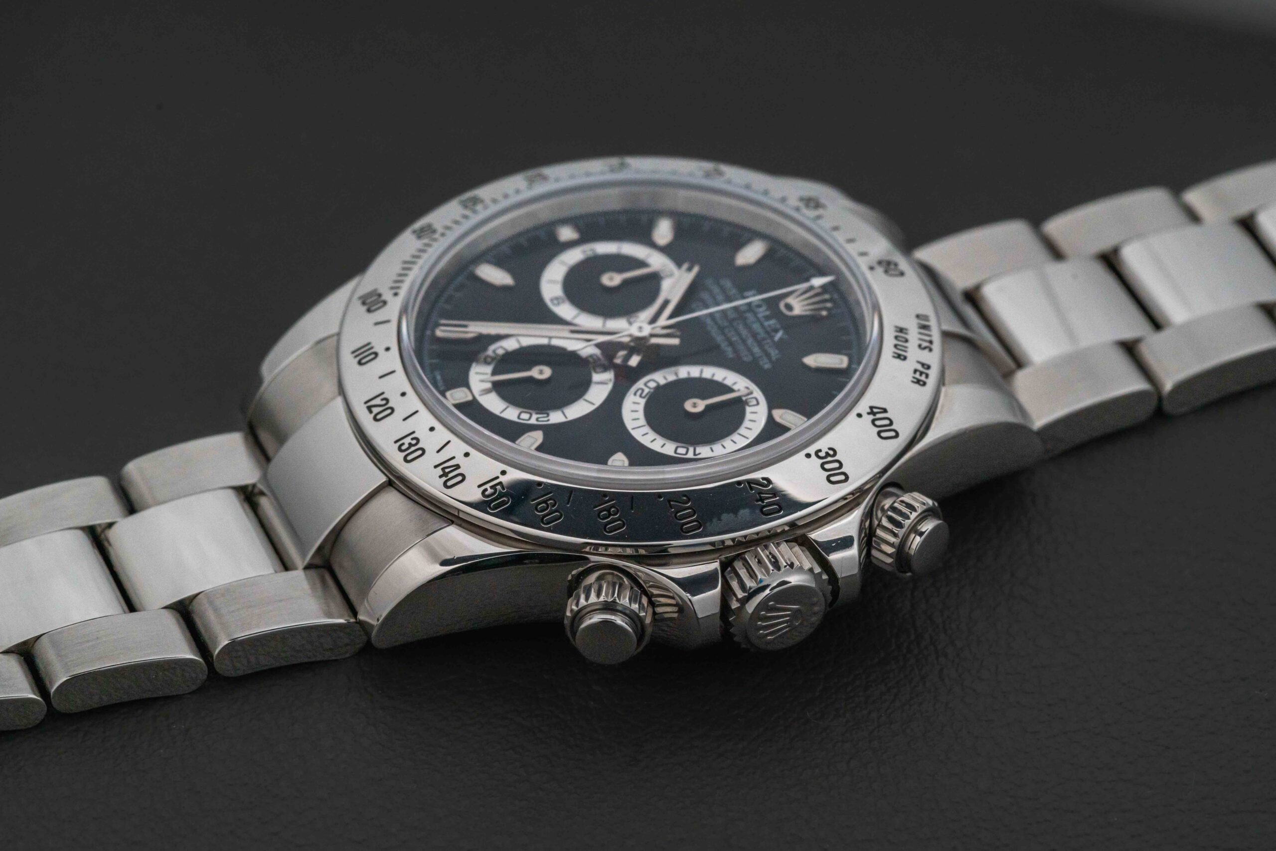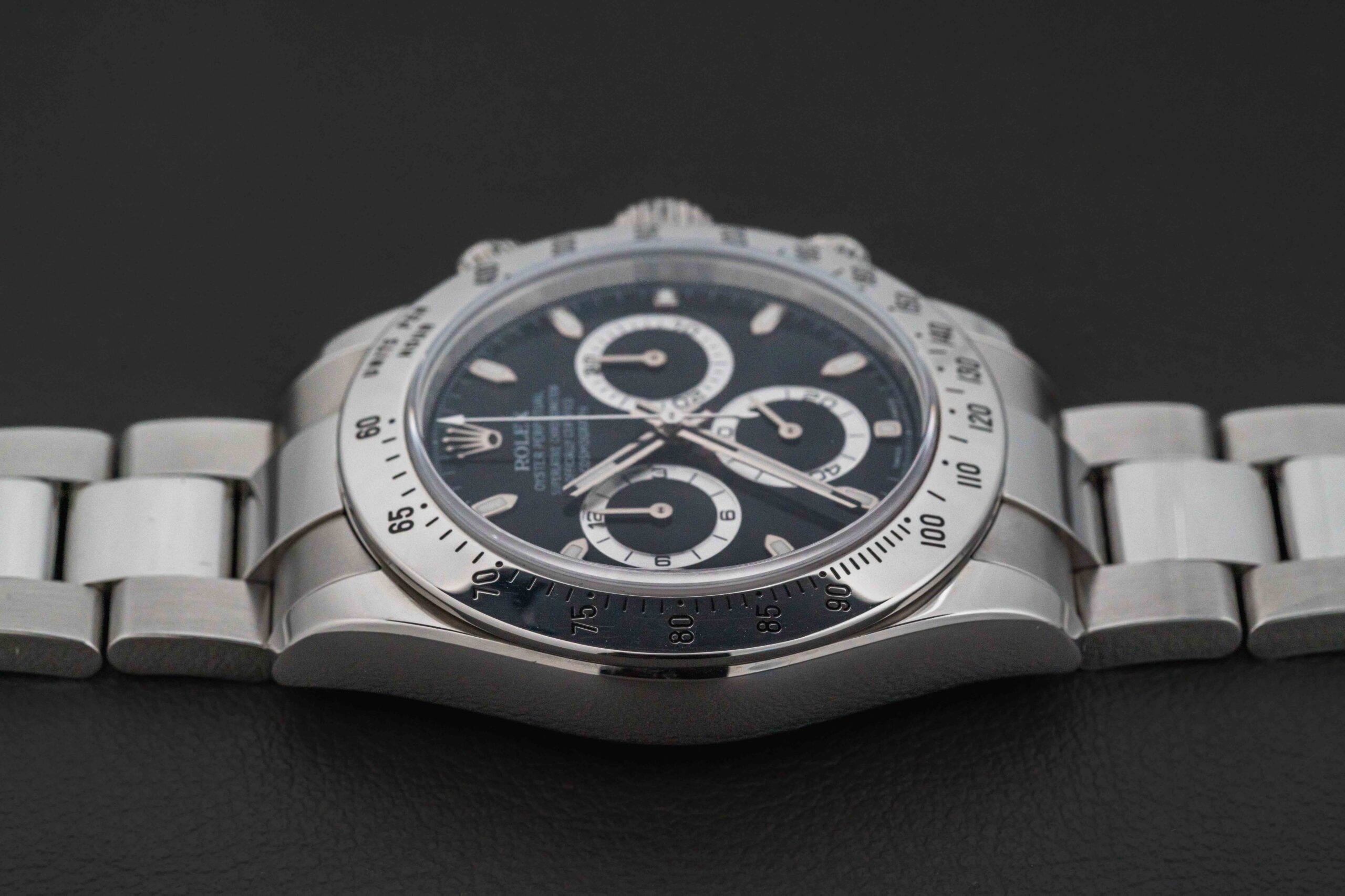 This Rolex Daytona is in great pre-owned condition. The case appears polished, with very light wear from use, and still retaining its original caseback sticker. The watch comes on its original Rolex Swiss 78490 bracelet, and has 11 full links with no stretch. Further, this Rolex Daytona comes with original Rolex box as pictured (no card).