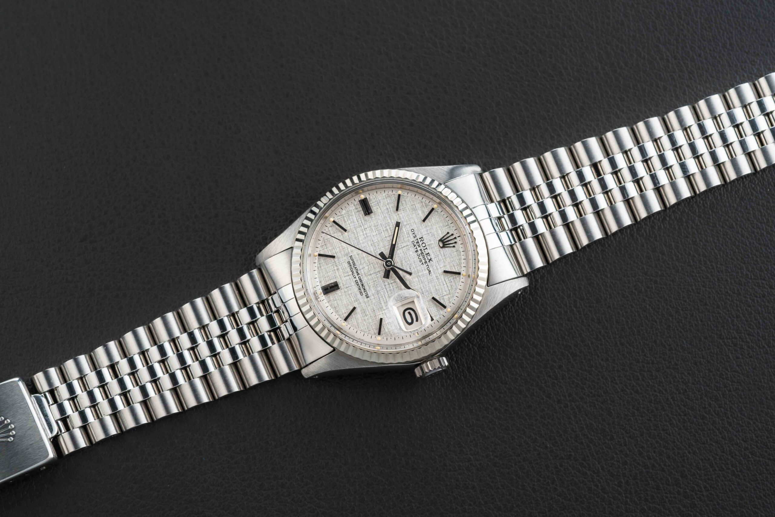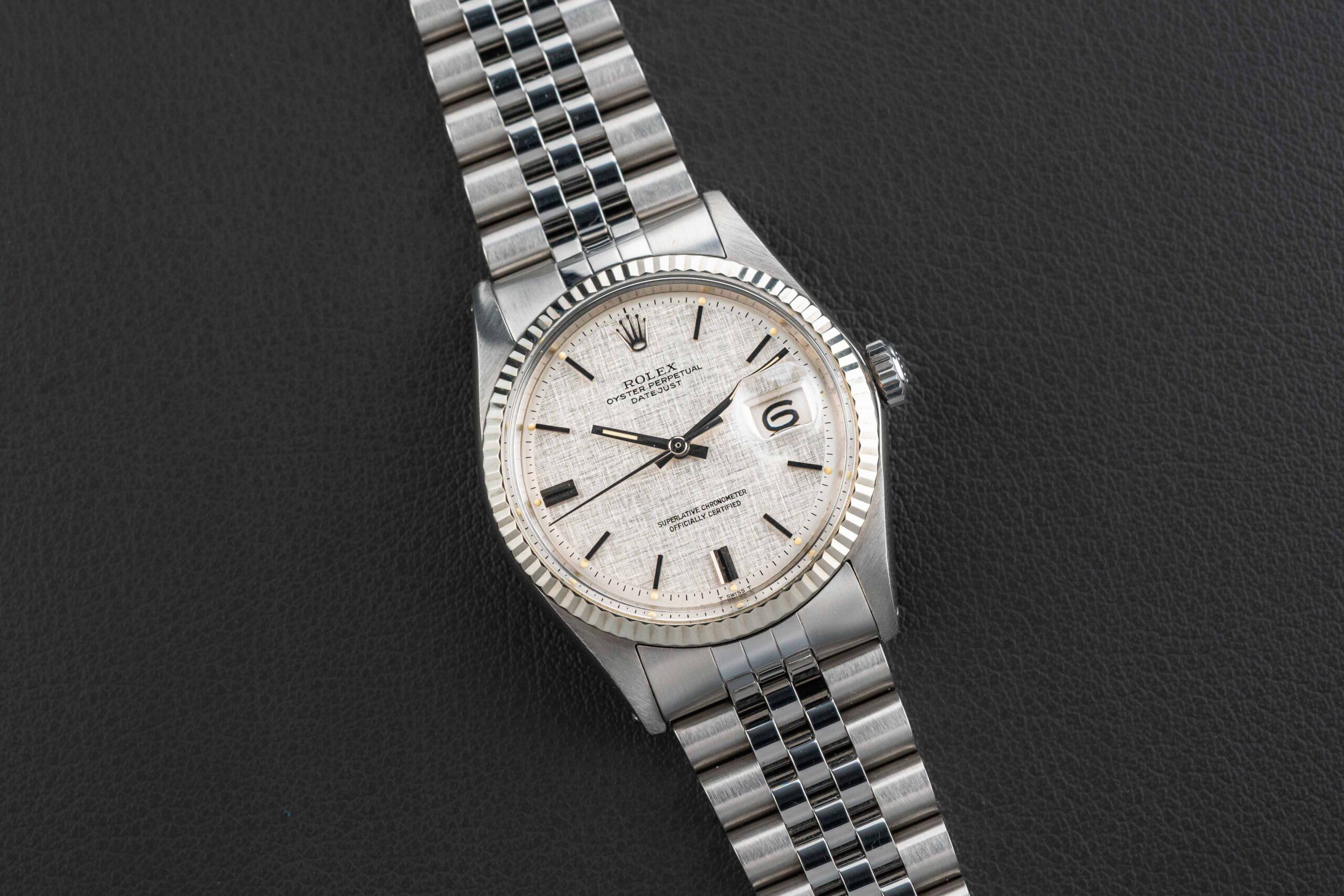 Up for grabs is a Rolex Datejust, Reference 1601, circa 1970, with a stunning “linen” dial, giving the watch a textured look. This Rolex Datejust example is in great condition, with a sharp and thick case, with nice and even lugs. The dial is flawless, with no damage whatsoever; further, the original tritium lume is present on both dial and hands, aged to a stunning yellow color. The watch comes fitted on a Rolex Swiss 62510H Jubilee band, with 555 endlinks, and has almost no stretch, and appears fully linked.