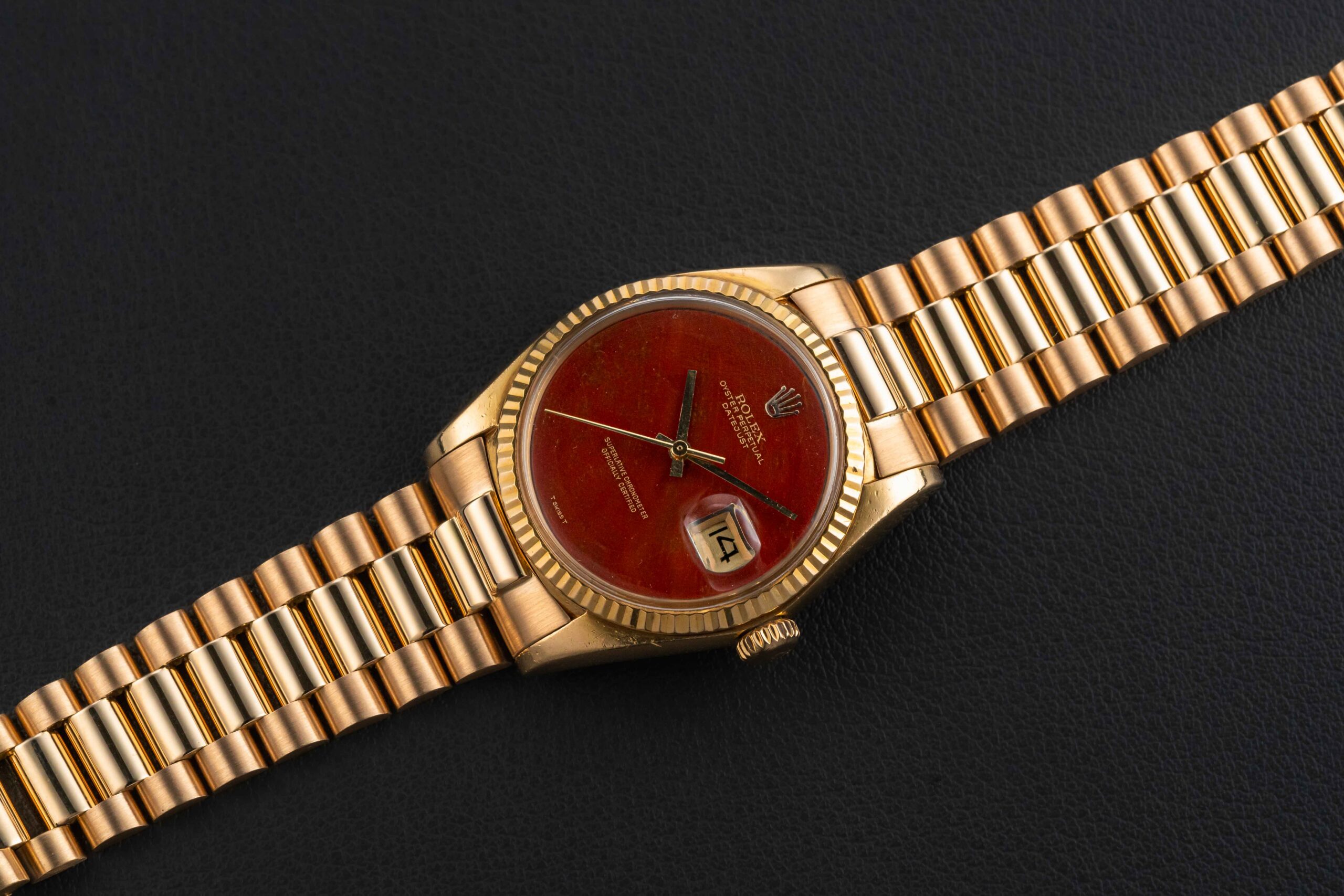 Up for grabs is one of the rarest stone dials that Rolex produced – the red Jasper stone. This rare stone was fit in a Rolex Datejust, reference 1601/8, housed in 18kt yellow gold, and produced circa 1972. The red Jasper is known as an “aggregate” gemtone, consisting of a mixture of quartz and chalcedony; while most Jasper stones are seen in green, with a much rarer variant seen with red.