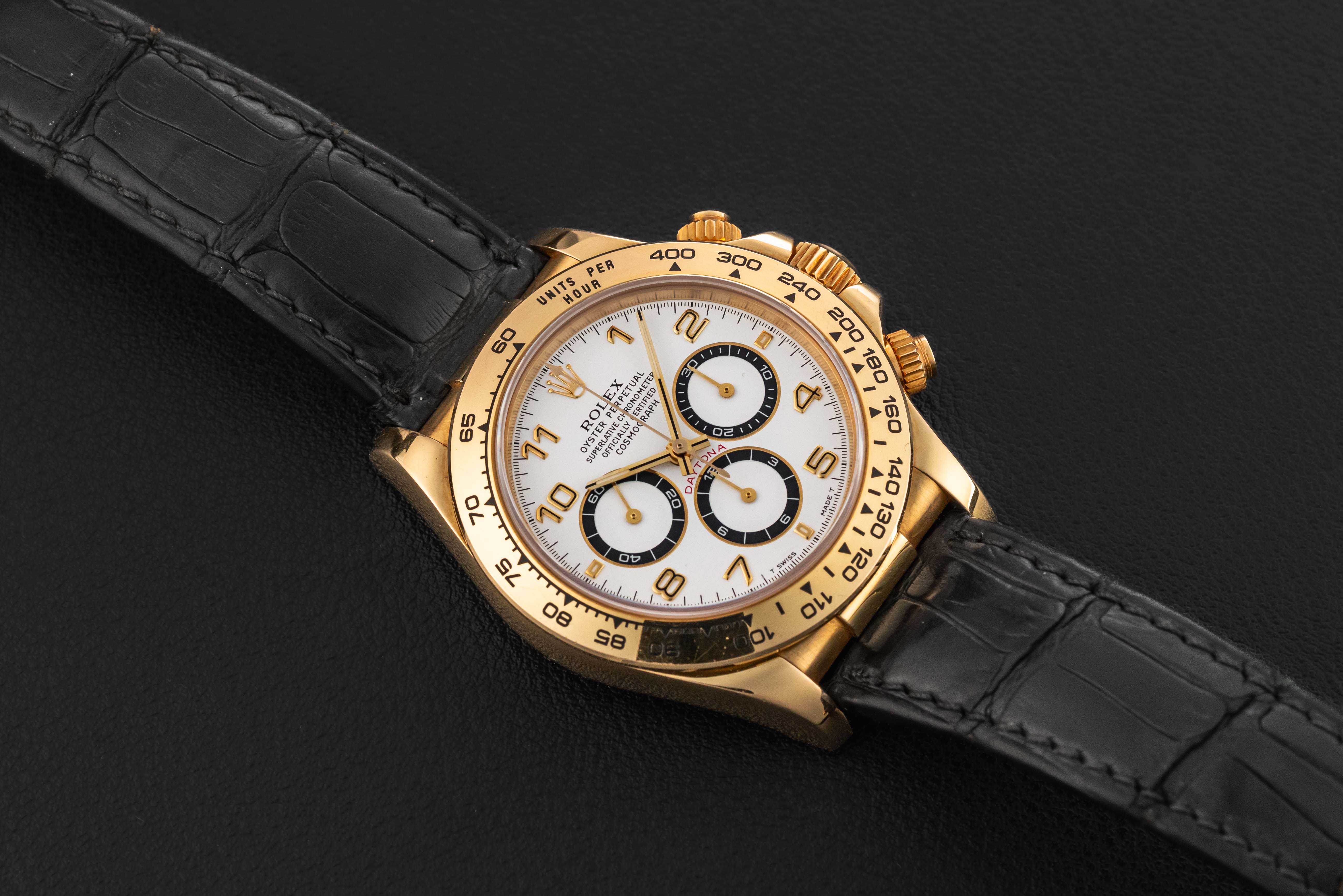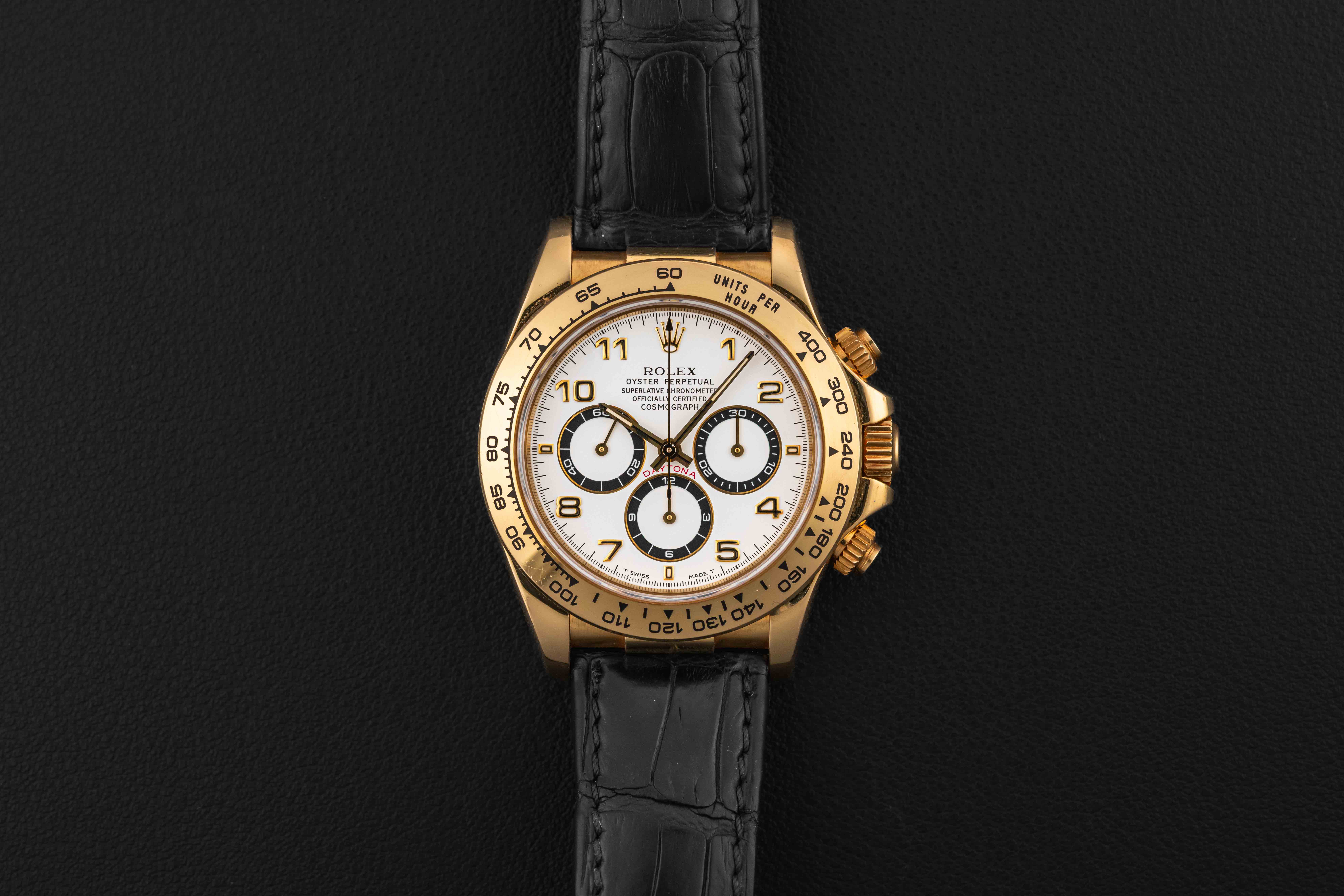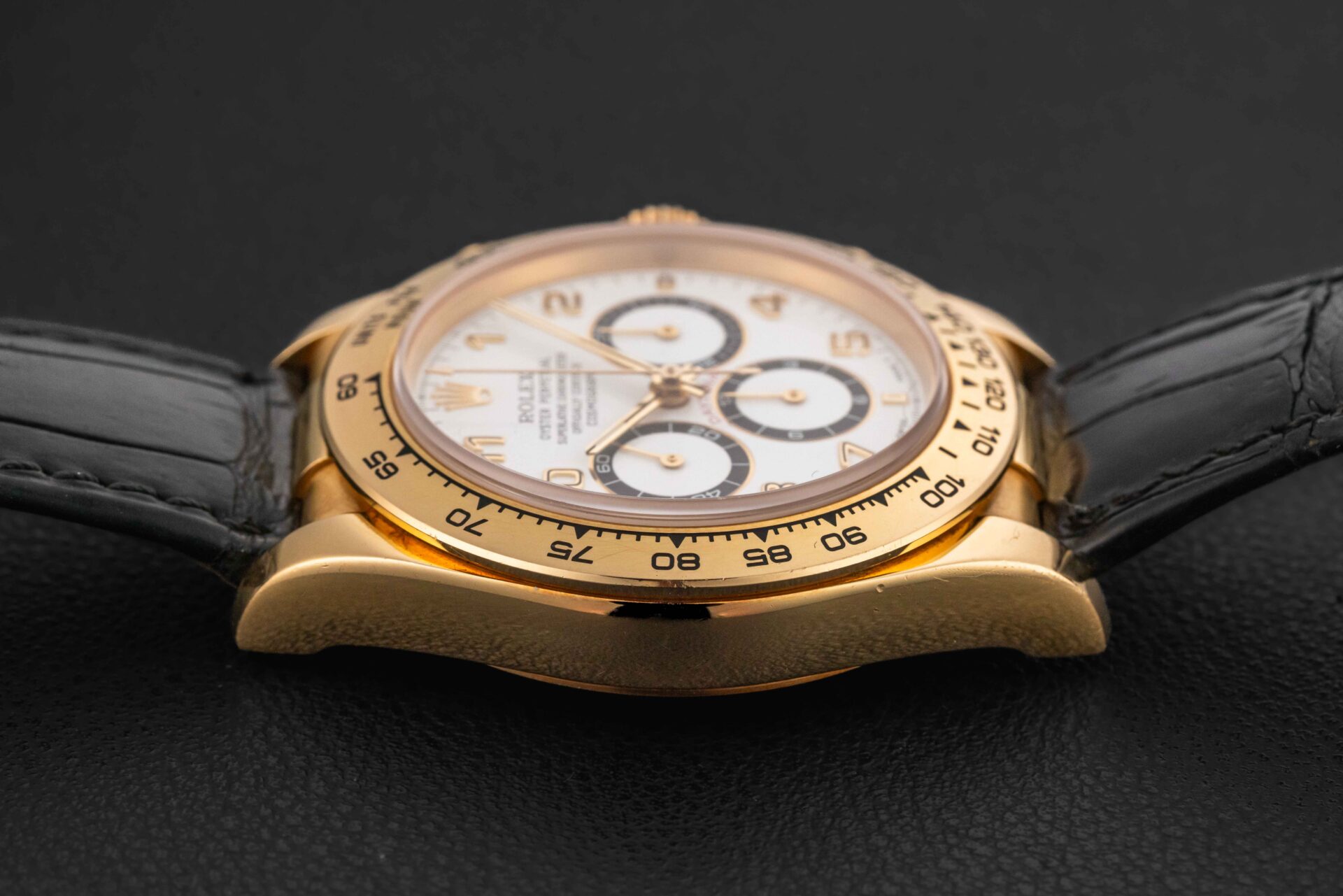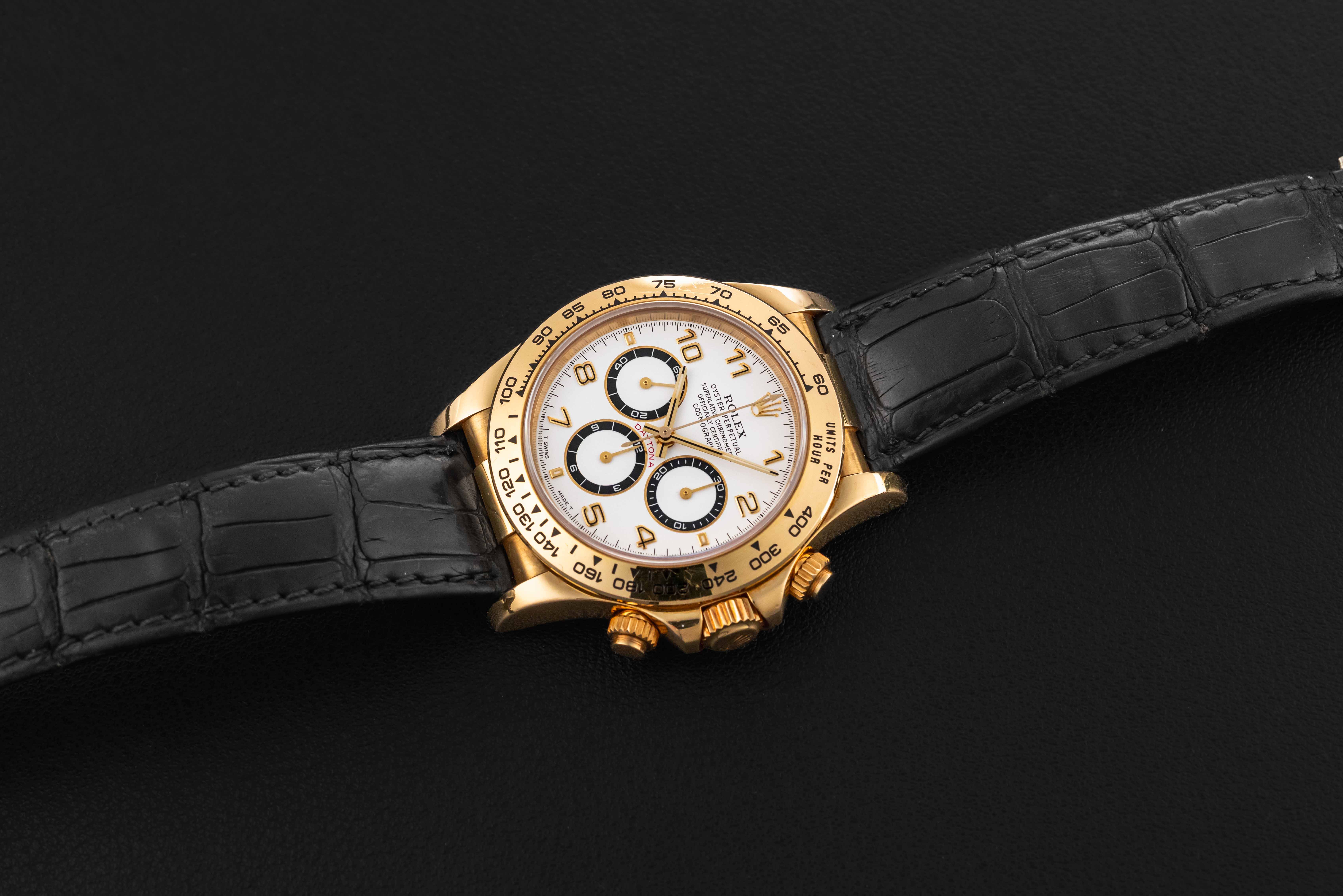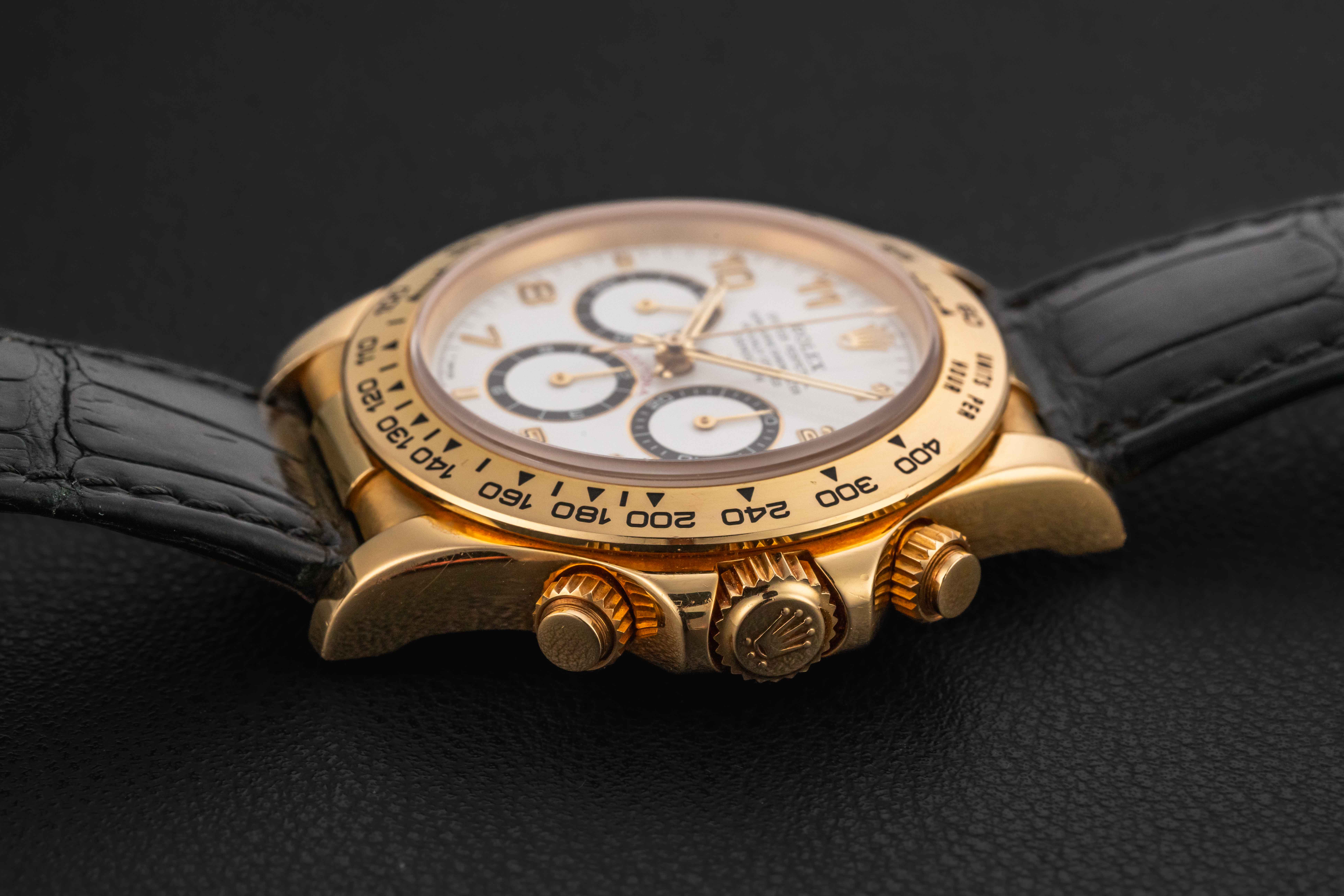 Offered here is a Rolex Daytona in solid 18kt yellow gold, circa 1999, reference 16518, powered by the legendary Zenith movement, caliber 4030. This particular Daytona dial variant is favored amongst collectors due to the black-panda registers. This solid gold Rolex Daytona is in nice vintage condition, with a strong case with thick and even lugs and no major scratches or dents. The watch comes with its original gold Rolex deployment buckle, and Rolex black leather strap.