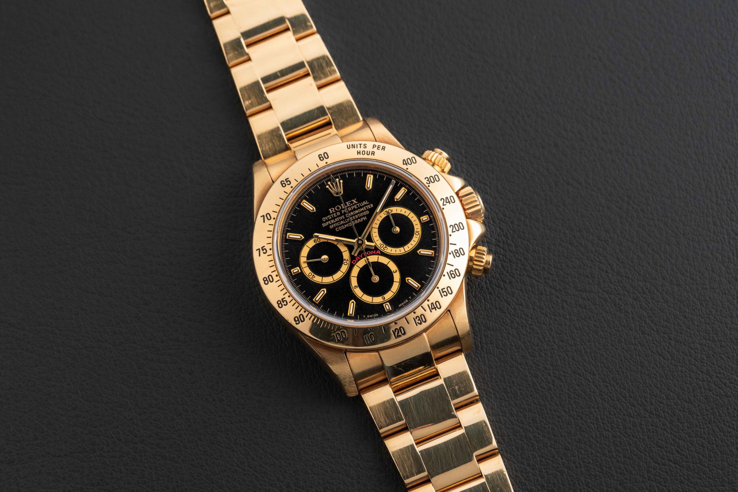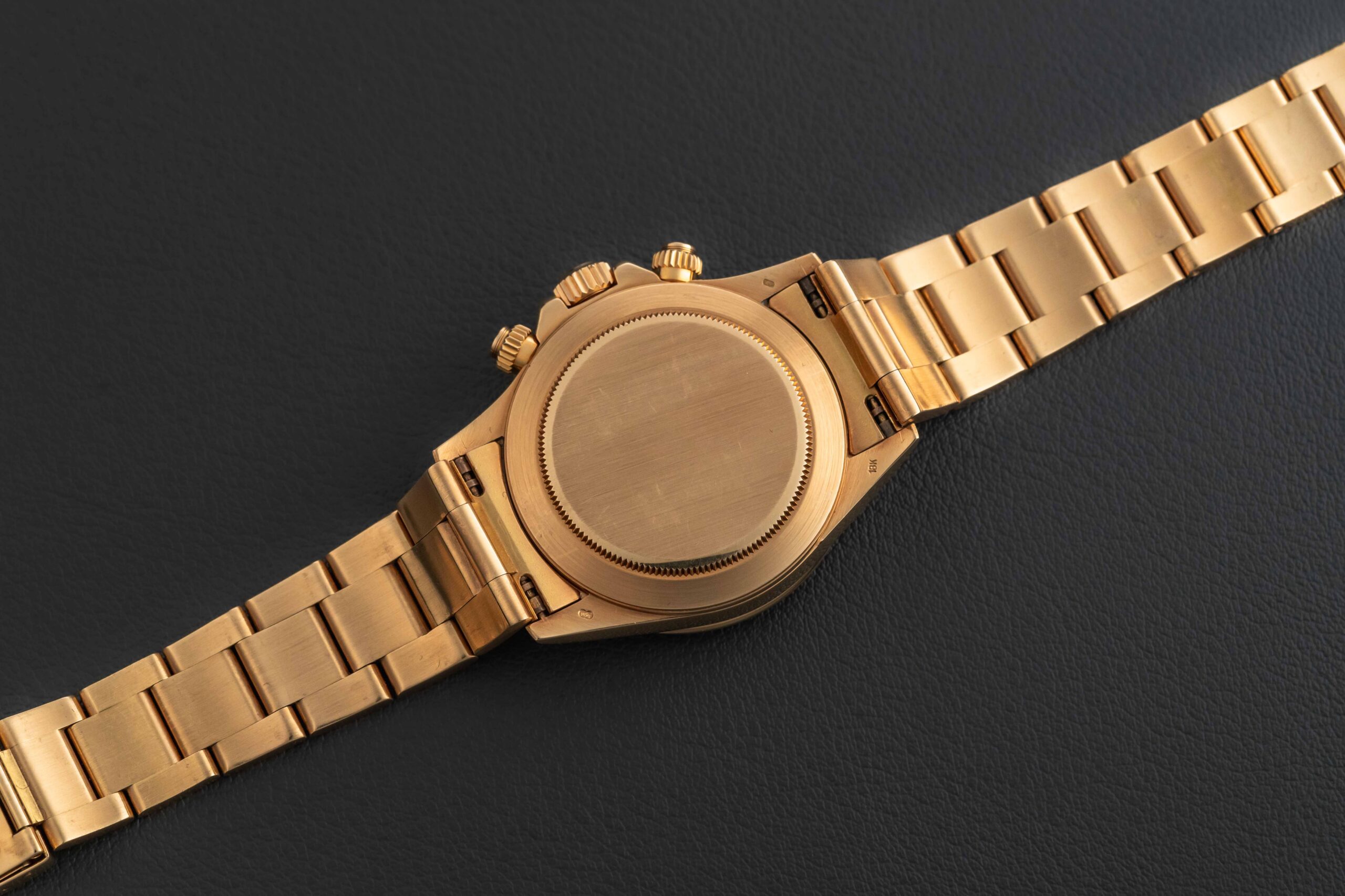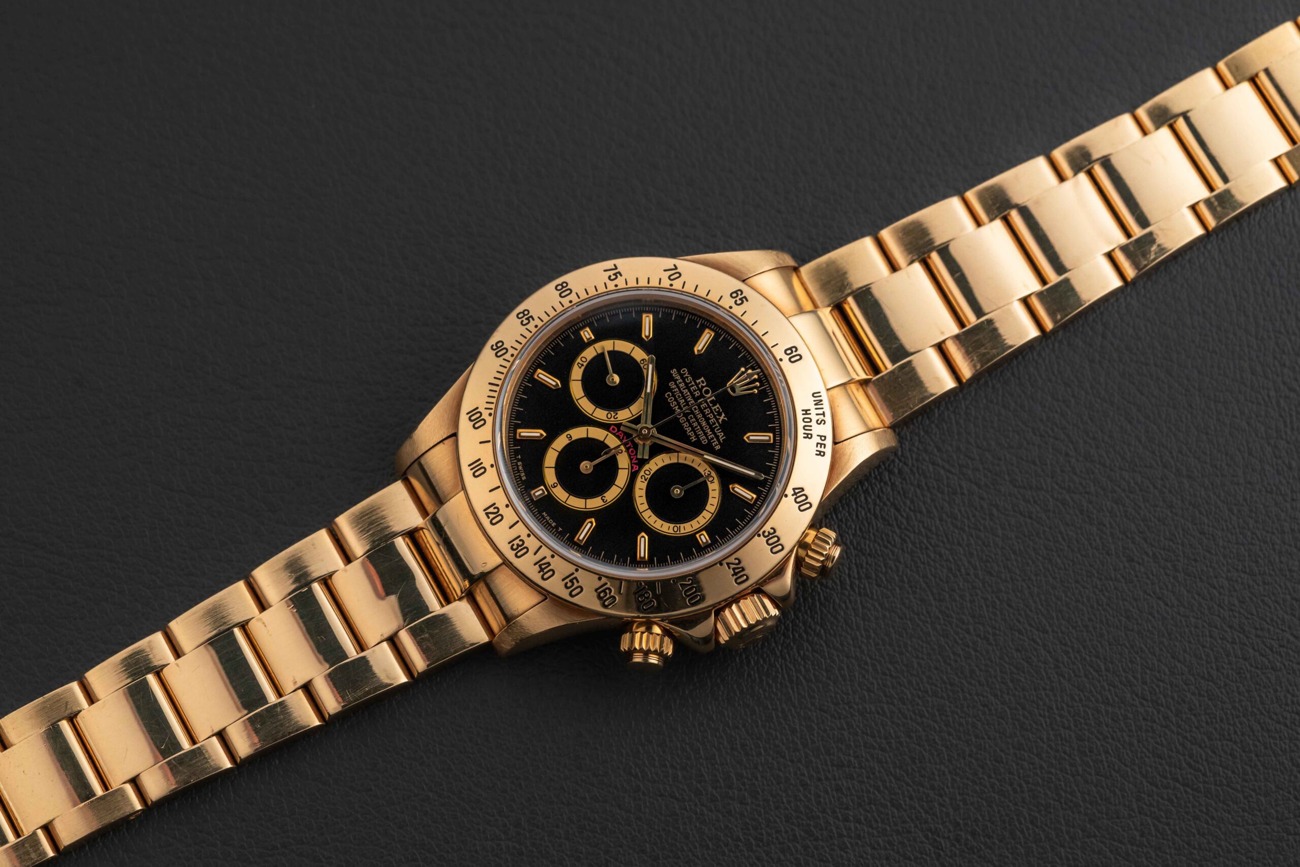 This Rolex Daytona is in great vintage condition. The case is unpolished and sharp, with light wear from use over the years. The dial is in mint condition, with no flaws or marks. Likewise, the original tritium lume is present on both dial and hands, aged to a lovely yellow. The bezel shows no detail/color loss. The gold Rolex Oyster 78668 bracelet has 12 full links and no stretch.