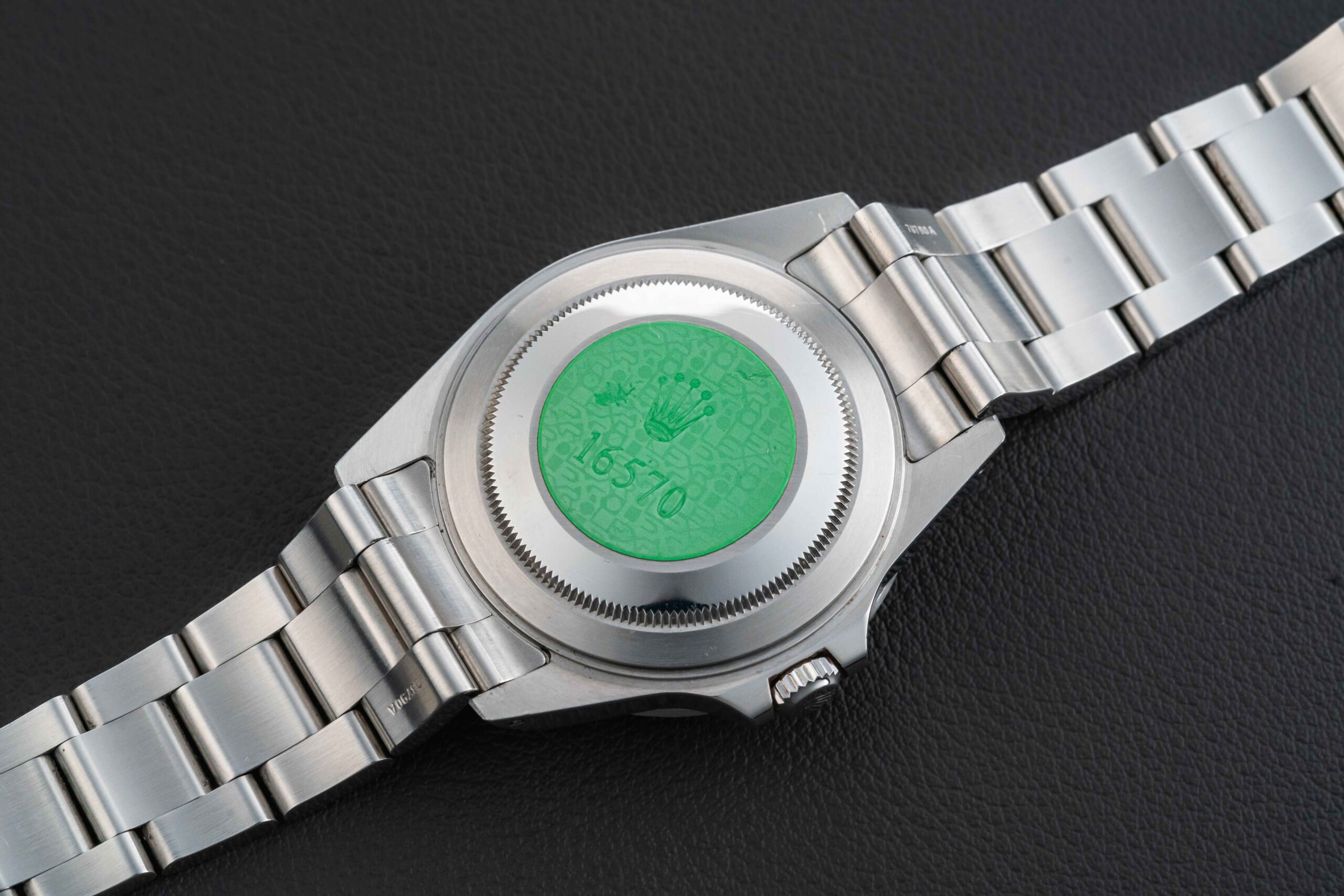 Up for grabs is an incredible Rolex Explorer II, circa 200, Reference 16570, with black dial. The reference 16570 is transitional from the Explorer II, reference 16550, with an upgraded movement. This Rolex Explorer II is in excellent condition. The case is unpolished with sharp bevels, with light wear from use, and still with its original and crisp caseback sticker. The dial is immaculate, with no marks, scratches, or flaws. Further, the original lume is present on both dial and hands, with no loss. Lastly, the watch comes fitted on a Rolex Oyster SEL 78790A bracelet, and has 12 full links with no stretch.