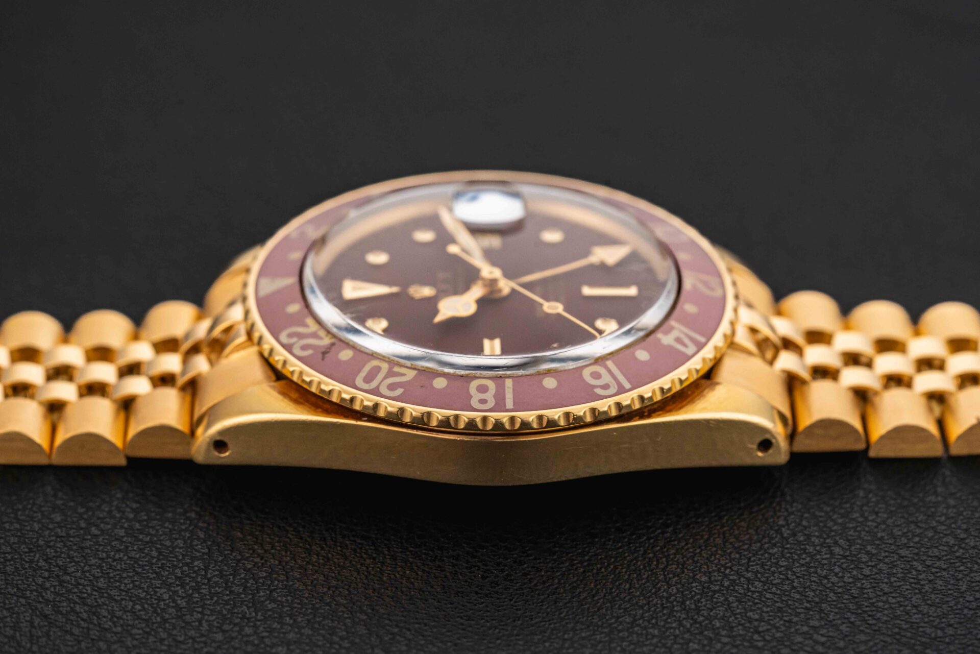 The condition on this Rolex GMT-Master is great. The case has likely been lightly polished in the past, showing thick and even lugs, and original beveled edges still prevalent. The original maroon dial shows no major flaws or chips. In similar fashion, the watch retains its original tritium lume on both dial and hands, aged to a golden yellow color on the dial, and a slightly lighter shade in the hands. Further, the watch retains its original all-brown GMT-insert, aged with a lovely fading set in.