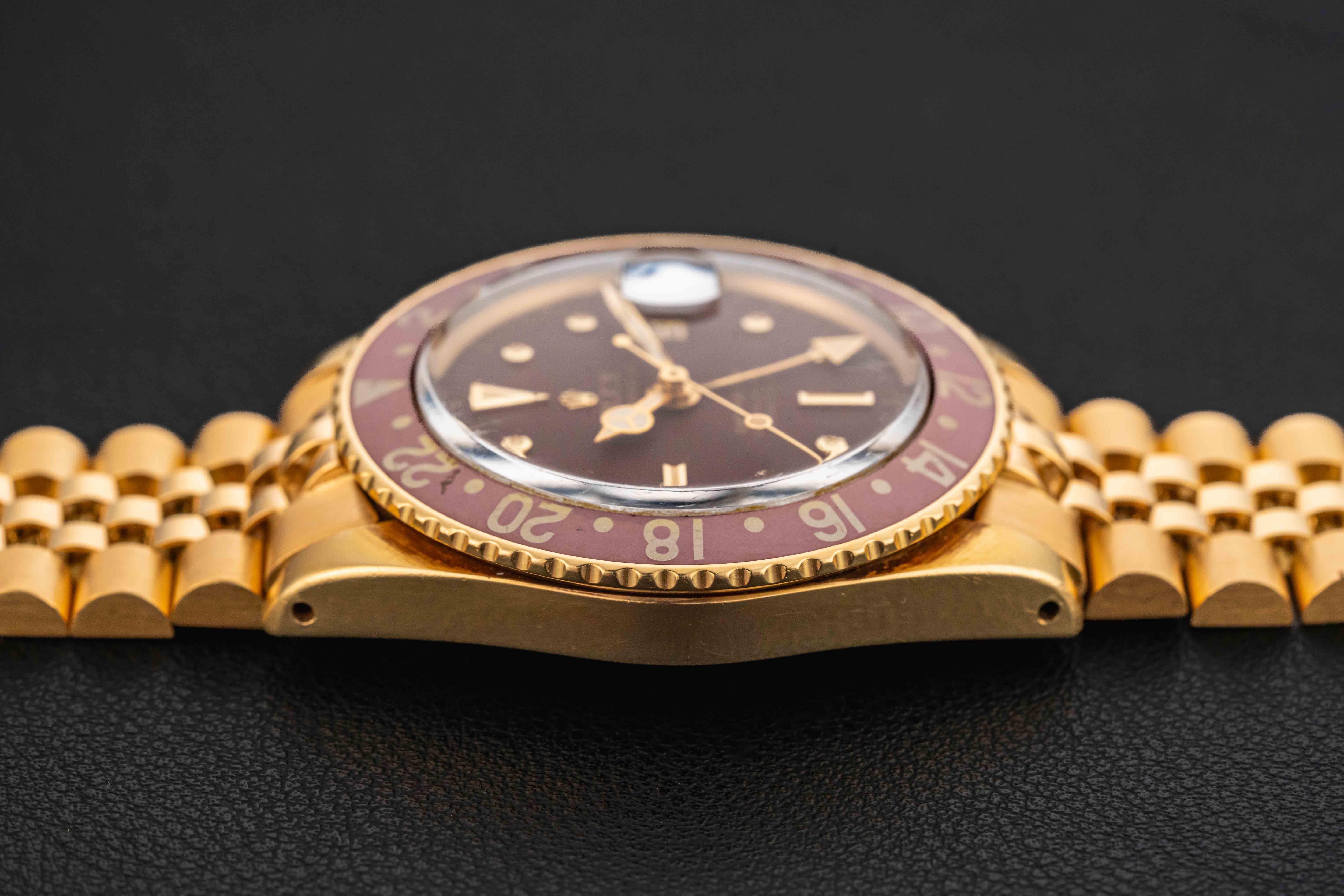 Offered here is a lovely and rare Rolex GMT-Master, reference 1675/8 in 18kt yellow gold, circa 1970 (2.8m serial). The 1675/8 is the second iteration of the all-gold GMT-Master, following its introduction in the late 1950s in the reference 6542.
