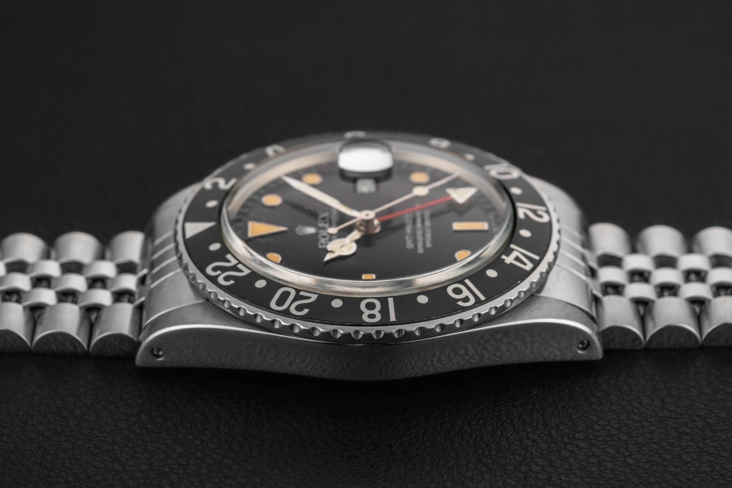 This Rolex GMT-Master is in excellent vintage condition. The case appears lightly polished, still very sharp, with original beveled edges visible. The dial is in great condition, with no chips, scratches, or spidering. The original tritium lume, present on both the dial and hands, aged to a vibrant orange color, slightly paler in the hour and minute hand, albeit original.