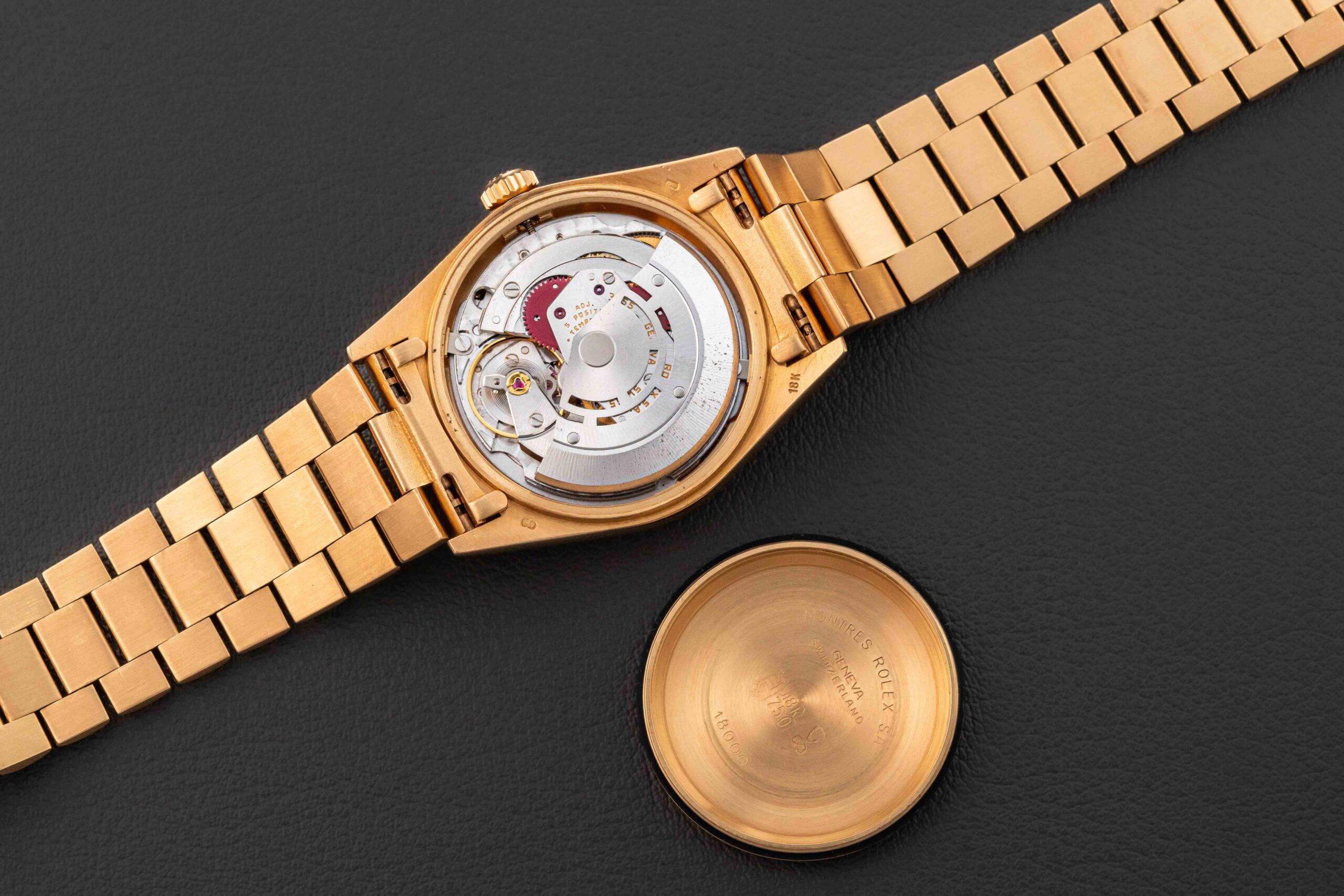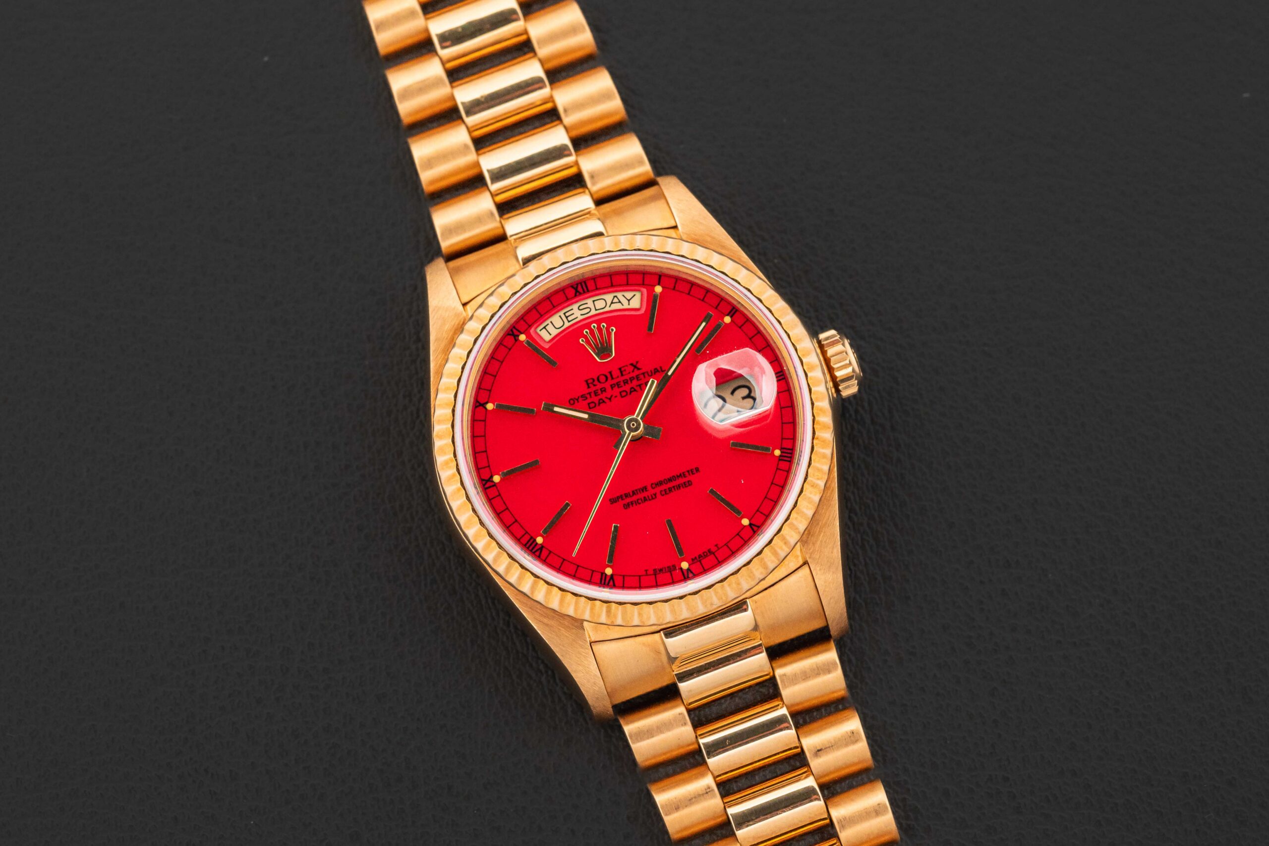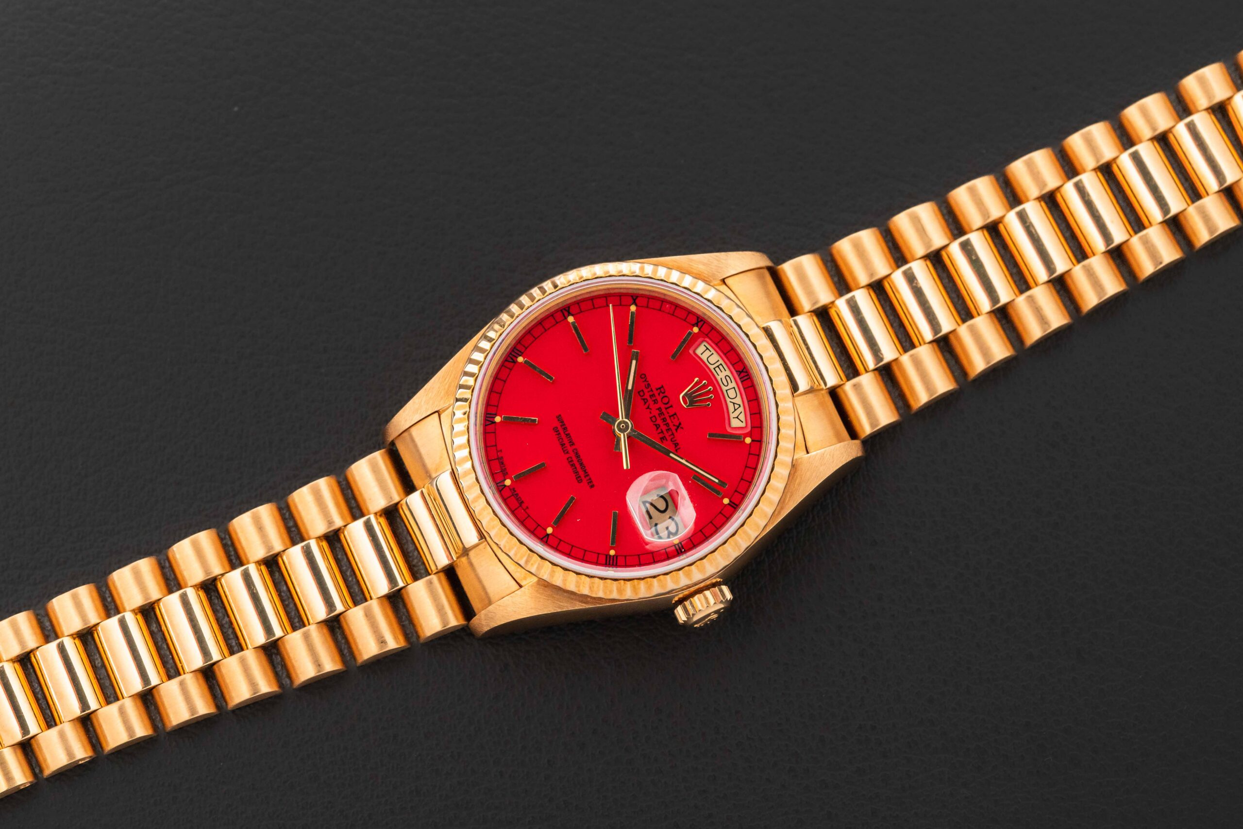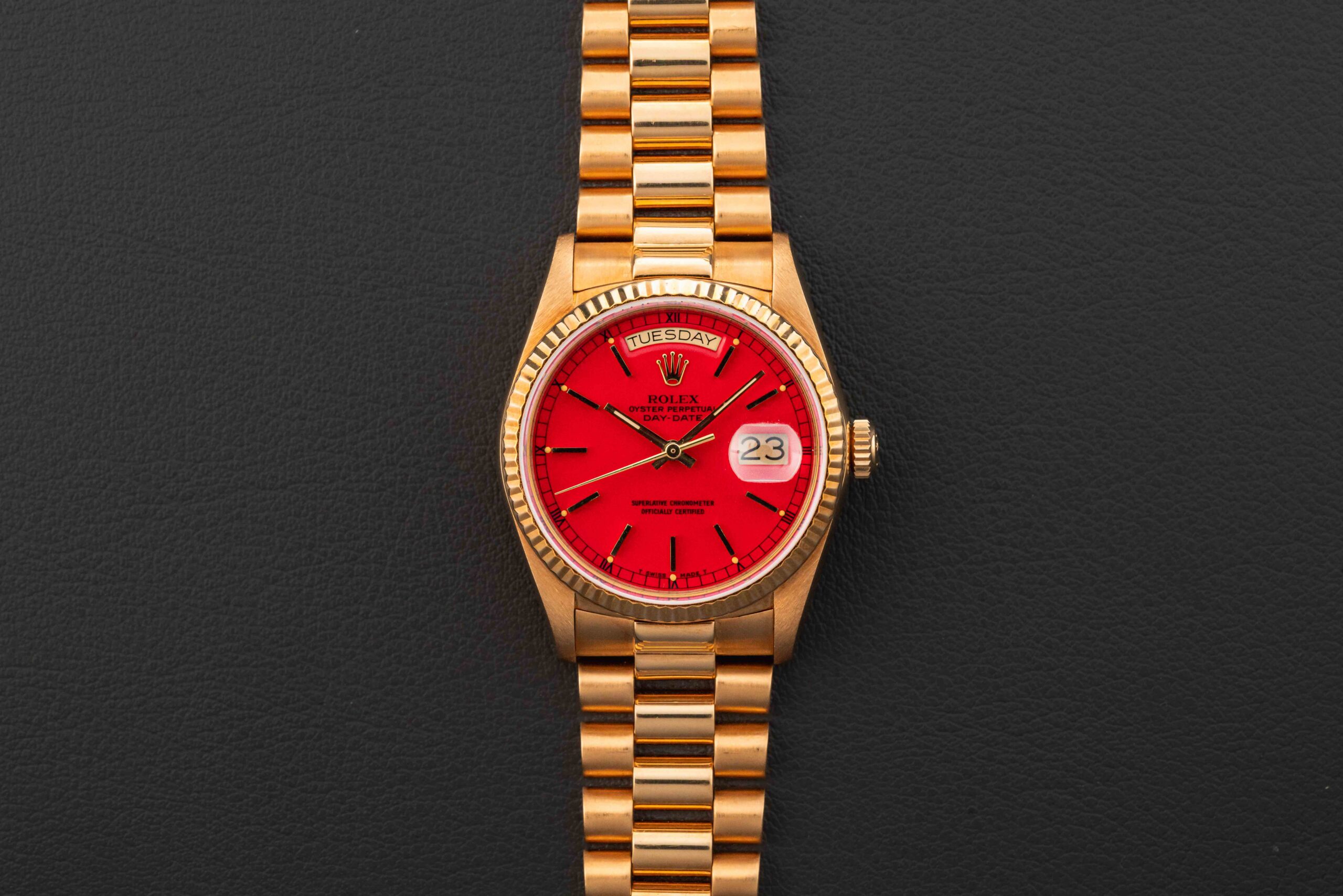 Up for grabs is an exceptional and highly desirable Rolex Day-Date, reference 18038, circa 1985, fitted with a very rare red-raspberry “Stella” dial. The “Stella” lacquer dials were first introduced by Rolex in the 1970s, allegedly developed for Asian and Middle Eastern markets. It appears they produced two different shades of red for the Stella, as the traditional red Stella dial is distinctly darker, and the present example has a more brighter color with purple hues in the color. This particular Rolex Stella-dial Day-Date is in excellent vintage condition, with a sharp and thick case, perfect dial (with no flaws to the lacquer), and perfect original tritium lume on both dial and hands, aged to a lovely yellow color. The original Rolex presidential bracelet is in great condition with no stretch, and has three removable links, fitting an approximate 7″ wrist.