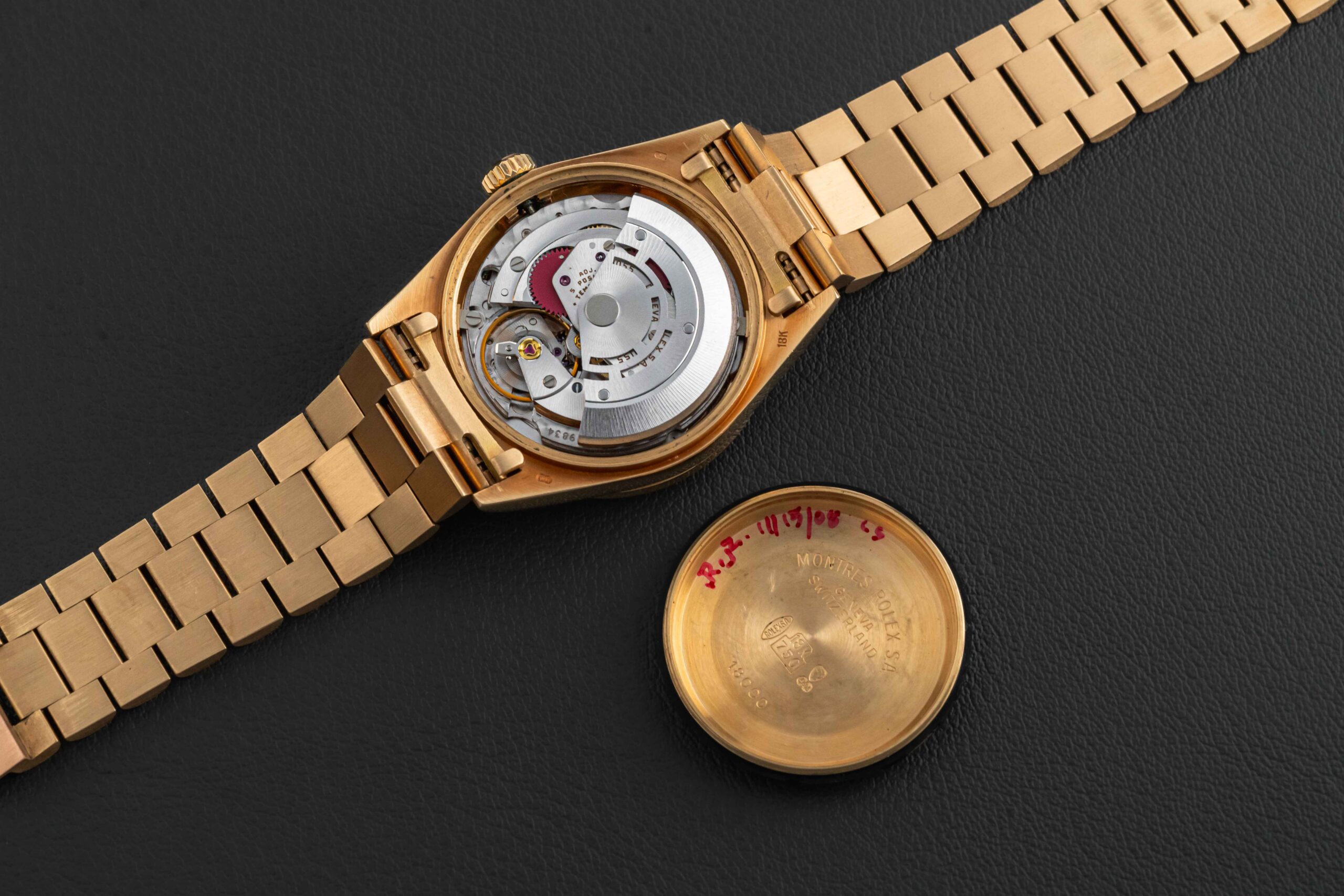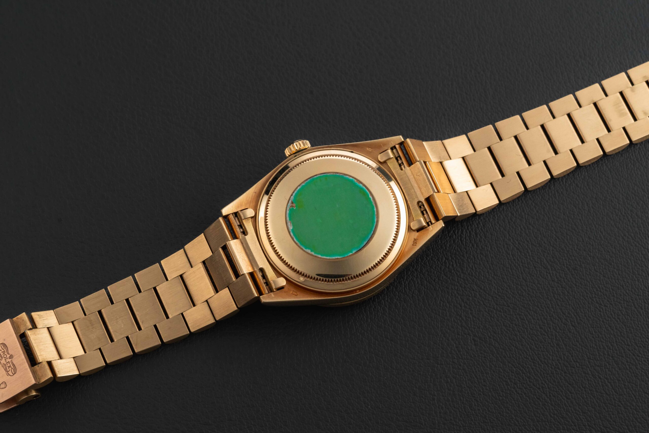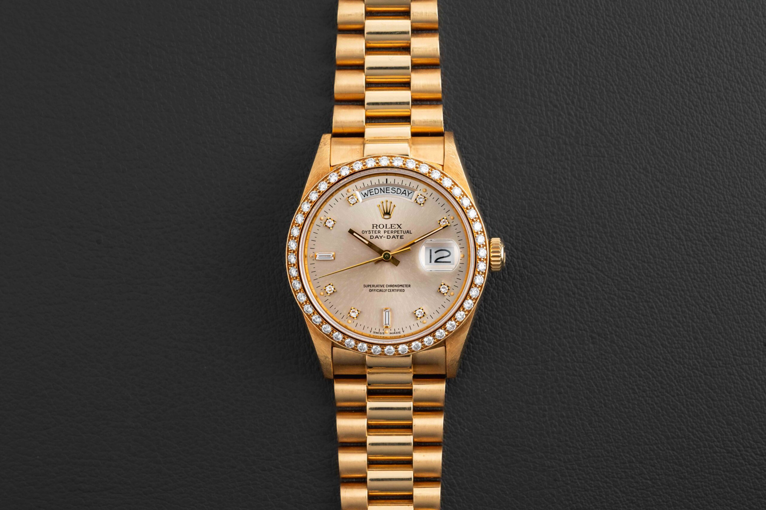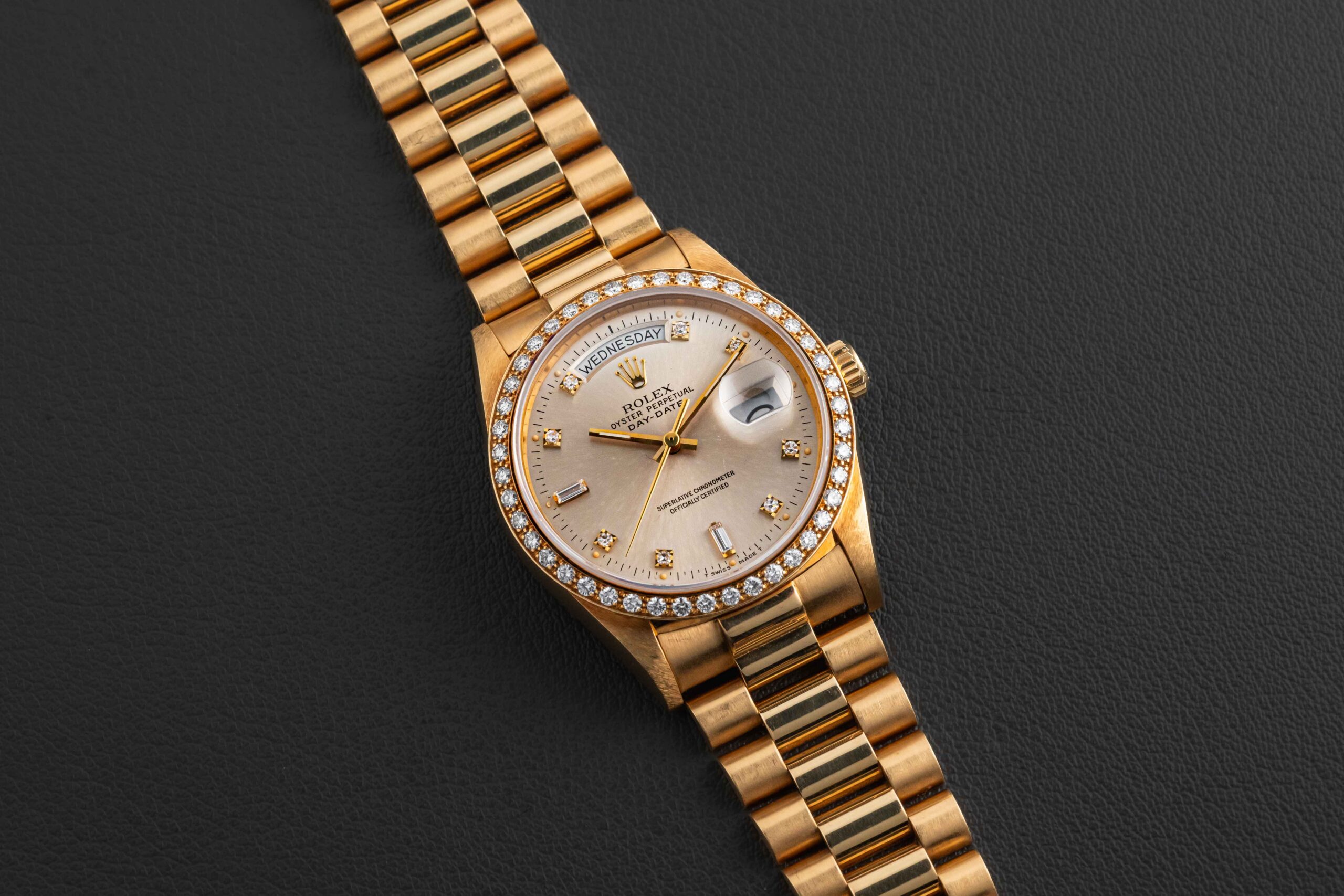 Offered here is a Rolex Day-Date, circa 1986, reference 18048, in 18kt yellow gold. The reference 18048 was made by Rolex with a factory diamond bezel and dial. This particular Rolex Day-Date is in excellent vintage condition, nearly unused. To start, the case is razor sharp and unpolished, still retaining its original caseback sticker. Likewise, the champagne dial is flawless, and the original tritium is still present on both dial and hands, aged to a nice yellow color. The watch comes fitted on its original Rolex Presidential hidden-clasp bracelet, with no stretch, and will fit an approximate 7.5″ wrist (6 removable screws).