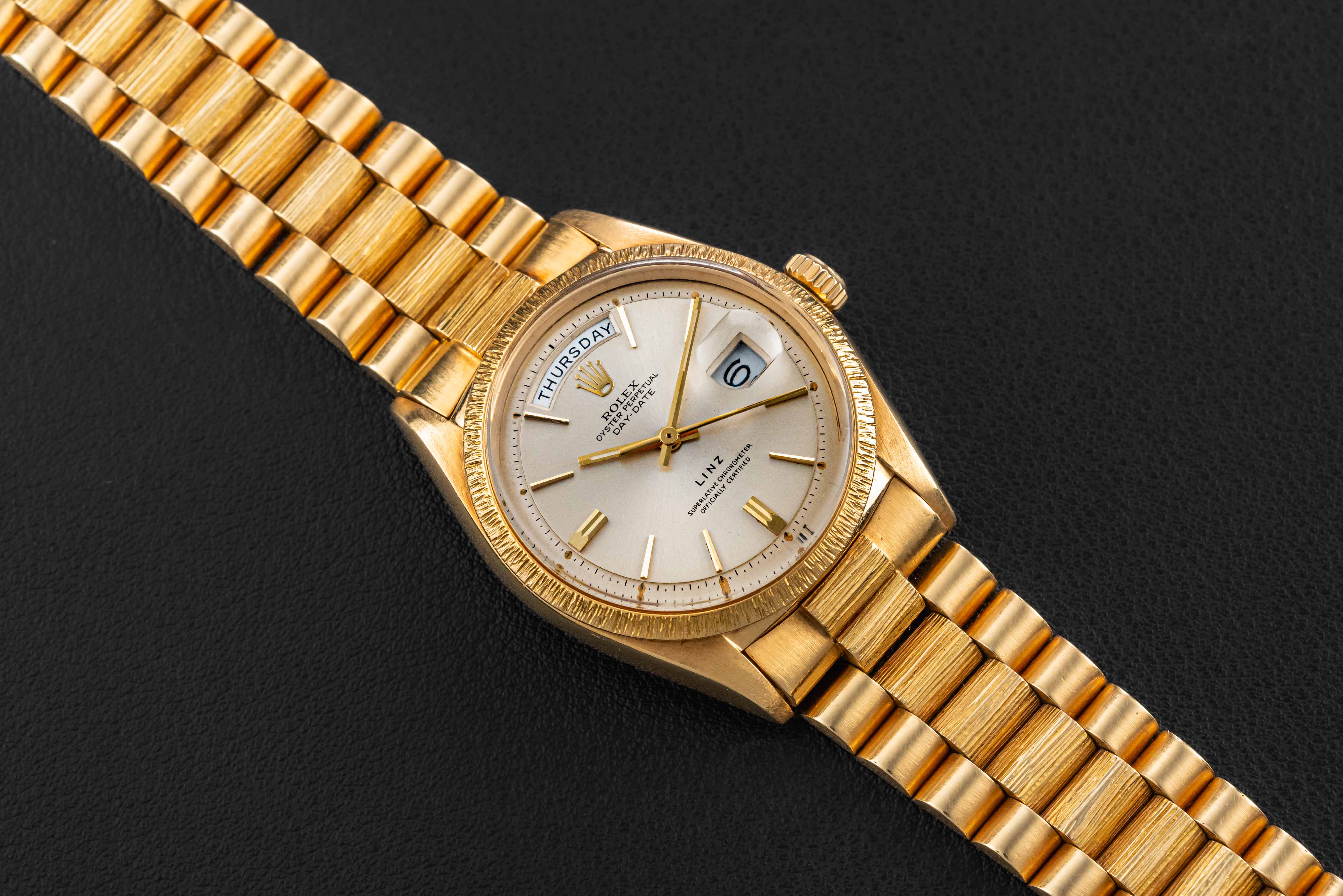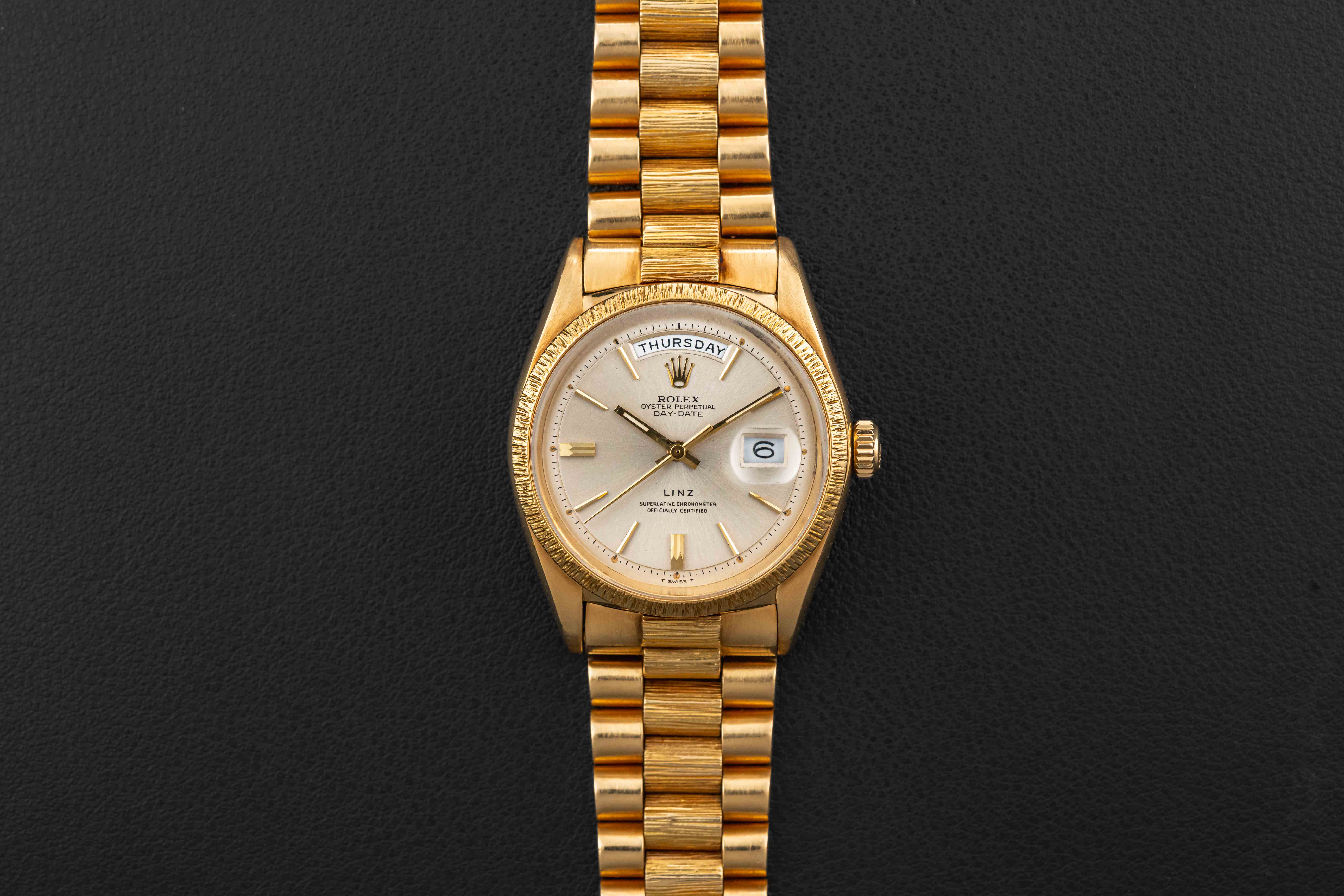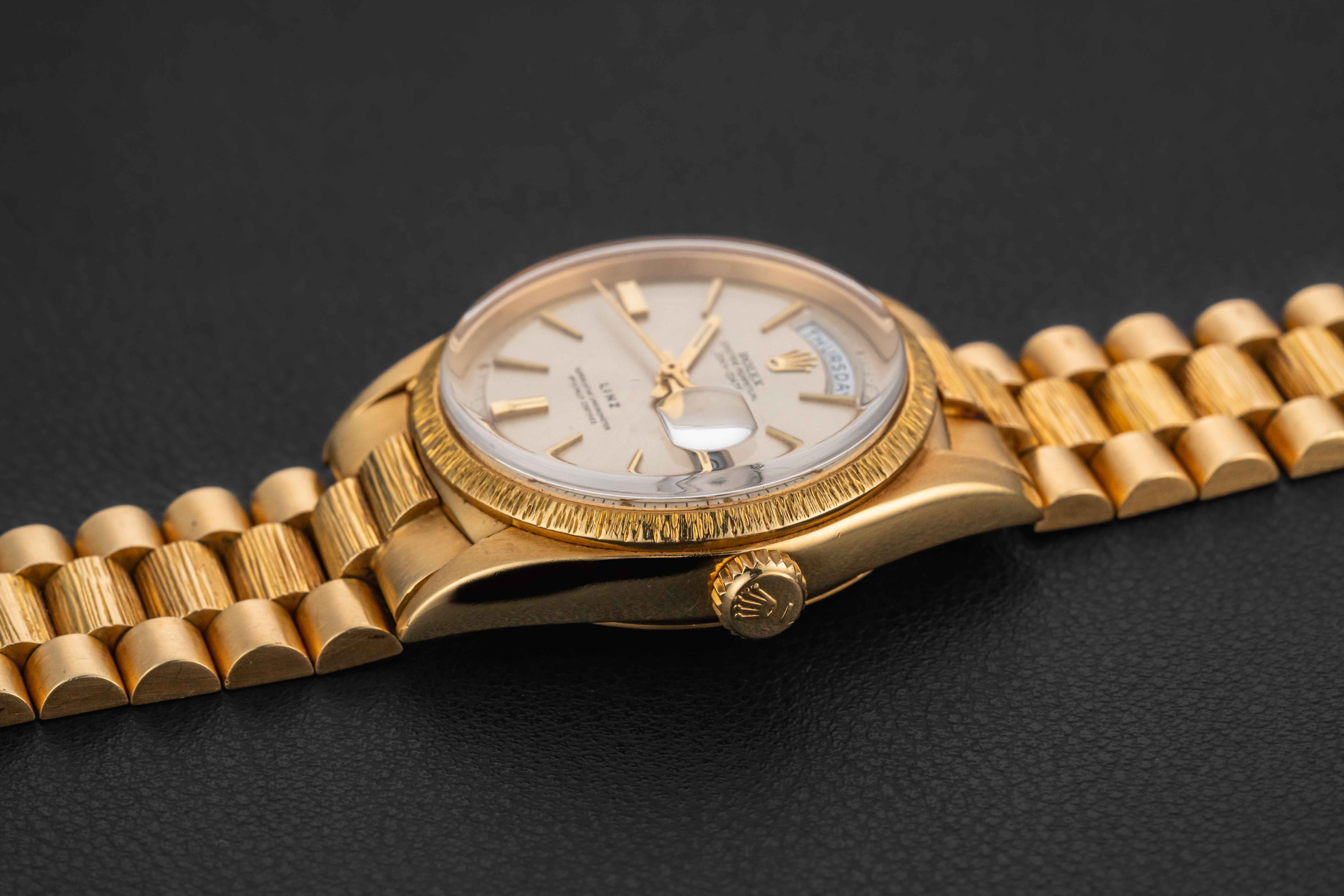 This is a very rare example of a Rolex Day-Date in 18kt yellow gold circa 1966, with a silver dial, bearing the reference 1807, which was a specific reference of Day-Date for the “bark” finish cases. However, what sets this particular Day-Date apart is the fact that it was co-signed for the Texas-based retailer “Linz”, a storied jewelry outfit founded in 1877, and retailer of Rolex products during the 1950-1970 era.