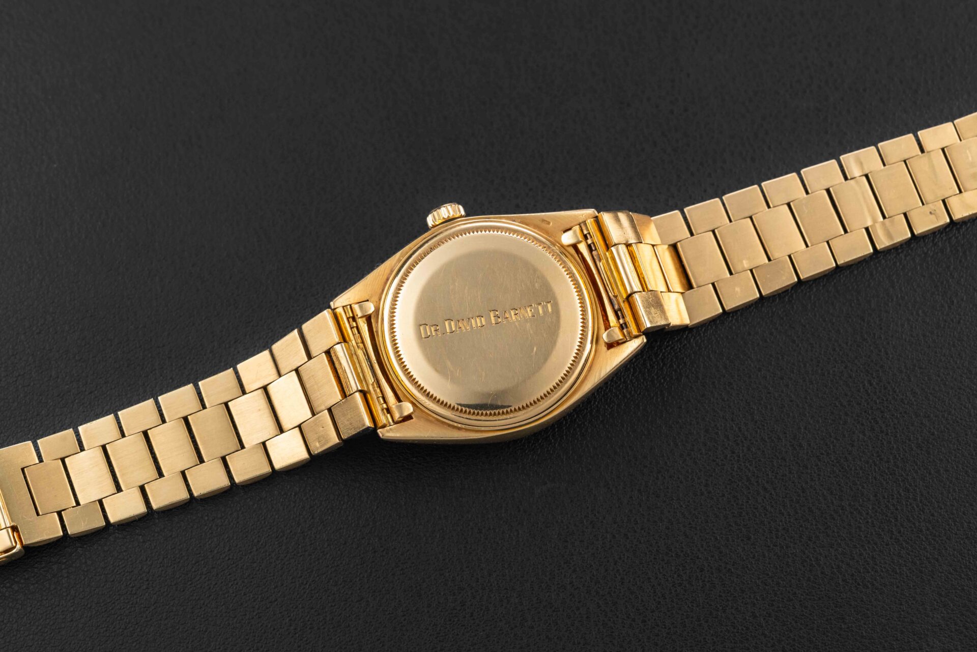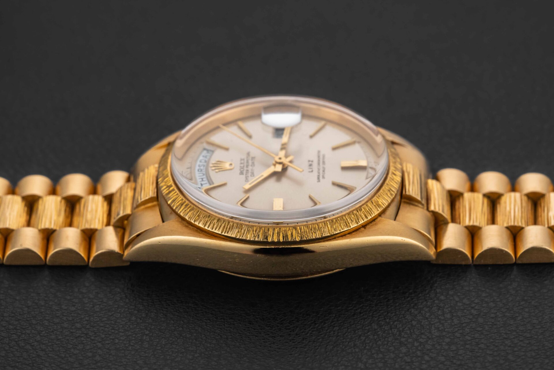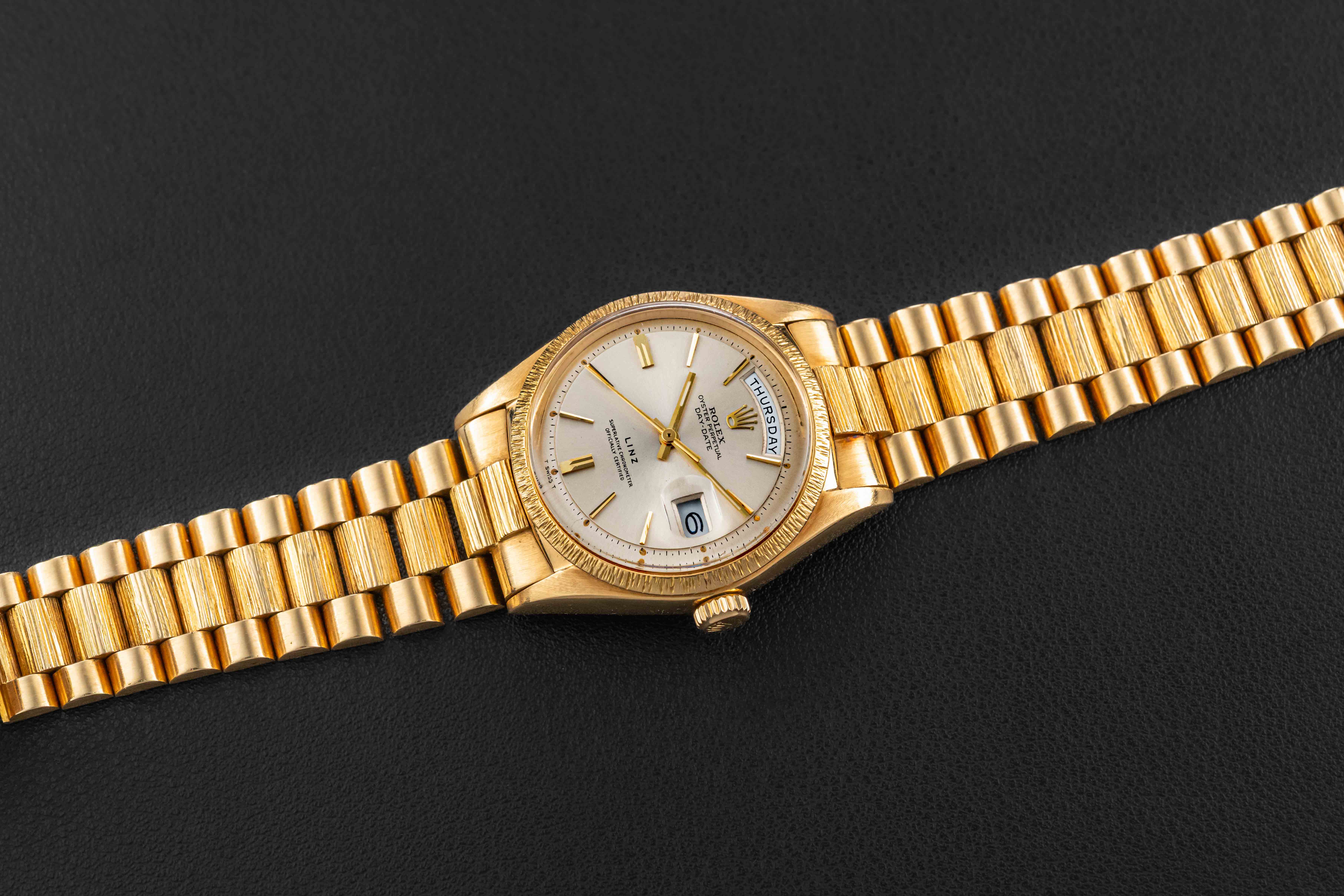 This is a very rare example of a Rolex Day-Date in 18kt yellow gold circa 1966, with a silver dial, bearing the reference 1807, which was a specific reference of Day-Date for the “bark” finish cases. However, what sets this particular Day-Date apart is the fact that it was co-signed for the Texas-based retailer “Linz”, a storied jewelry outfit founded in 1877, and retailer of Rolex products during the 1950-1970 era.