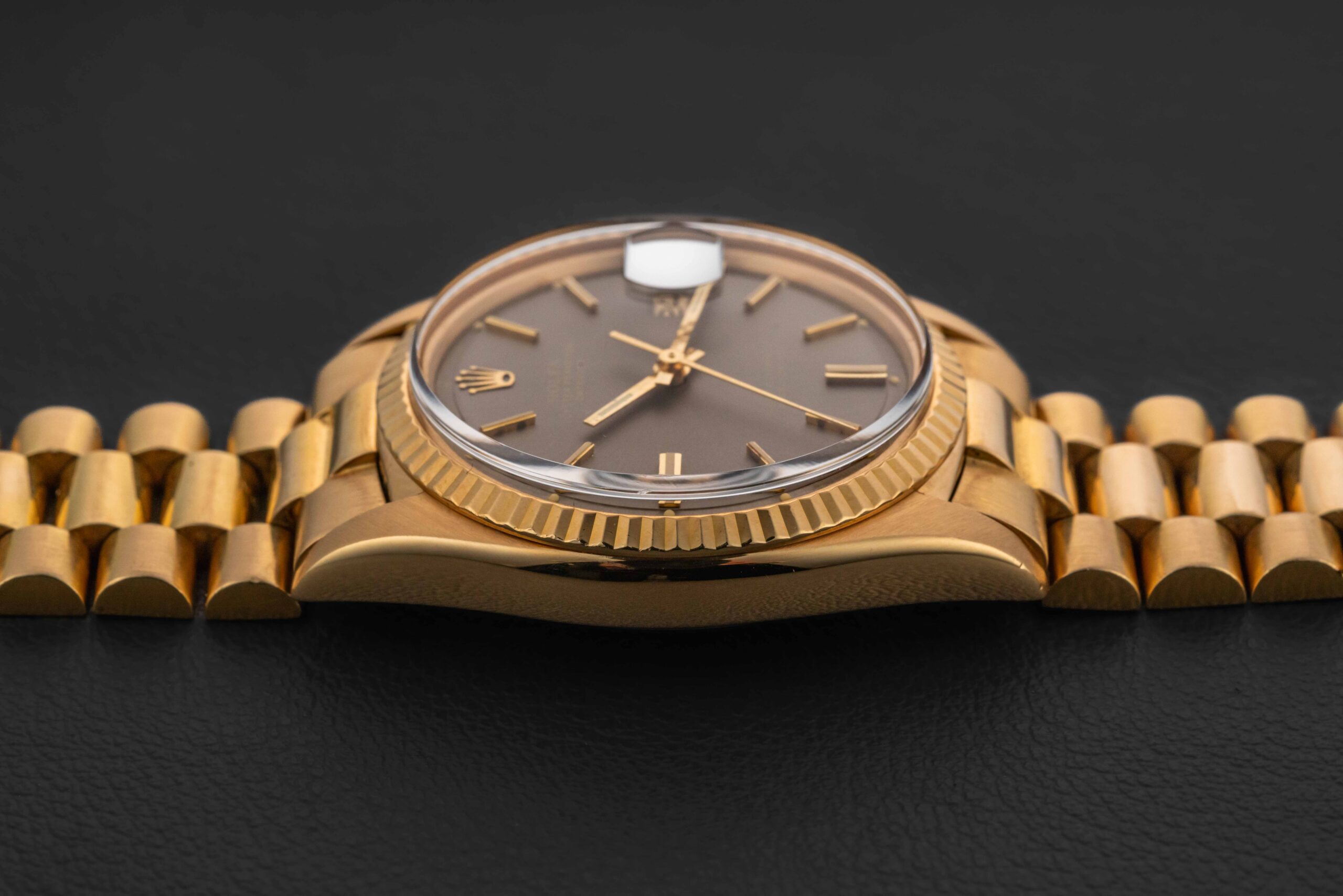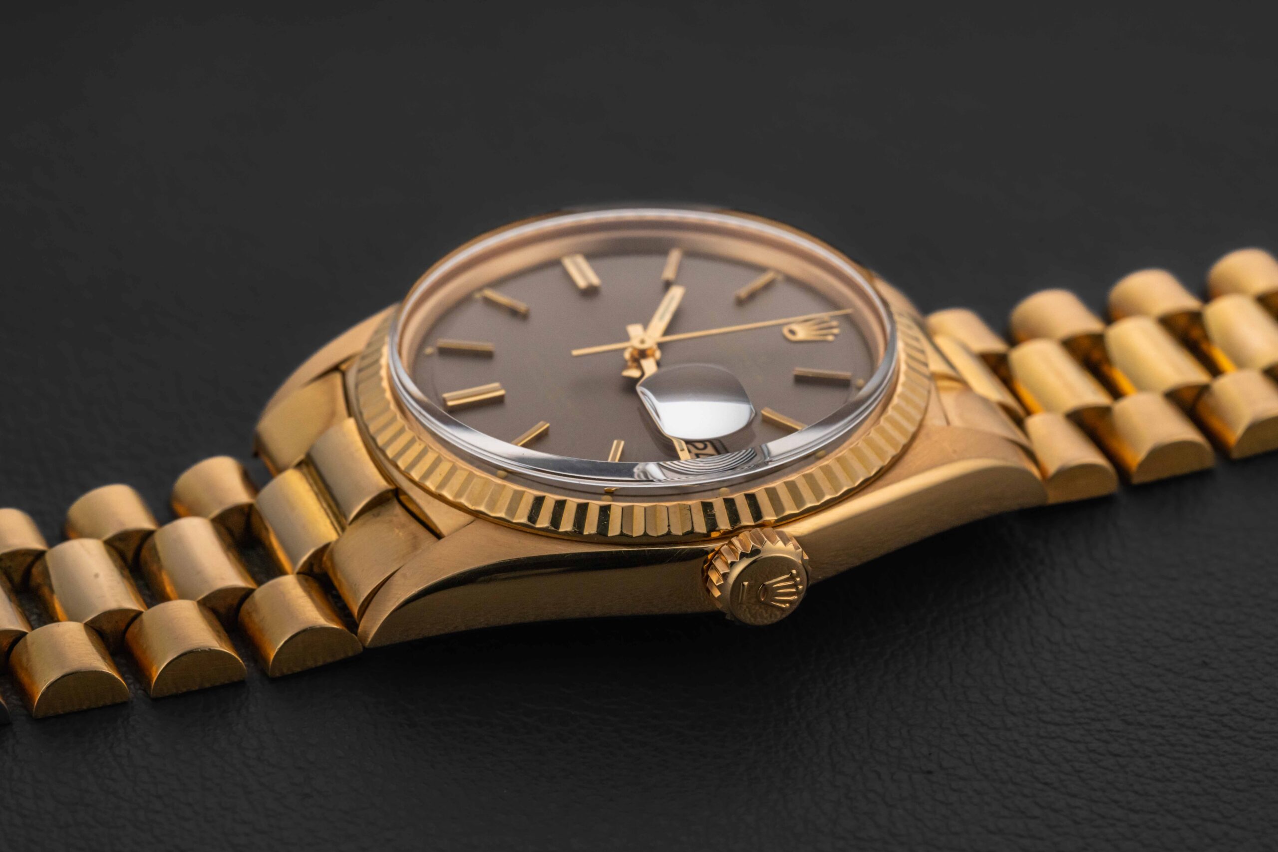 Up for grabs is a stunning Rolex Datejust, cased in 18kt yellow gold, circa 1972, fitted with a rare and lovely copper/smoke grey “ghost” sunburst dial. This Rolex Datejust is in great vintage condition, with a thick case, lightly polished in the past, and a perfect, flawless dial. Likewise, the original tritium lume remains on both dial and hands, aged to a nice, warm yellow color. The watch is fitted on an early Swiss Rolex Presidential bracelet, dating to 1972; the bracelet will fit a large wrist approximate 7.5-7.75″ wrist, with moderate stretch from use.