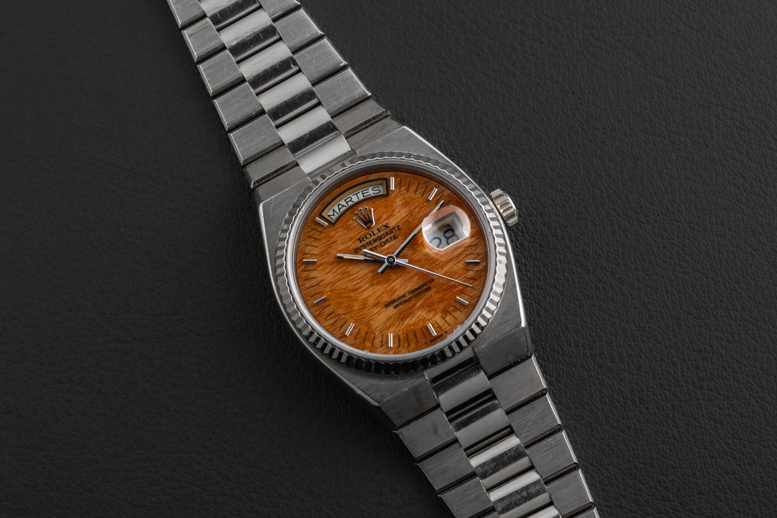 Offered here is an incredibly Rolex Day-Date, reference 19019, circa 1980, under the “Oysterquartz” line. These quartz watches were produced in the 1980s during the “quartz crisis”, and have risen in popularity as of late as an interesting footnote in horological history. This particular Rolex Oysterquartz Day-Date is housed in 18kt white gold – a rarity in itself – and fit with a wood-grain dial, a combination very seldom found. The watch itself remains in great condition: the case has likely been detailed in the past but retaining sharp lines/bevels on the lugs, and the factory wood dial shows no cracks or flaws. The bracelet has no stretch and will fit an approximate 7.2″ wrist.