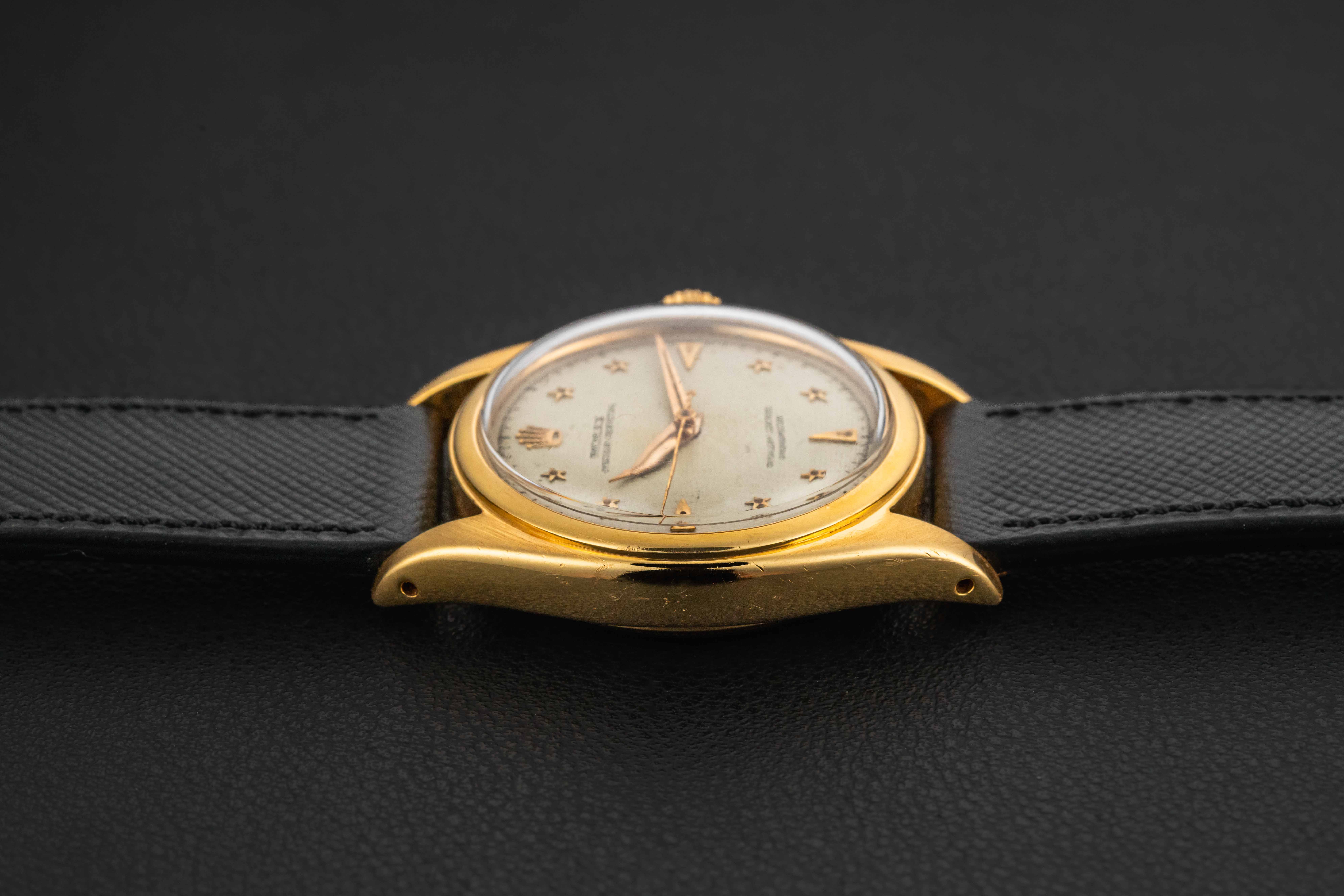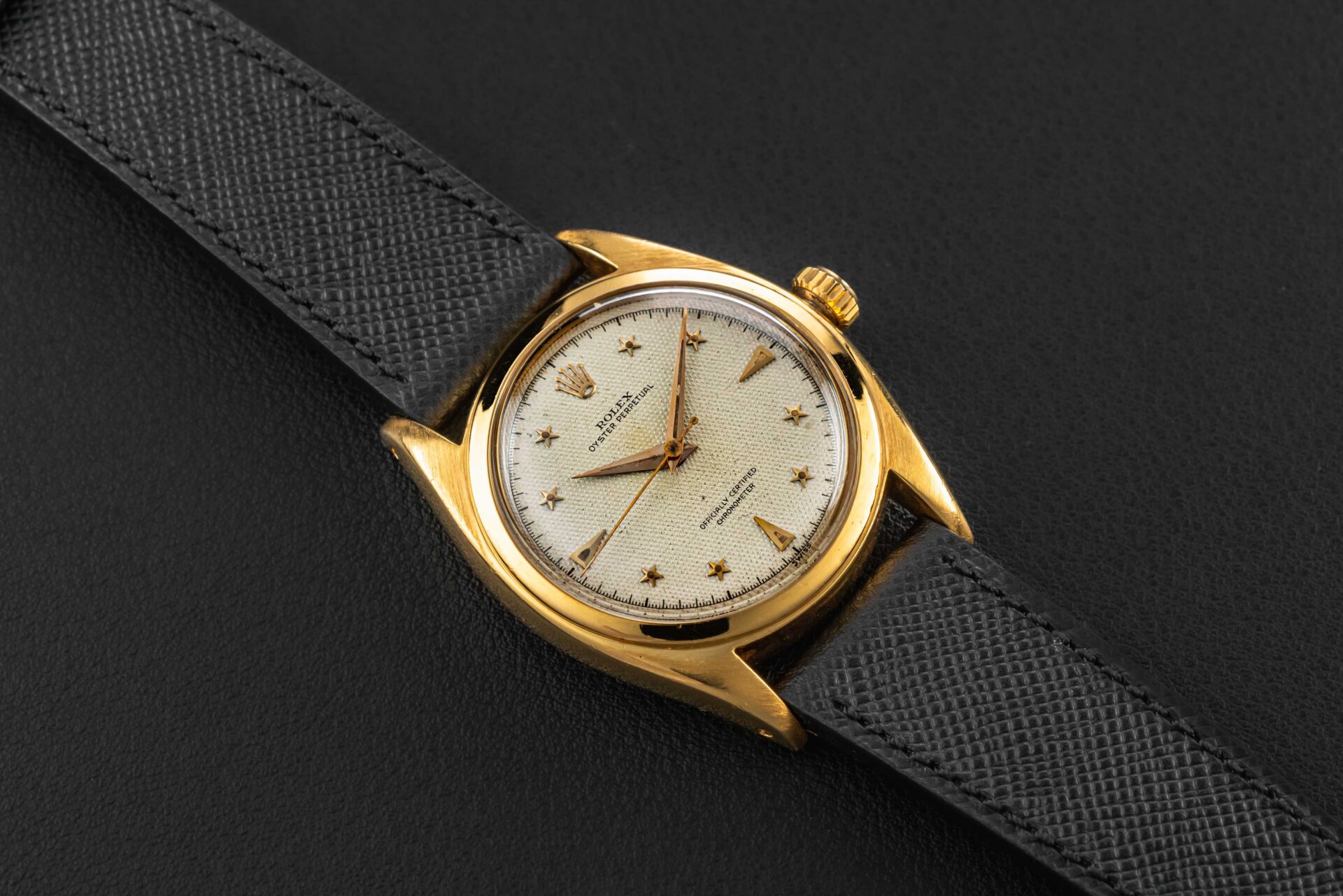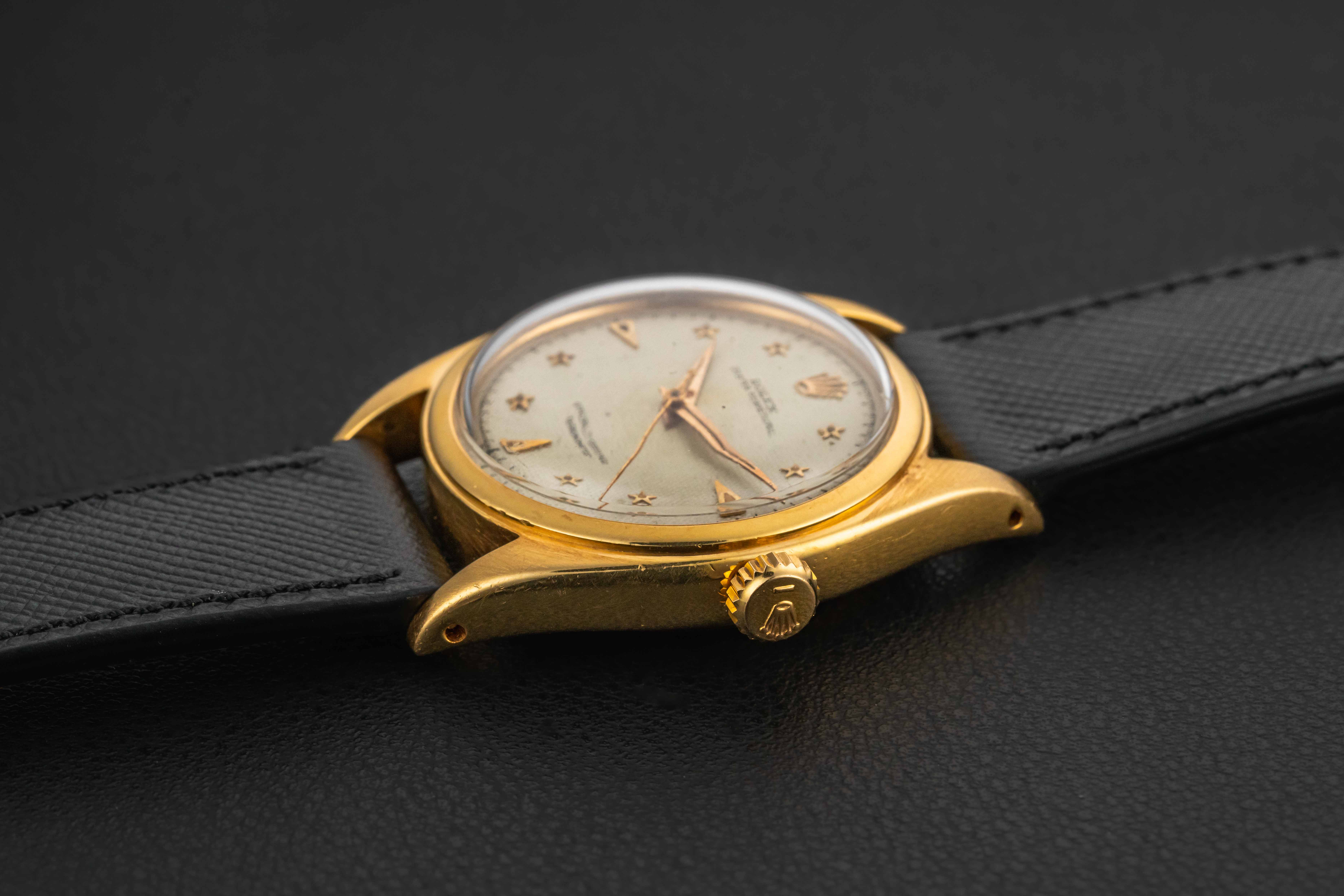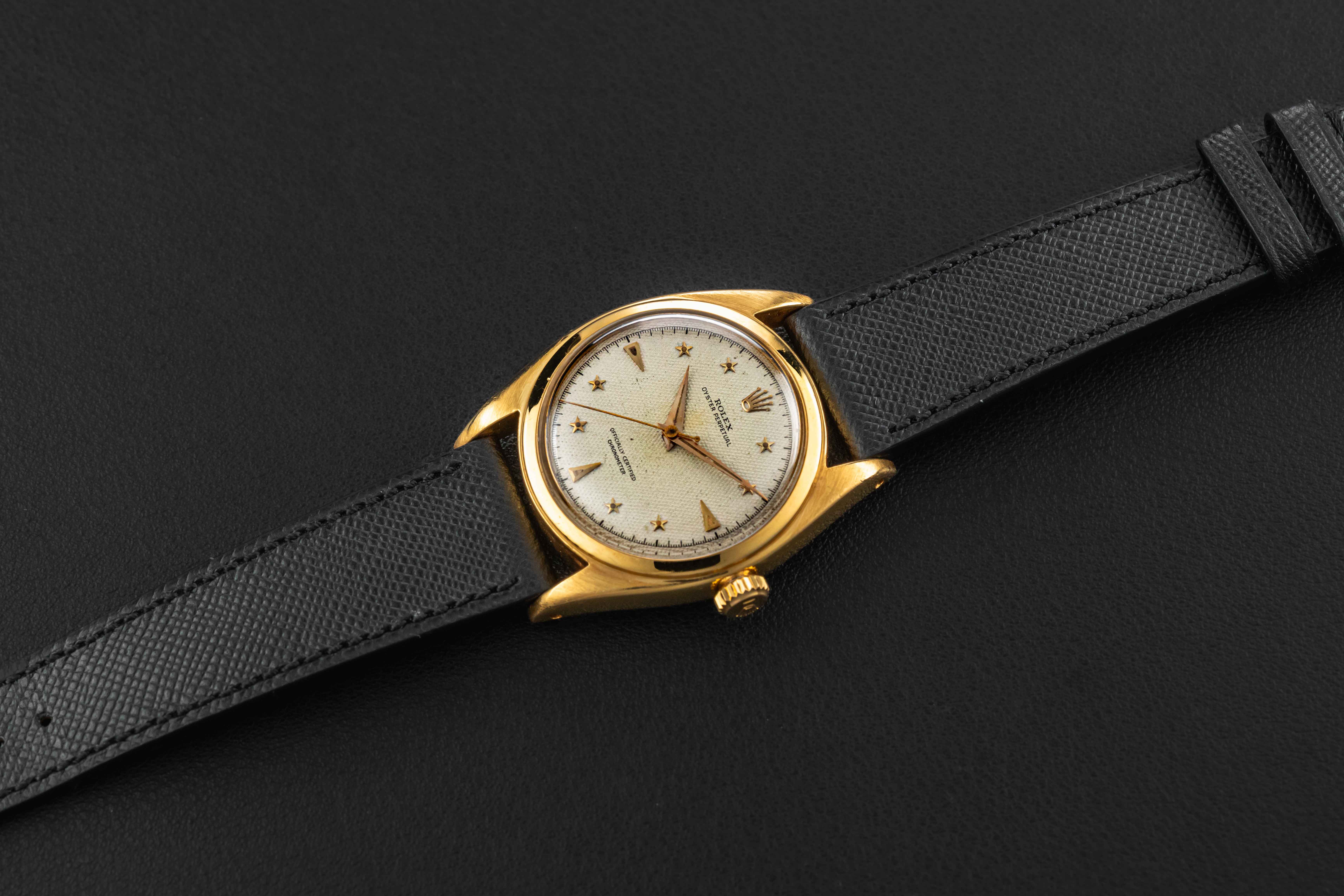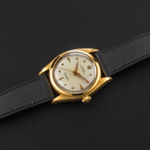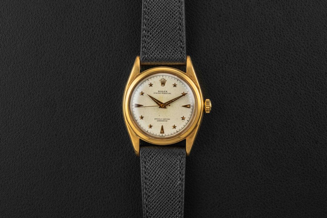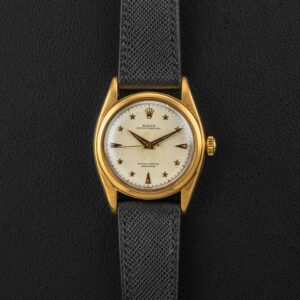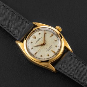 Up for grabs is a very special and rare Rolex Oyster Perpetual, reference 6098, circa 1953. This particular Oyster Perpetual is nicknamed the “Galaxy”, as seen in an old Rolex advertisement, and also due to the star-shaped hour markers applied on its honeycomb dial. According to some reports, only a dozen or so of these have surfaced over the years, and while the exact amount of production is unknown, it was clearly low. The watch itself is housed in a 36mm “Ovettone” case, similar to the other “Stelline” reference, the 6062.