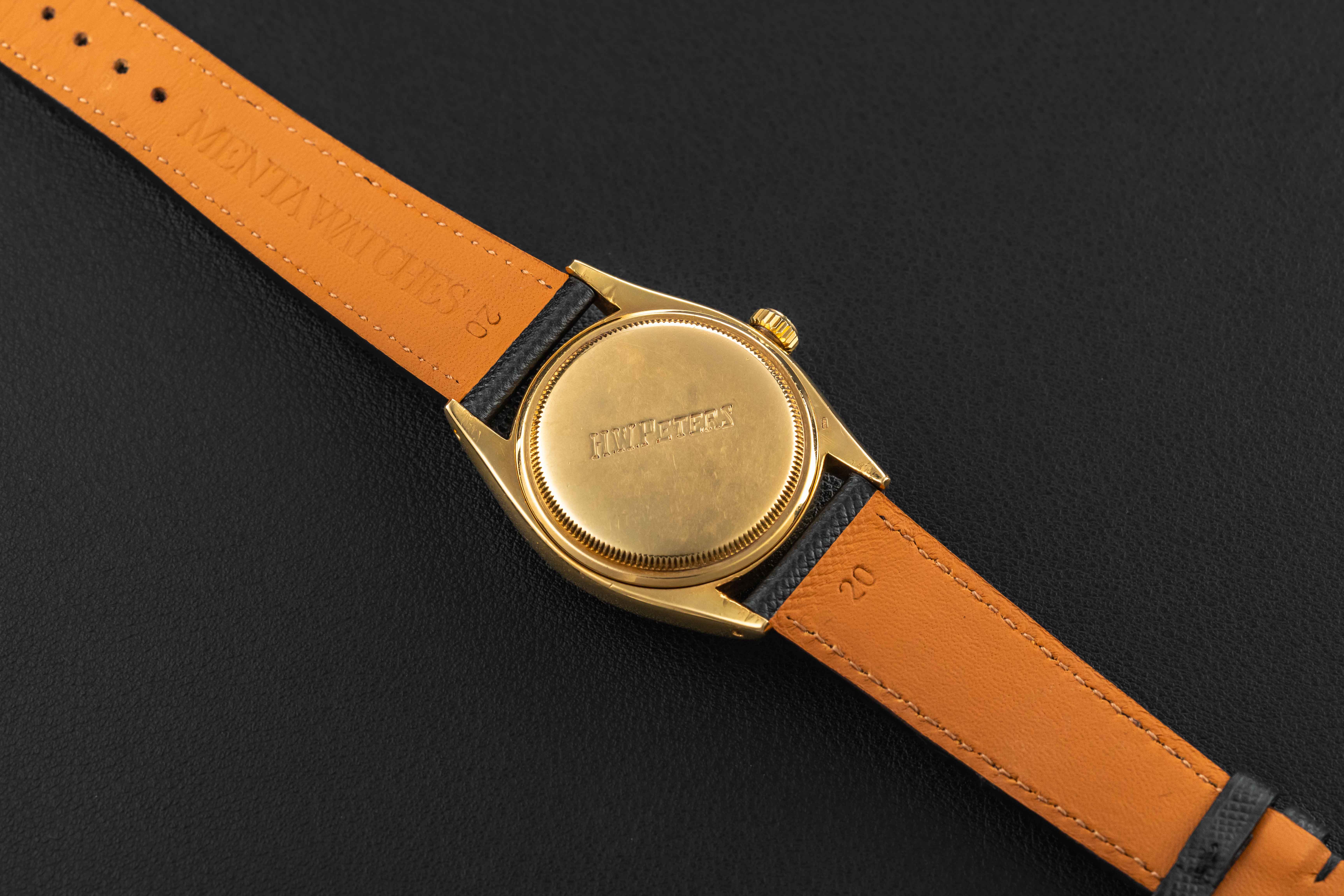 The condition of this rare star-dial Oyster Perpetual is great. The case has been lightly polished in the past, retaining thick and even lugs, and has an engraving of a prior owner reading “H.W. Peters”. Further, the dial remains very well-preserved, with no major damage, and a light patina to the honeycomb texture. Finally, the original radium lume remains in-tact on both dial and hands, aged to a warm orange color, with very minor loss to the minute hand.
