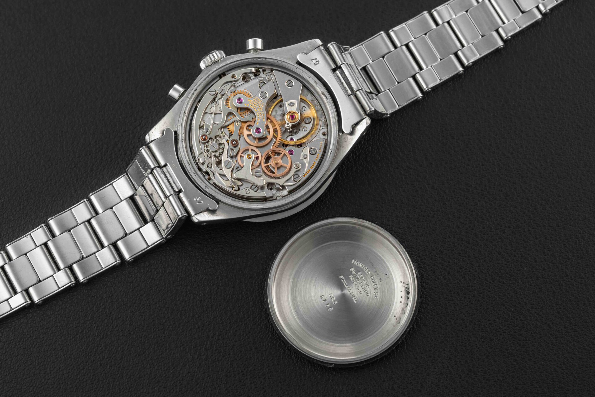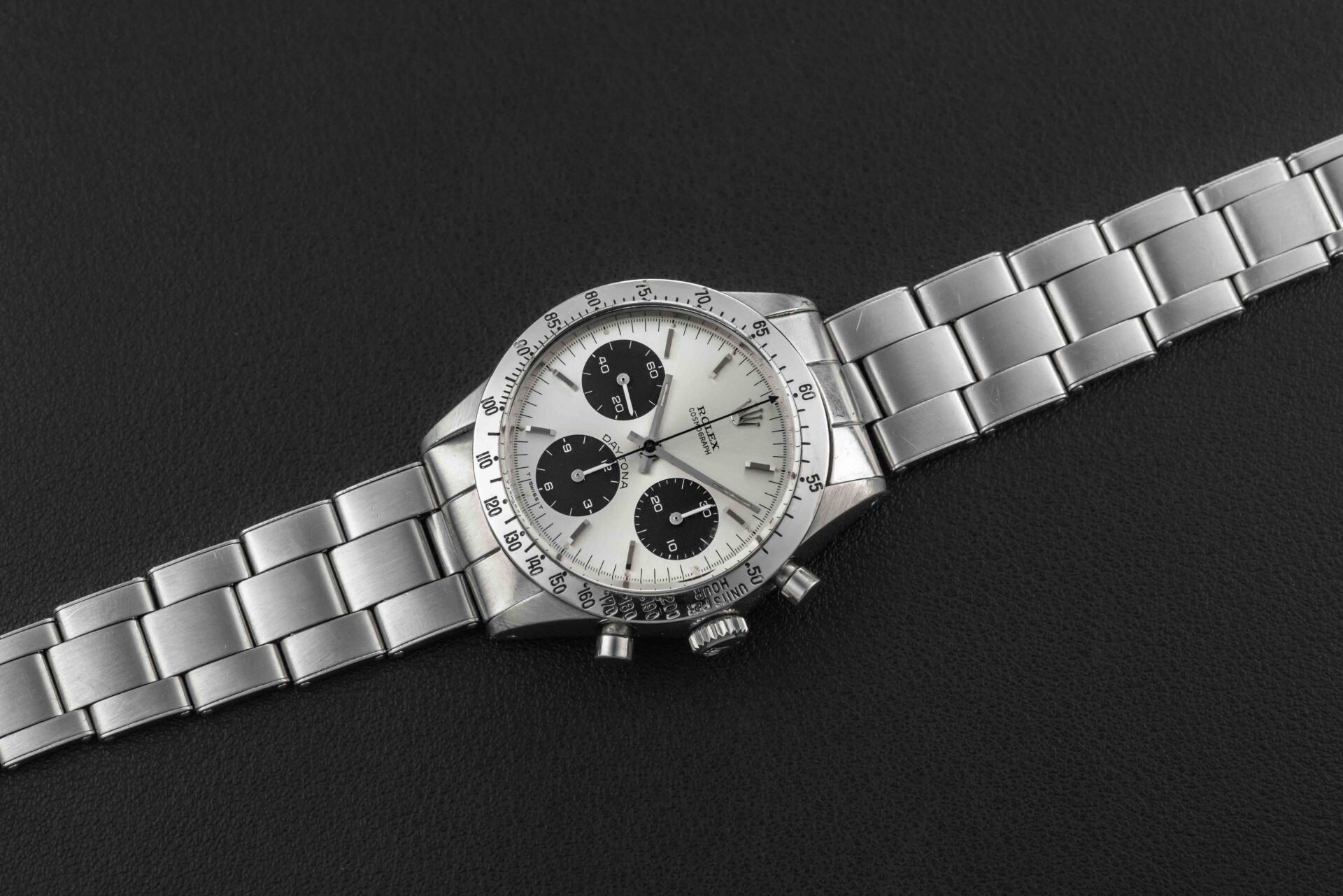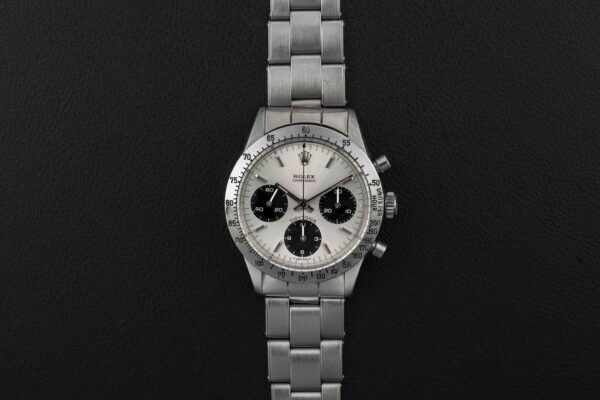 Up for grabs is a very rare pump-pusher Rolex Daytona, reference 6262, produced circa 1969-70. The reference 6262 was only produced for approximately one year between 1969 and 1970, and is one of the lowest production manual-wind Daytonas. This particular example features a “panda” dial (white with contrasting black registers).