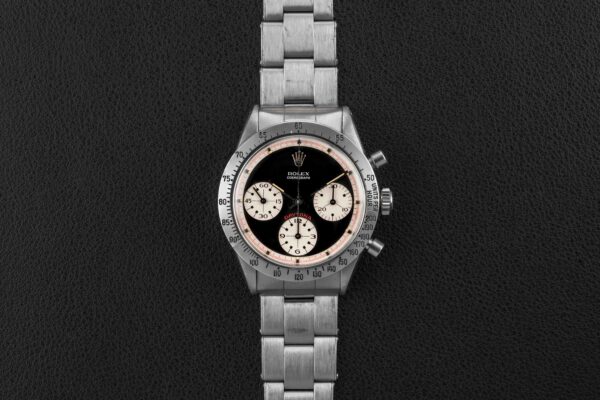 Offered here is a lovely example of Rolex Daytona, Ref. 6262, circa 1970, fitted with an exotic dial, nicknamed the “Paul Newman” Daytona, due to the fact that the famous actor favored wearing the Rolex Daytona with the exotic dial, and can be seen in many photographs wearing the watch. The reference 6262 is one of the rarest of all the Paul Newman (or Daytona in general) variants, produced for a very short period of time. This particular example comes to us fresh-to-market and fit with a “reverse panda” black dial.