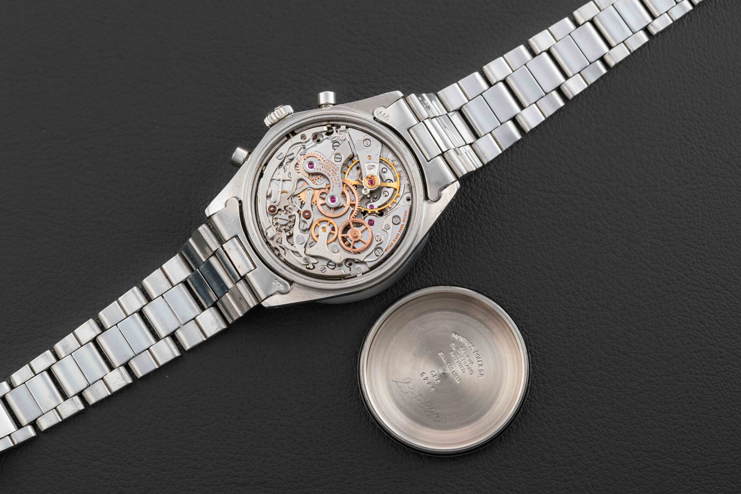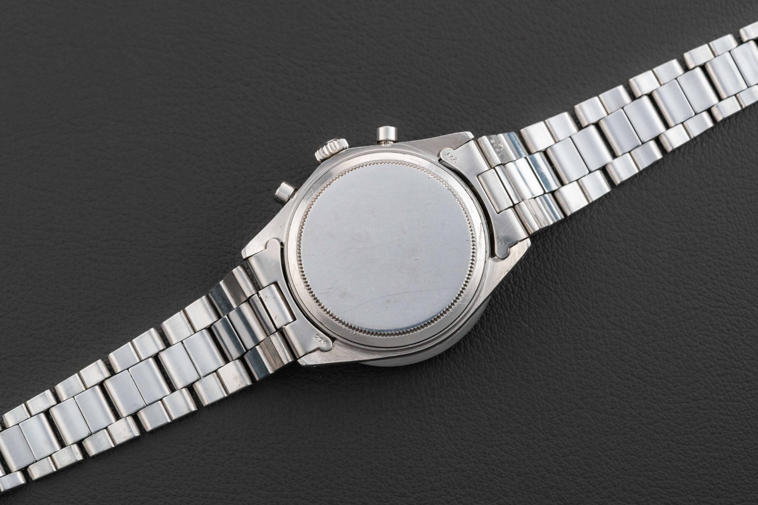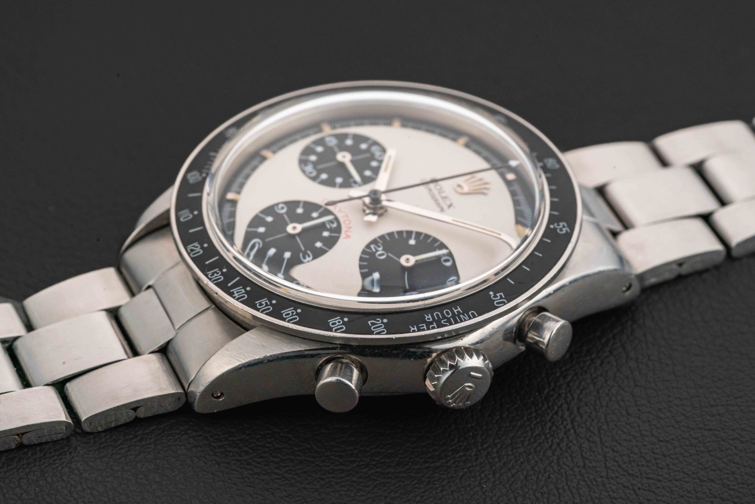 Offered here is a lovely and fresh-to-the-market example of Rolex Daytona, Ref. 6264, circa 1969-70, fitted with an exotic dial, nicknamed the “Paul Newman” Daytona, due to the fact that the famous actor favored wearing the Rolex Daytona with the exotic dial, and can be seen in many photographs wearing the watch. This example is outfitted with a rare two-color panda dial and pump pushers, with a black, bakelite bezel. The reference 6264 Newmans are considered some of the most desirable of all of the Newman variants, as the 6264 (and steel bezel version, reference 6262) was produced for only one year, and features the two-color dial variant, which many collectors find more aesthetically pleasing.
