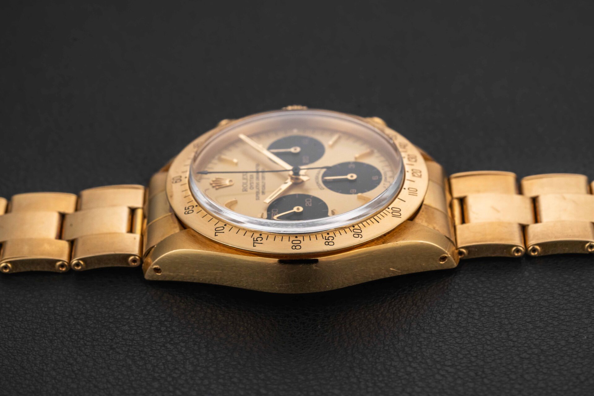 Offered here is a lovely example of Rolex Daytona, Ref. 6265, circa 1982, produced in 18kt Yellow Gold. During this era, very few Daytonas were produced in gold, most being fitted in a steel case. In fact, allegedly less than 10% of the 24,000 of 6263 and 6265 watches for the 20 year period of their production run were made in gold. This example is outfitted with a matching champagne dial.