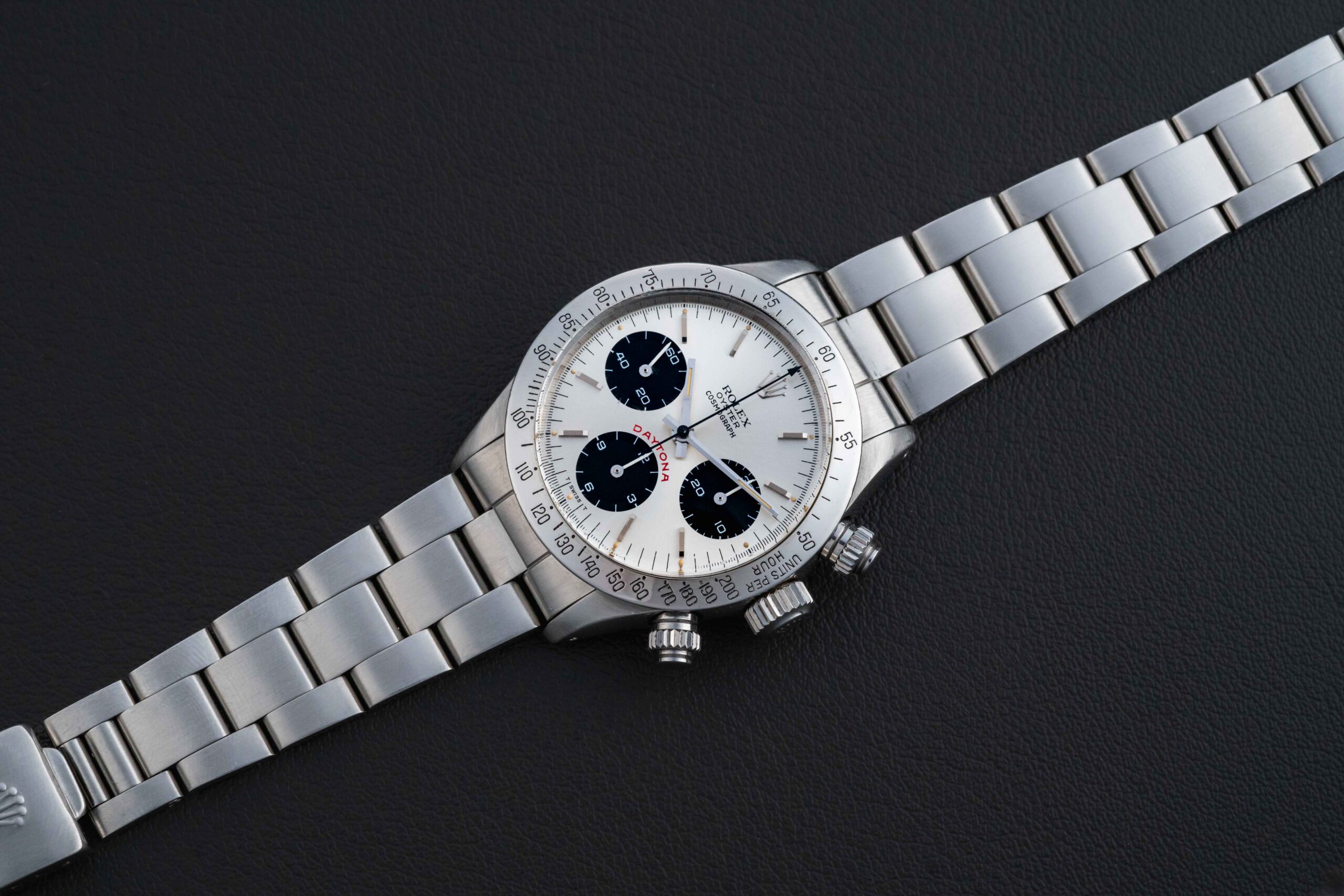 Offered here is a beautiful example of Rolex Daytona, Ref. 6265 (circa 1985; 8.6m serial), nicknamed the “Big Red” Daytona, due to the printing of “Daytona” in bright red letters in the center of the dial. This example is outfitted with a panda-silver dial, and features screwdown pushers. These screwdown pusher-Daytonas have soared in popularity over the last couple decades, and are coveted by collectors, new and old.