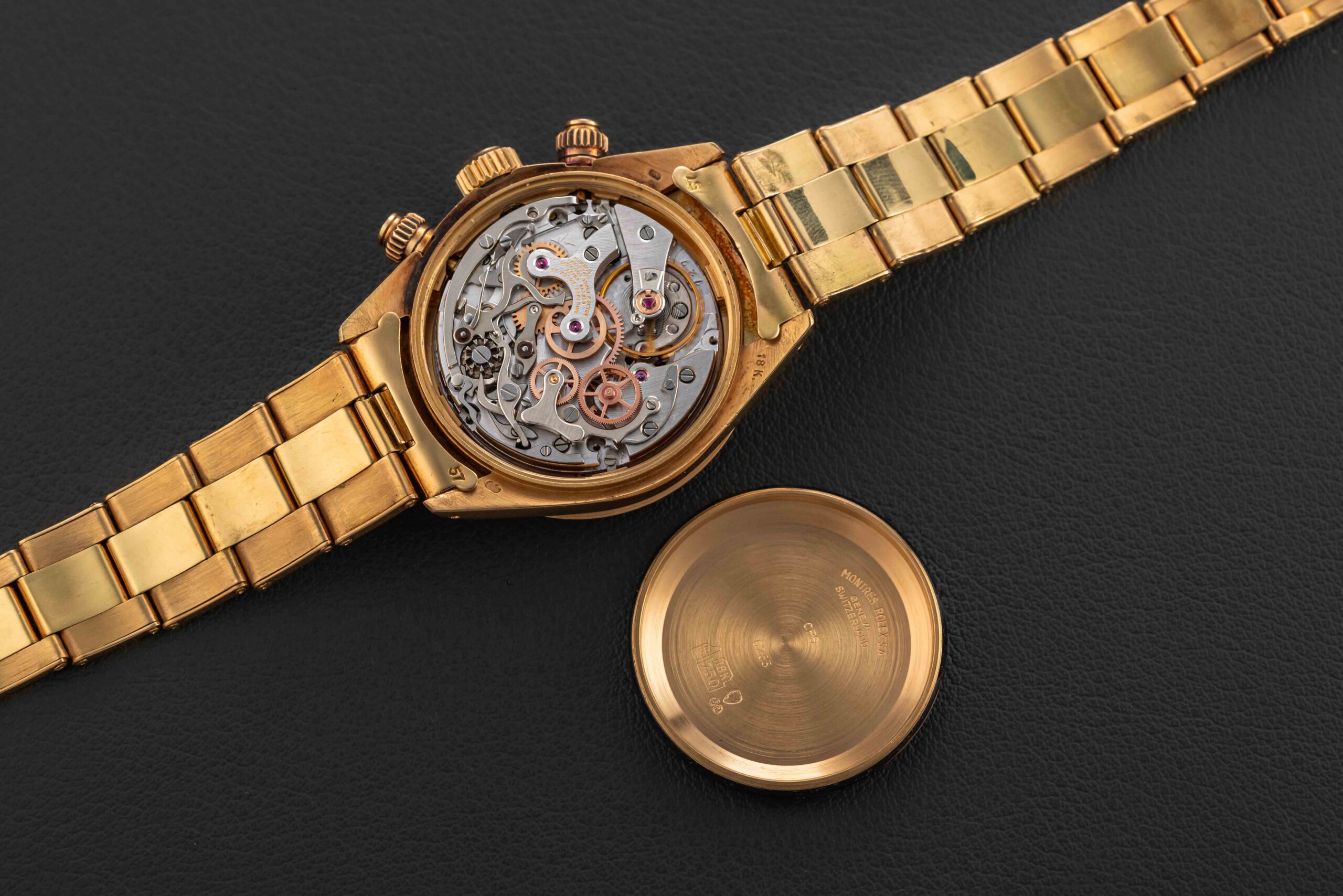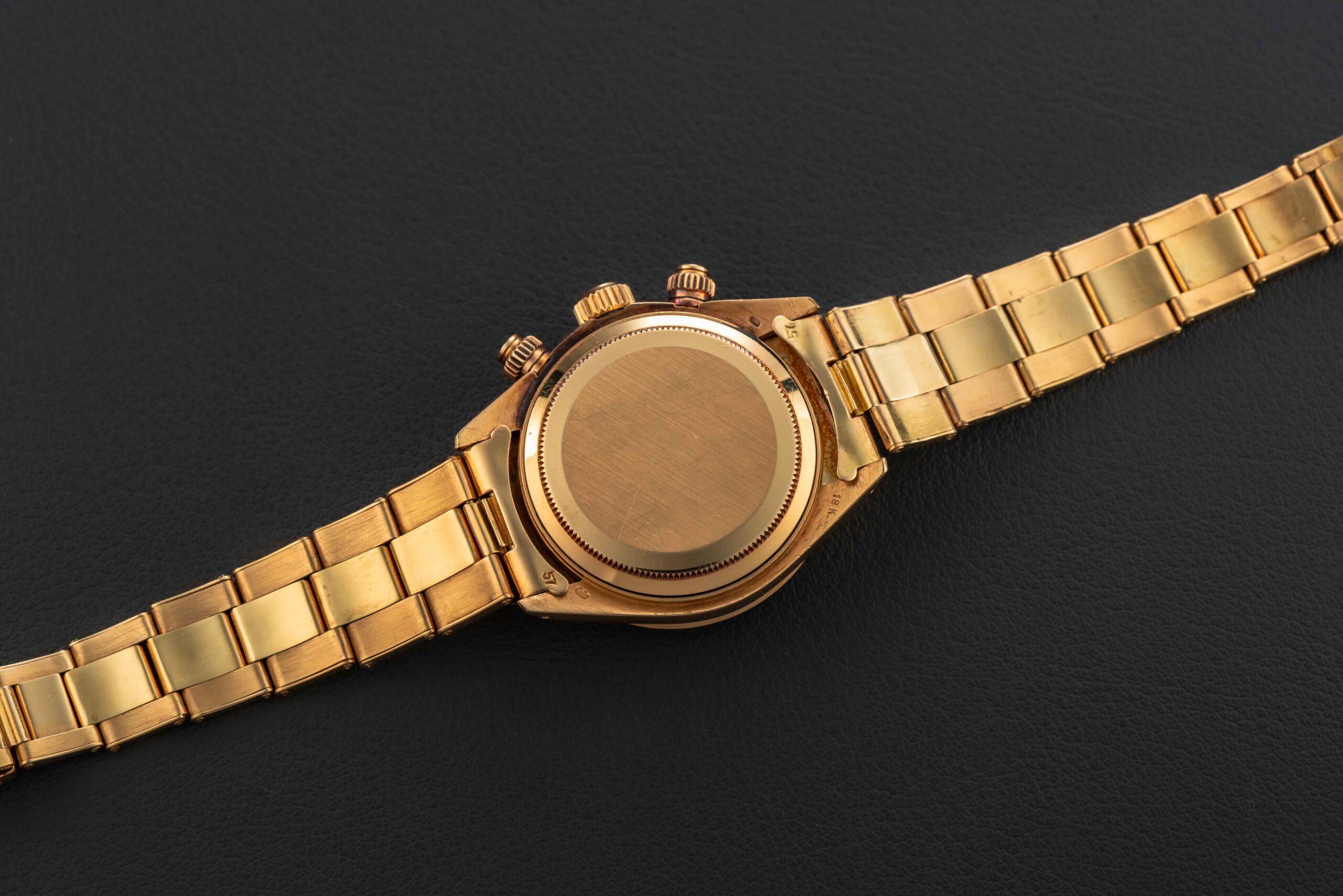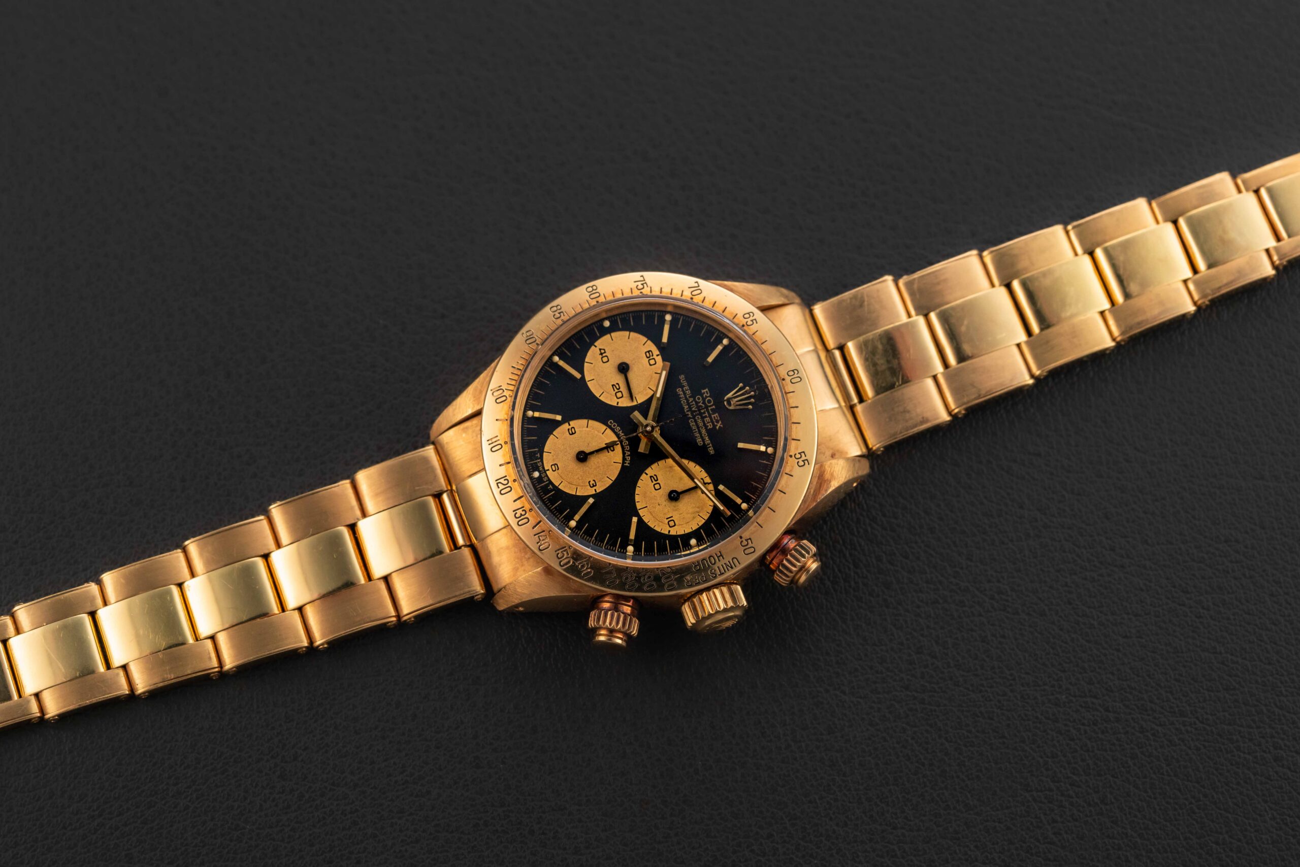 Offered here is a lovely and crisp example of Rolex Daytona, Ref. 6265, circa 1986, produced in 18kt Yellow Gold. During this era, very few Daytonas were produced in gold, most being fitted in a steel case. In fact, allegedly less than 10% of the 24,000 of 6263 and 6265 watches for the 20 year period of their production run were made in gold. This example is outfitted with a popular black dial.
