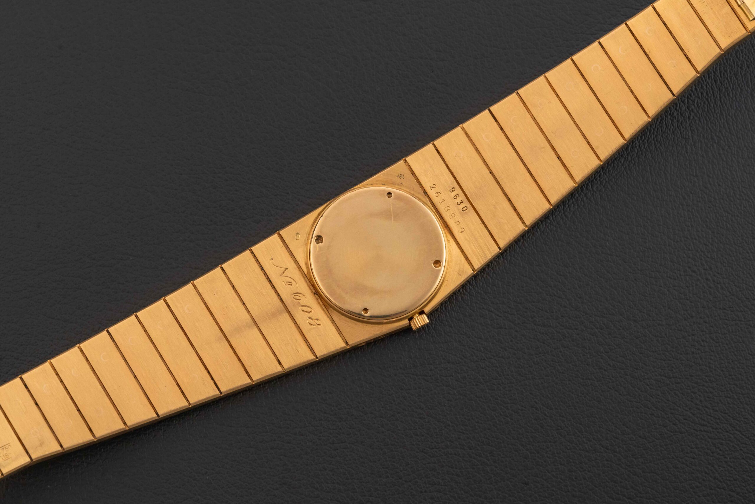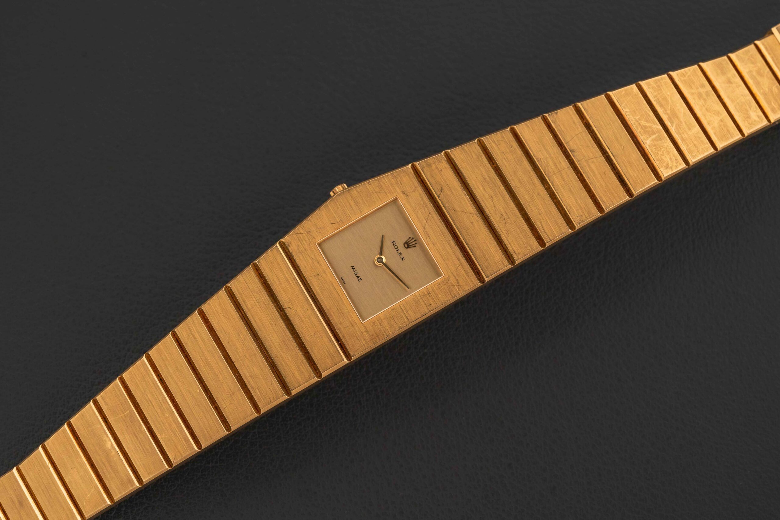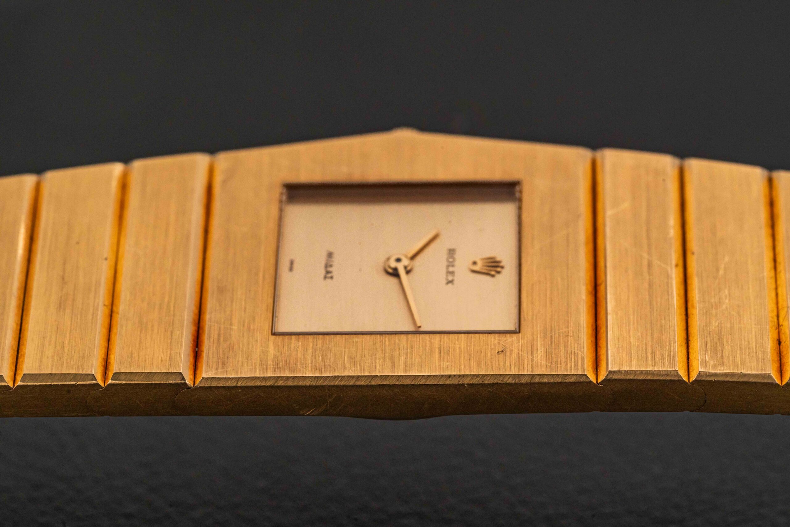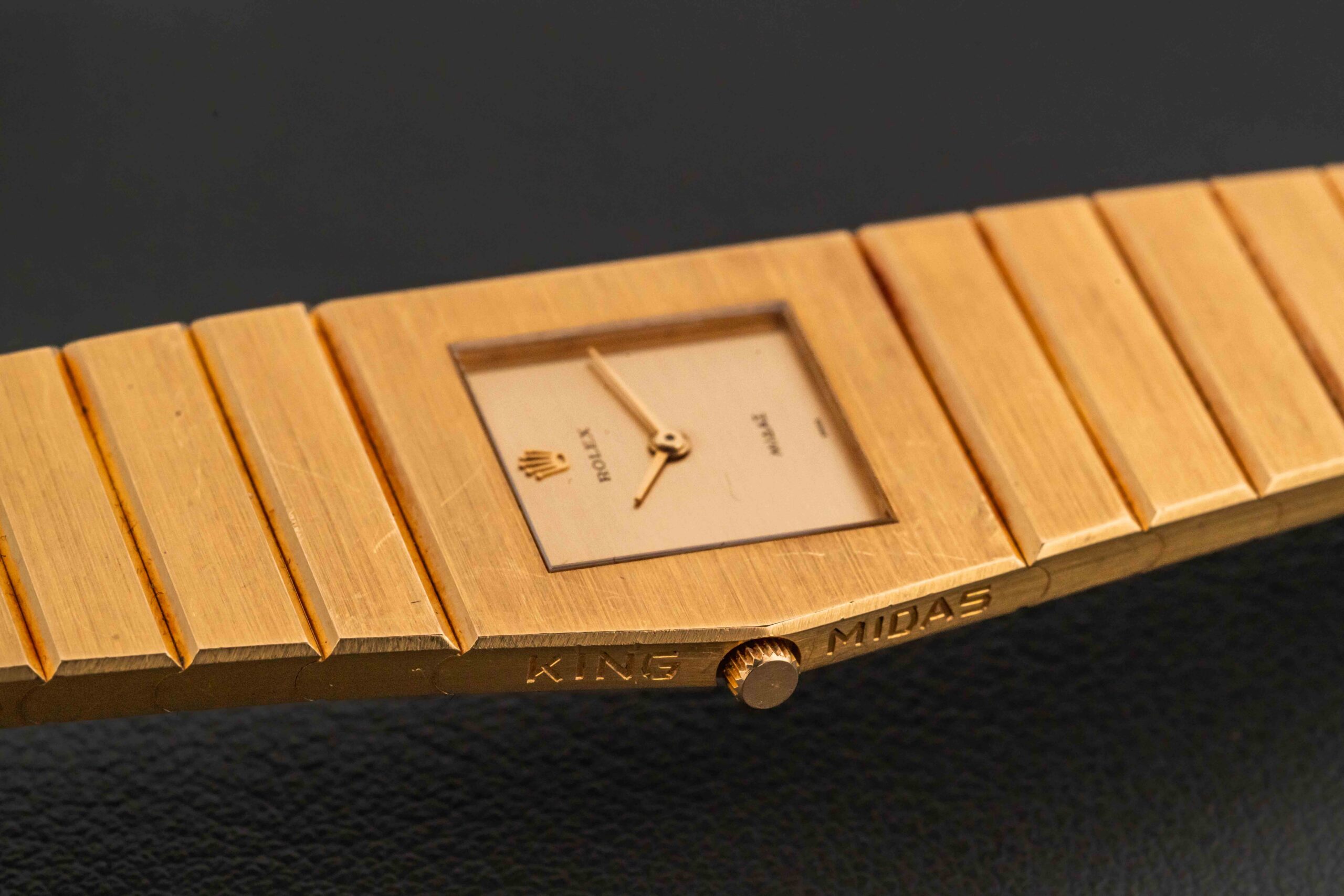 Up for grabs is a stunning example of the extremely popular Rolex King Midas, reference 9630. The reference 9630 is the very first of the “assymetrical” case Midas line, before Rolex transitioned to a more traditional square look. This particular Rolex King Midas is in excellent condition, seemingly unpolished and sharp (albeit worn), and with a very clean, damage free dial. Further, the bracelet will fit an approximate 7.5″ wrist, seemingly fully-linked.