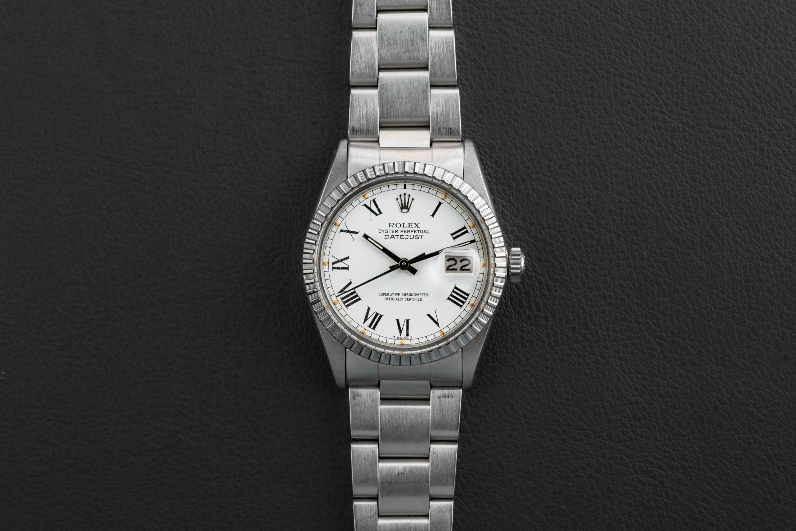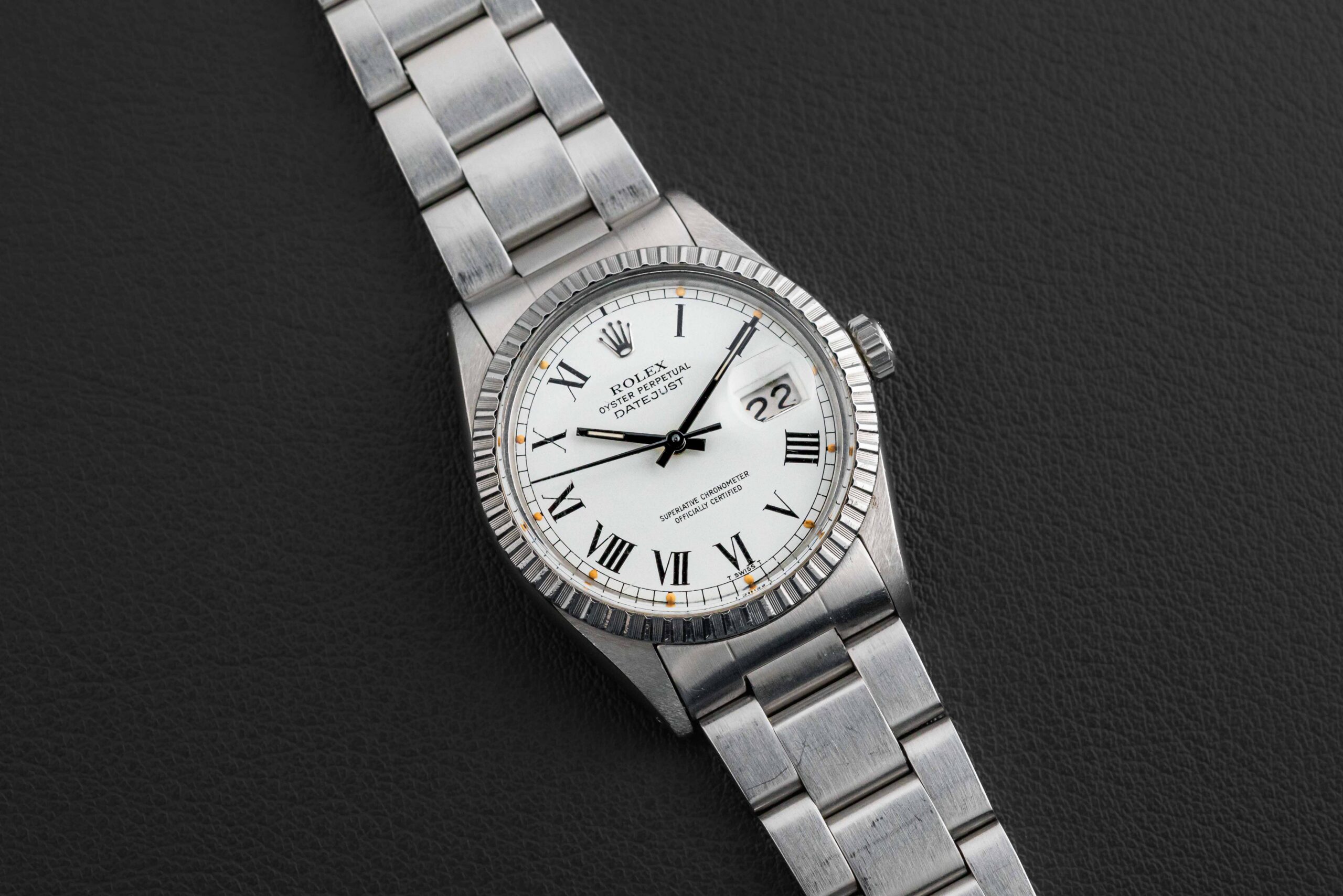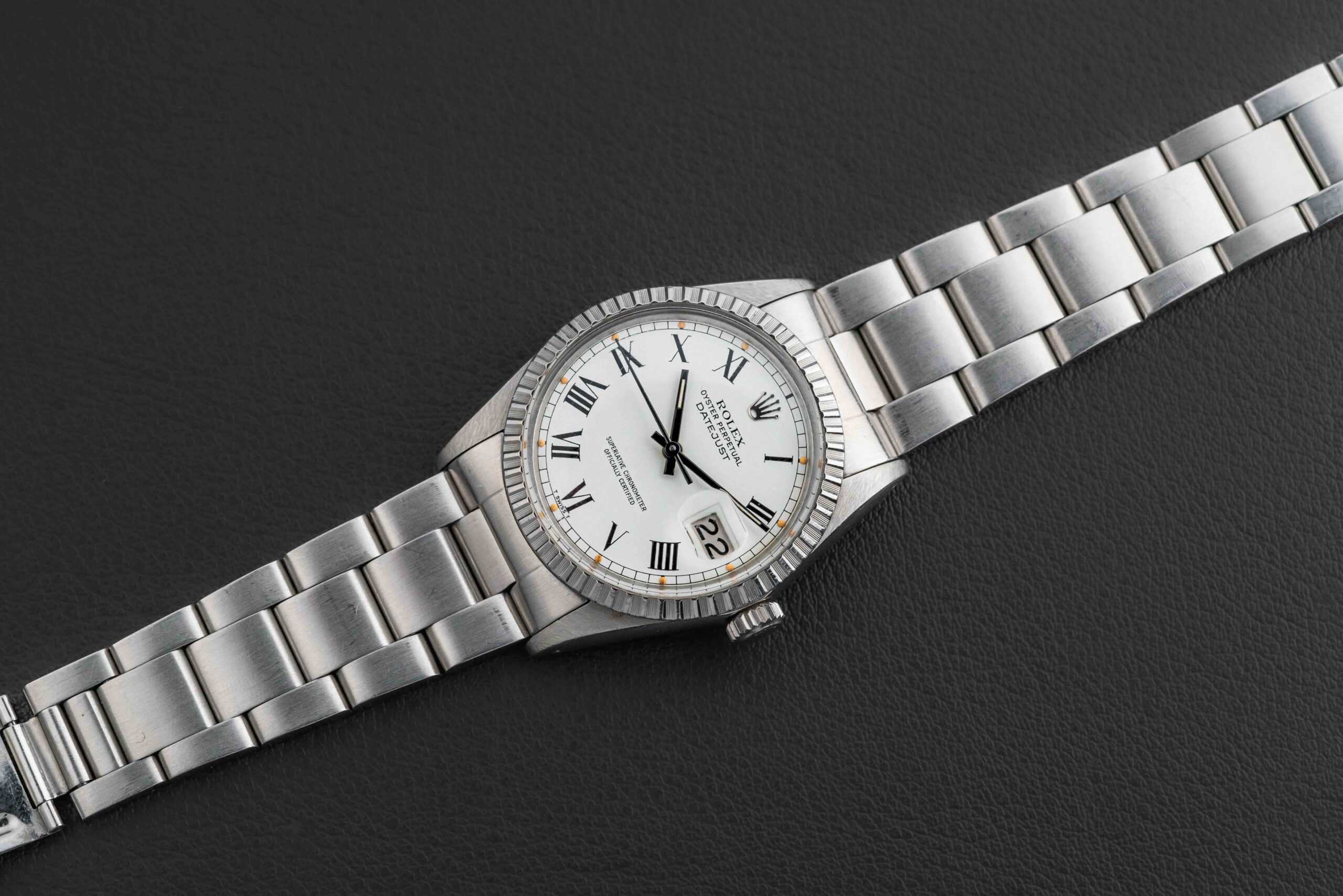Up for grabs is a Rolex Datejust, Reference 16030, circa 1982, with the popular “Buckley” dial, featuring a roman numeral layout, so named after the famous and well-known Rolex collector, John Buckley. This Rolex Datejust is in excellent condition, with a sharp and thick case (maybe lightly polished in the past), and flawless dial; the watch retains its original tritium lume on both dial and hands, aged to a golden yellow, with no loss whatsoever. The watch comes fitted on a Rolex Swiss Oyster 78360 bracelet with 558 endlinks, and has 12 full links with light stretch.