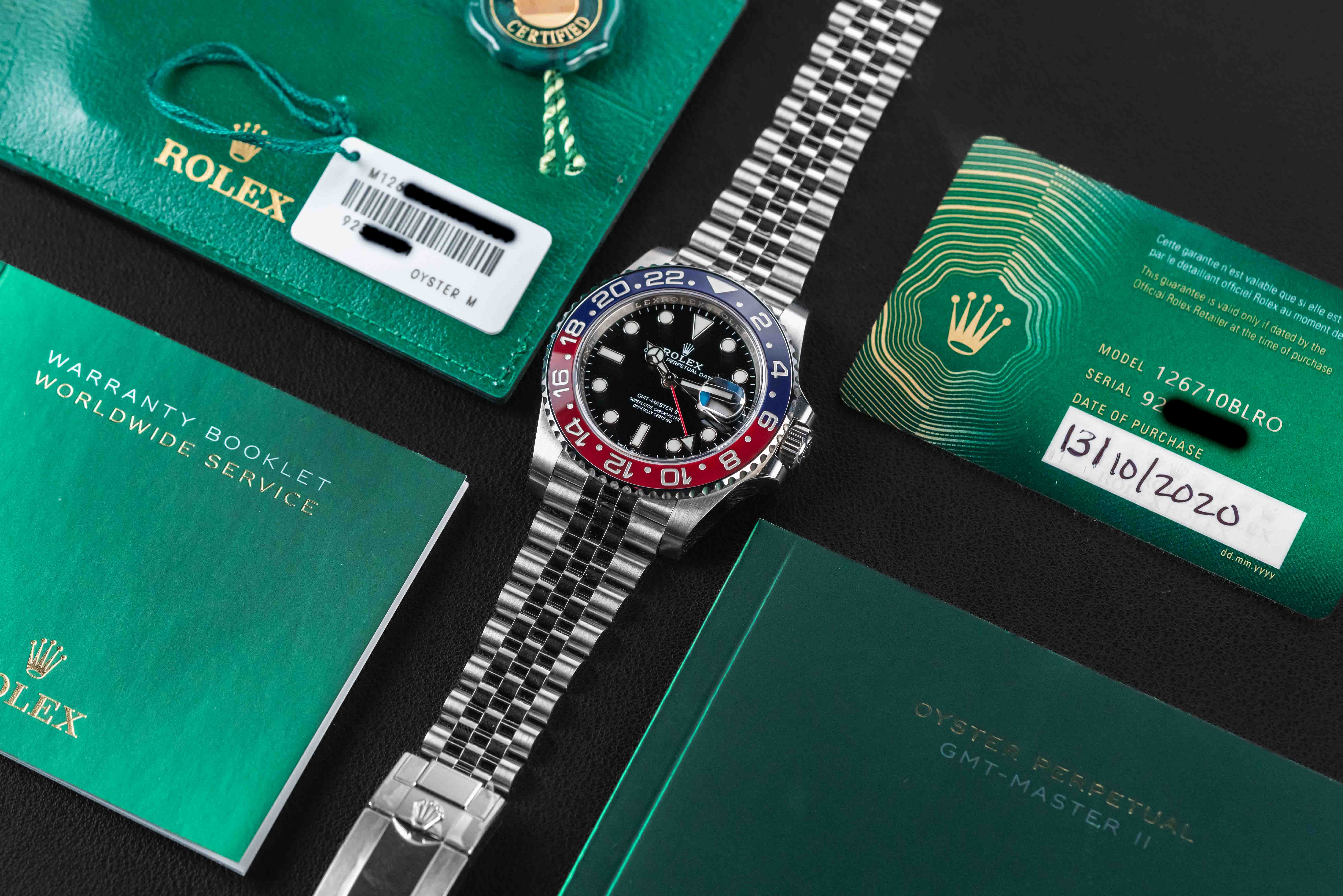 Up for grabs is a new old stock 2020 Rolex GMT-Master II, Ref. 126710BLRO, nicknamed the “Pepsi”, in its more popular variant on jubilee bracelet. The watch comes complete with its original Rolex box, booklets, and Warranty Card (dated October of 2020). The watch itself is in untouched condition with zero signs of wear and maintains some stickers on the case back and buckle.
