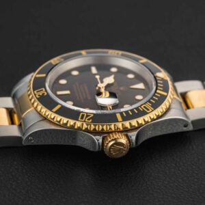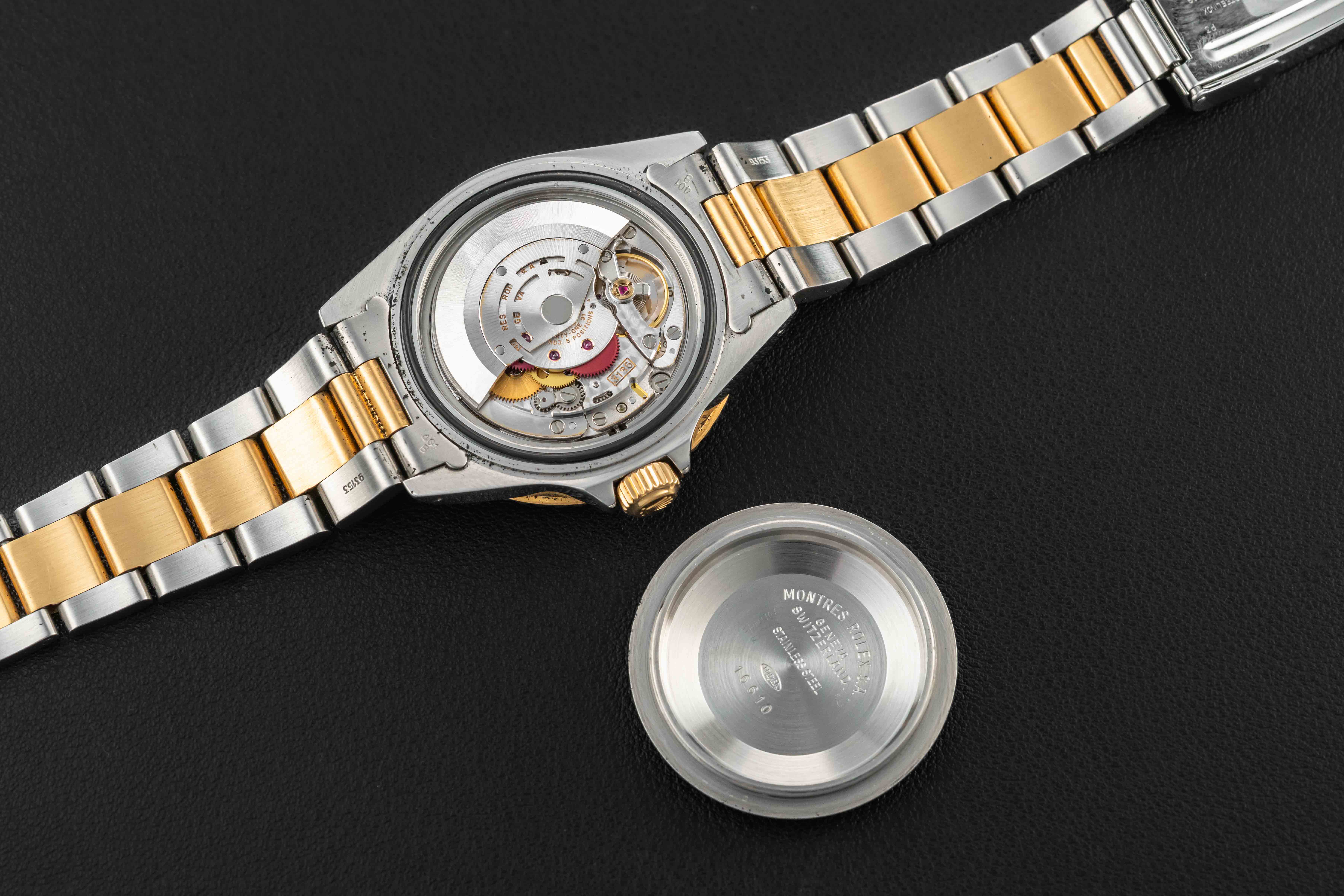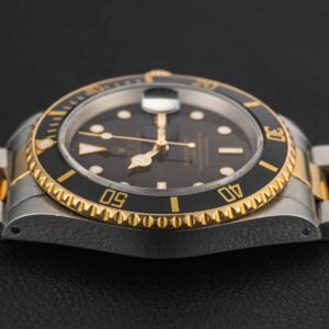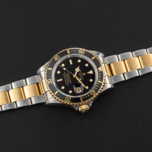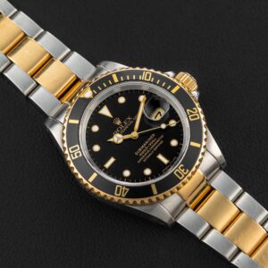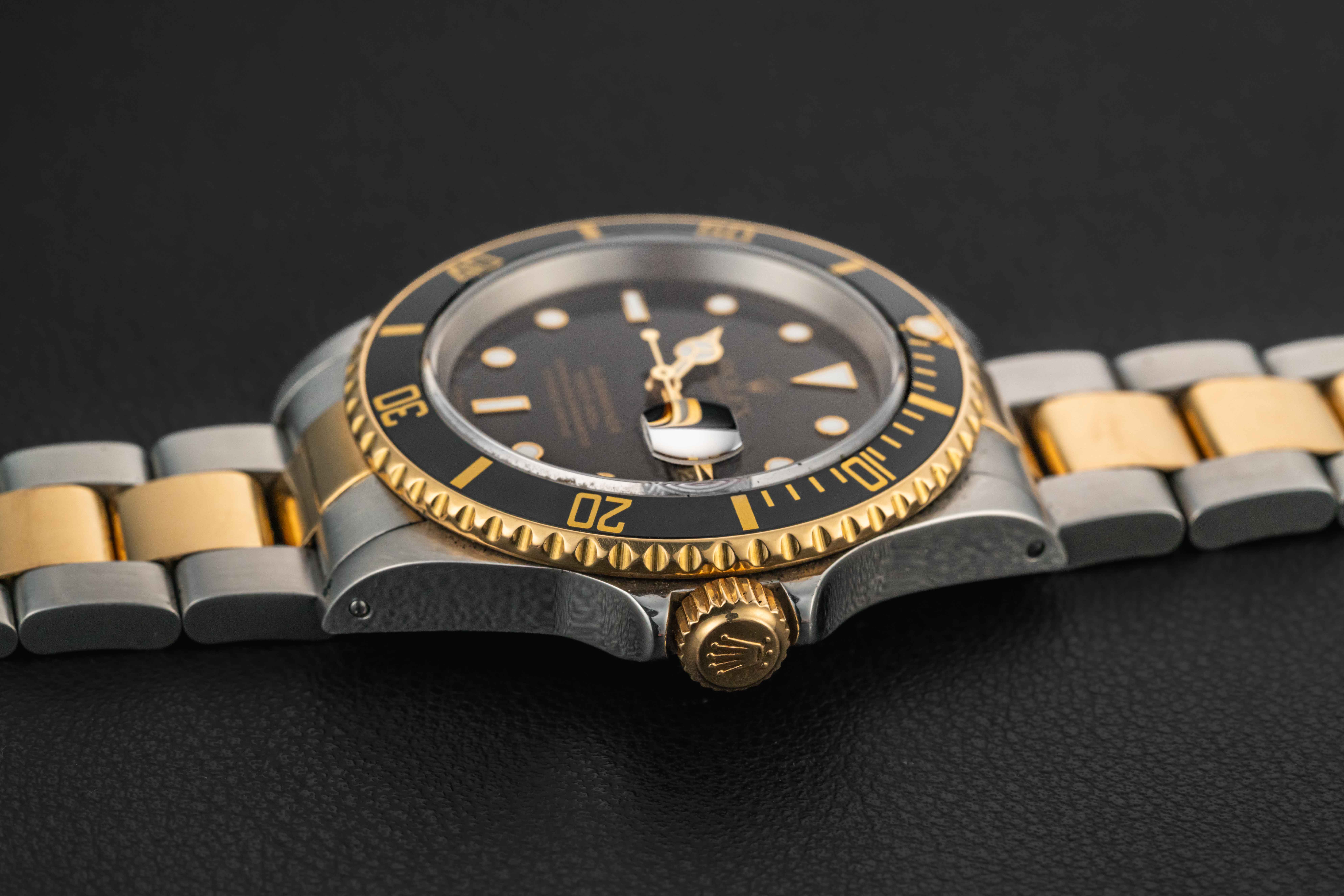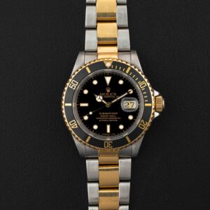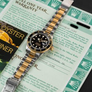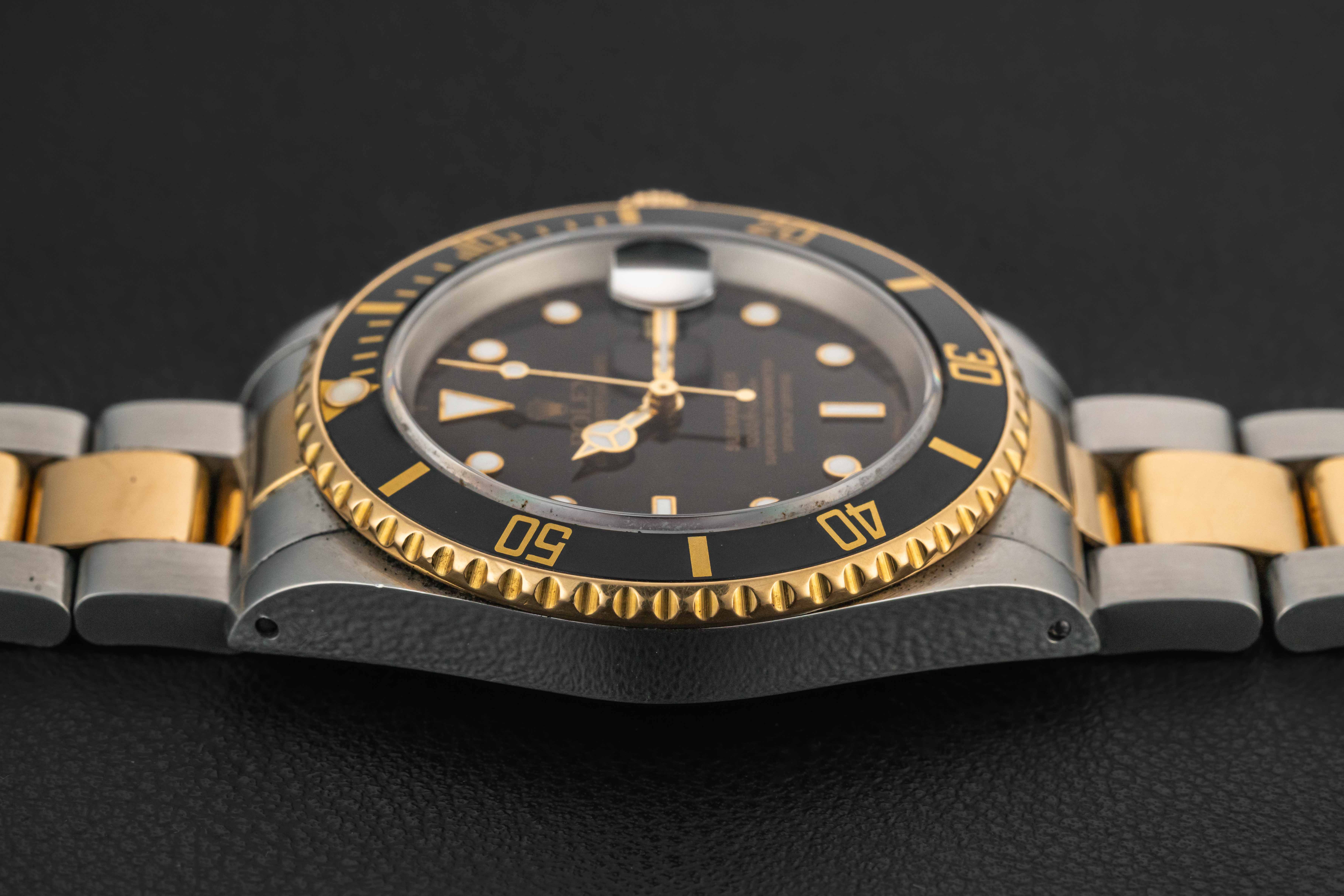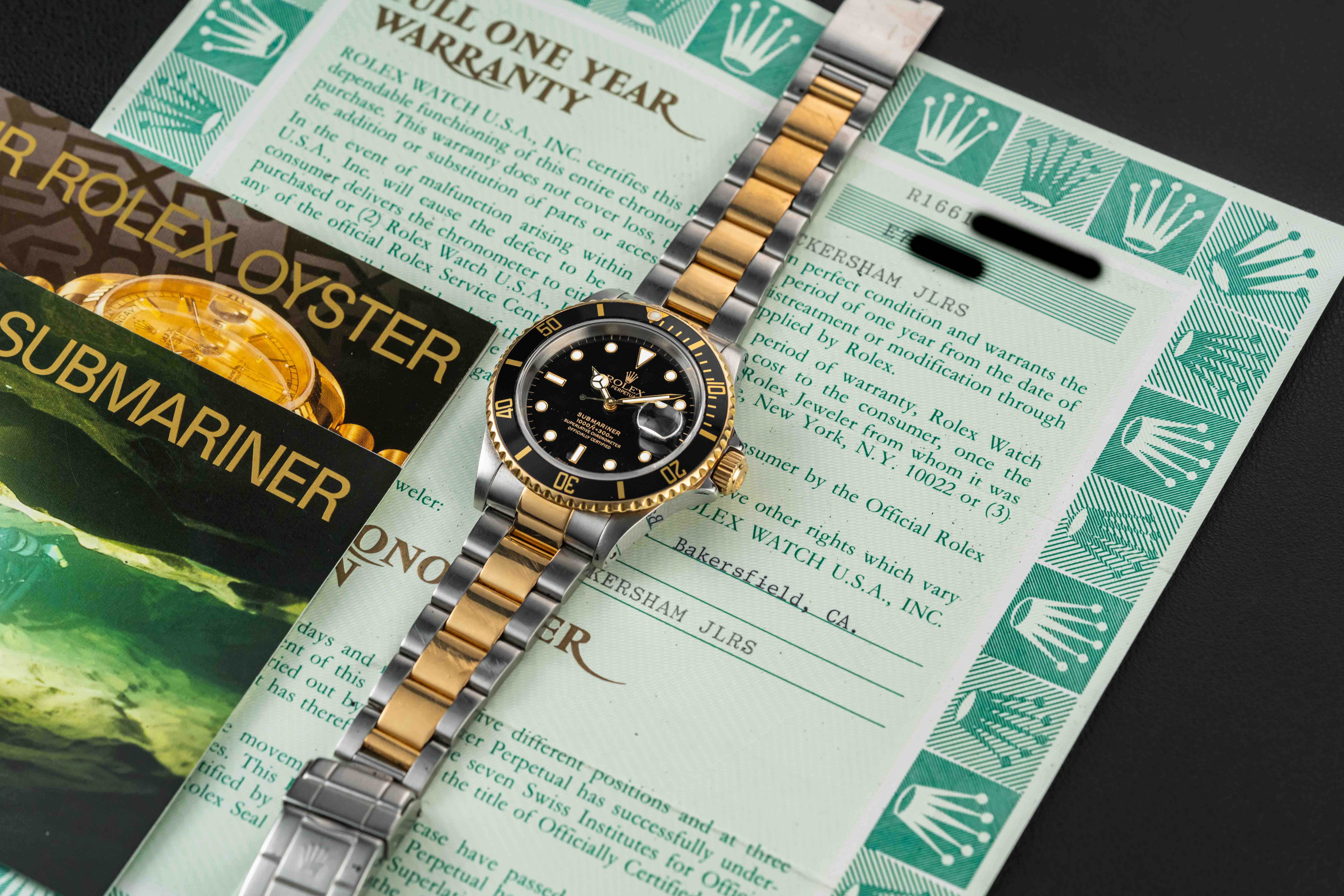 Offered here is a nice example of a Rolex Submariner, in two-tone steel and gold, circa 1990 (E serial), bearing the reference 16613. This watch comes complete as a full-set, including its original Rolex box, booklets and Warranty Certificate (as pictured). The watch itself is in nice vintage condition. The case has been polished in the past, but retains thick and even lugs. The dial and lume remains in untouched condition, with no wear. The watch retains its original two-tone Rolex Oyster 93153 bracelet with 401B endlinks, and has 11 full links with no stretch.