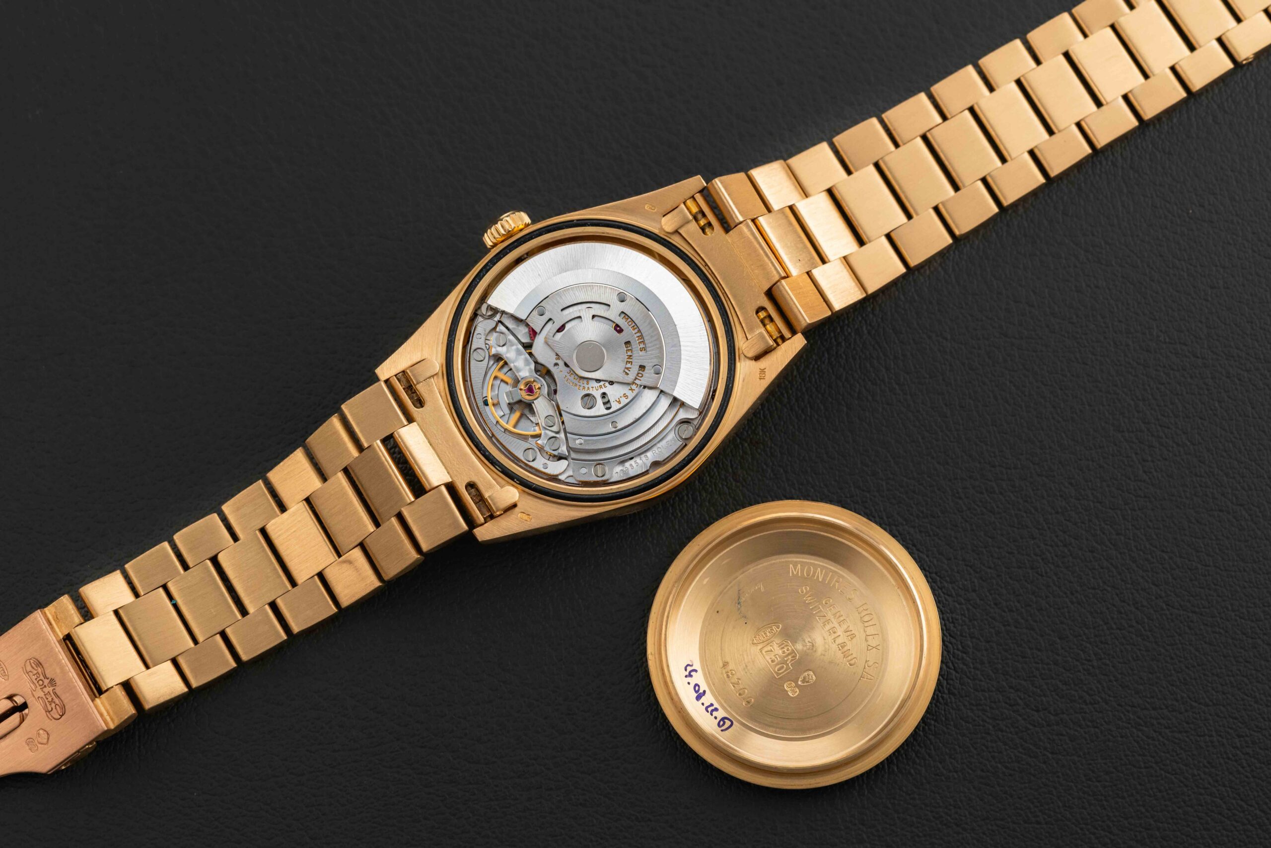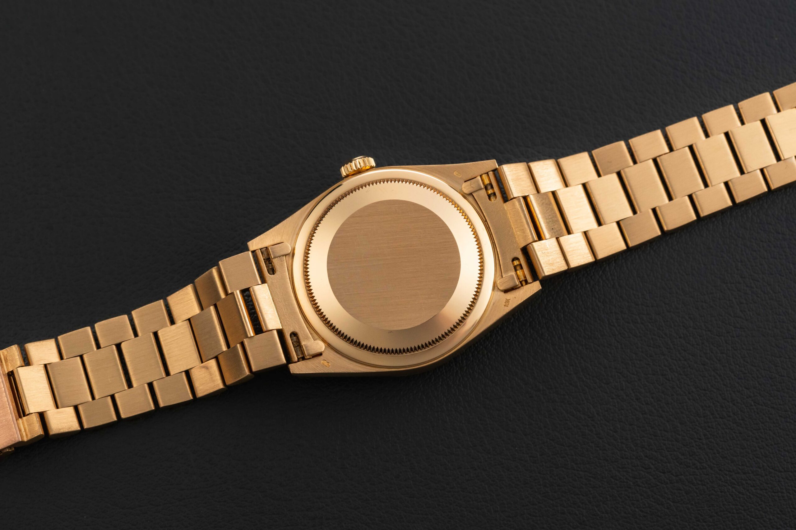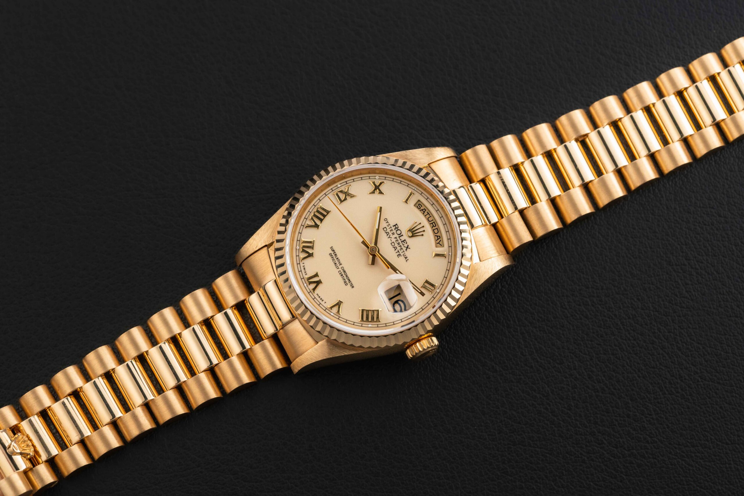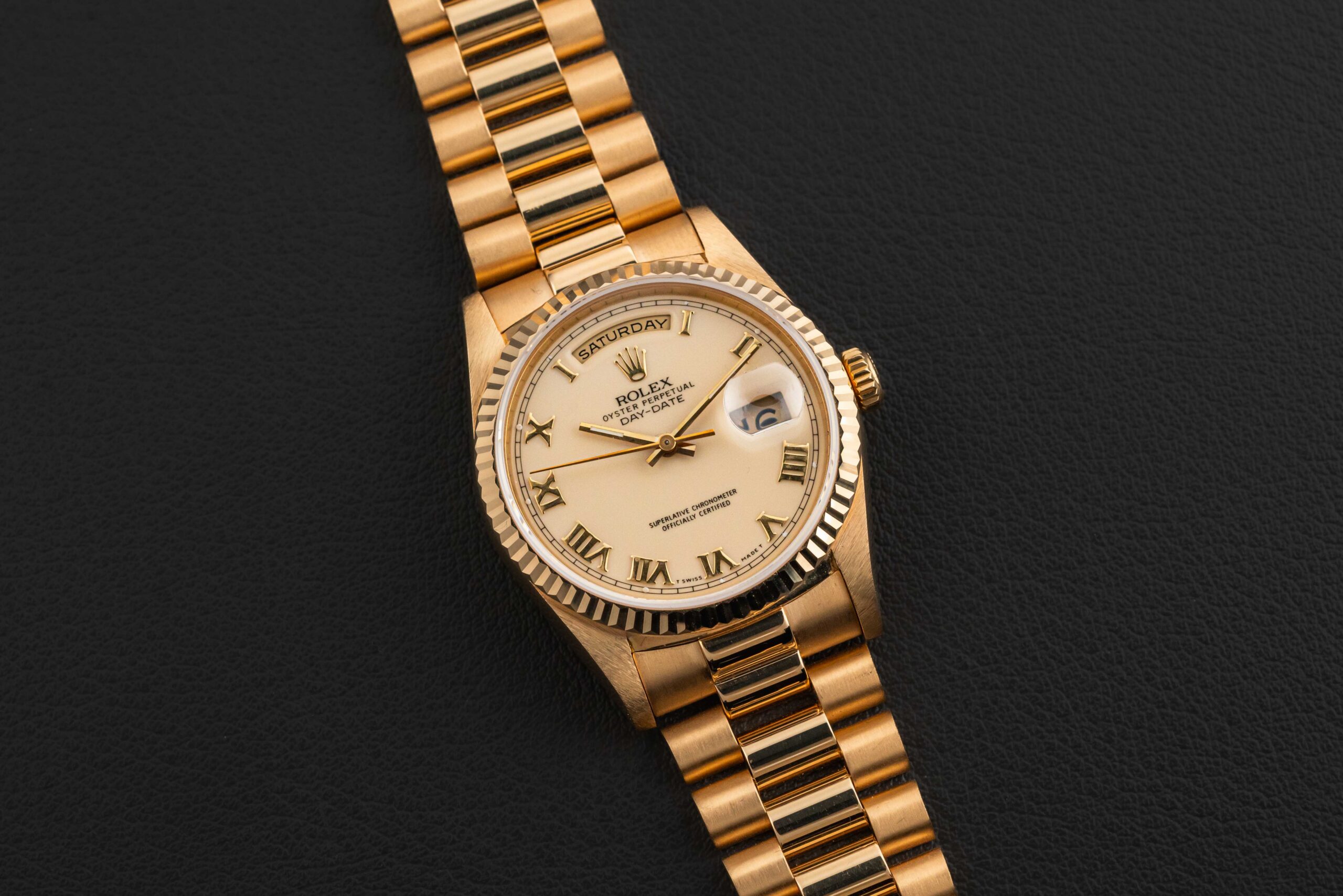 Up for grabs is a very beautiful and crisp Rolex Day-Date, reference 18238, circa 1993, in 18kt yellow gold, and in excellent condition – complete with its original Rolex box and Warranty Certificate (showing the original date of sale in Milan, Italy in 1998). This particular Day-Date sets itself apart from the rest due to its incredibly striking cream-hue aged dial with roman numeral indices. The condition of this Rolex Day-Date is impeccable, with a seemingly unpolished case (if it was ever polished, it was done lightly), and lovely dial, showing some minor loss to a couple of the lume plots on the dial. The bracelet is extremely tight, and has 5 removable screws (will fit an approximate 7.25″ wrist).