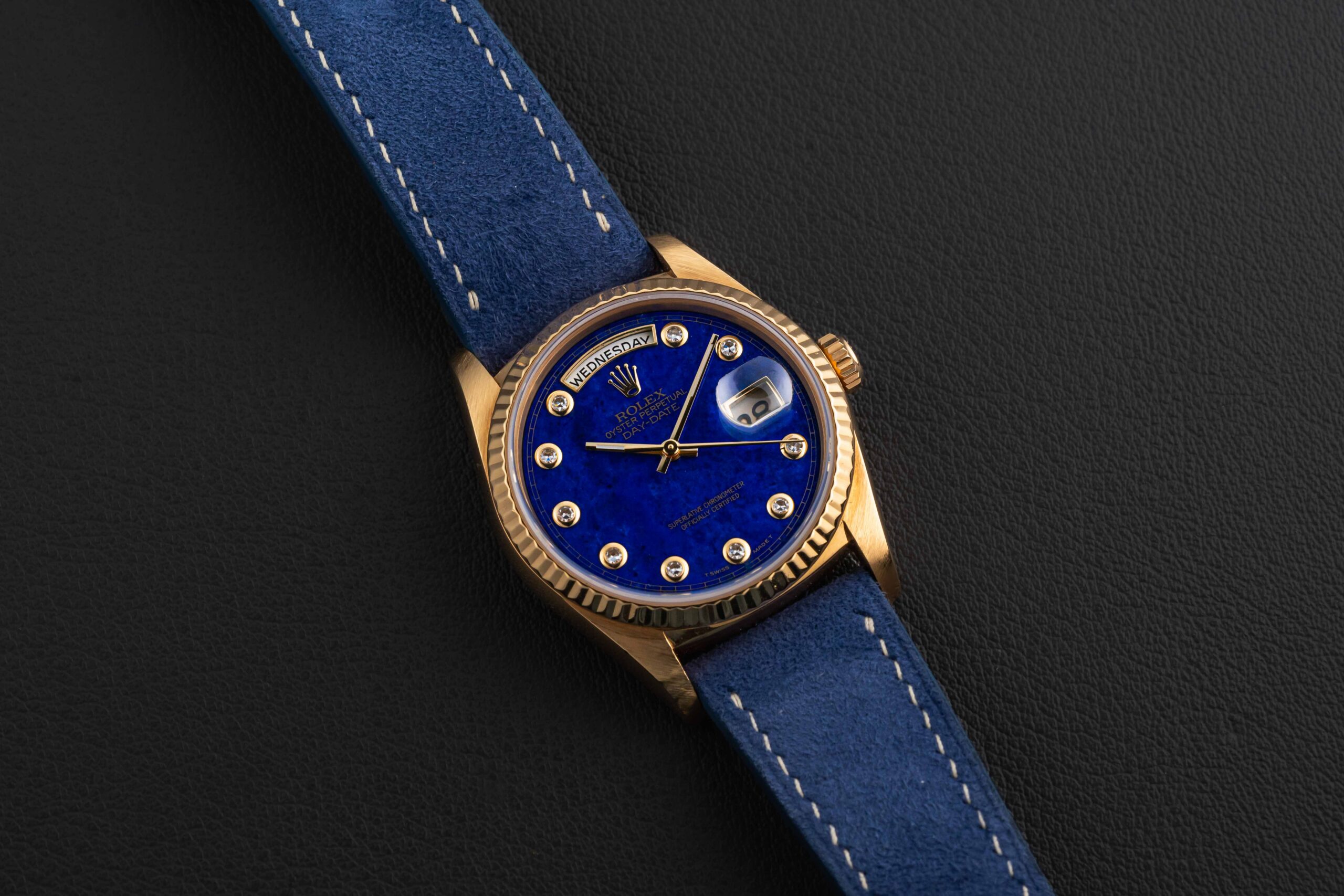 Up for grabs is a very beautiful, ornate and rare Rolex Day-Date, reference 18238, circa 1991-92. This particular Day-Date sets itself apart from the rest due to its incredibly striking factory Lapis Lazuli stone dial, accented by diamond “pinball” markers. Further, this watch comes complete as a full-set, including its original Rolex box, “punched” Guarantee Certificate (originally sold by Wempe in October of 1992), and RSC card, serviced by Rolex in 2019.