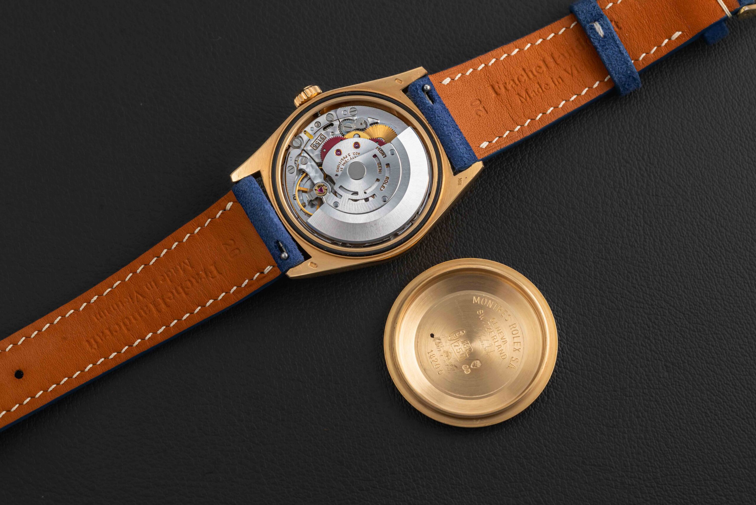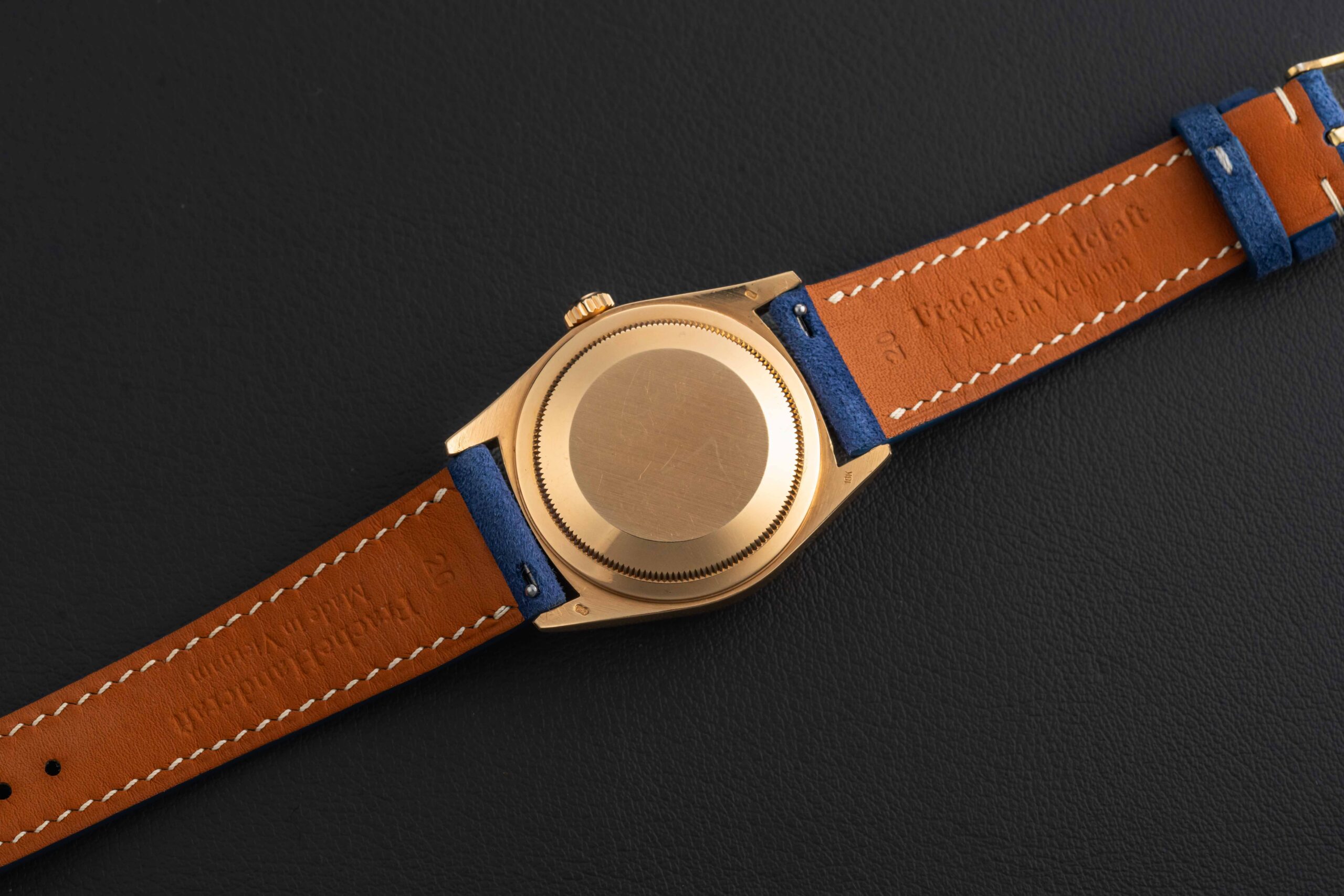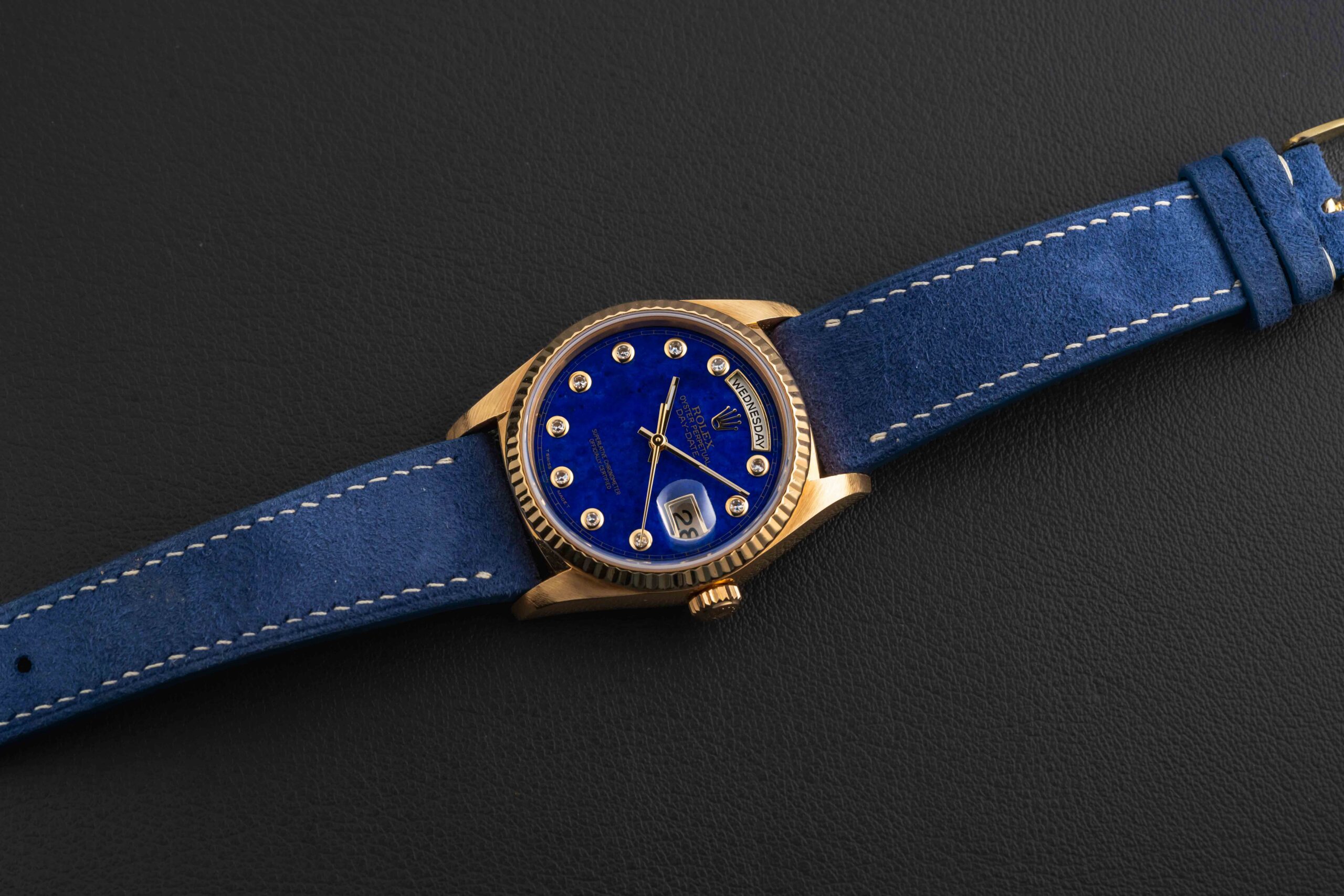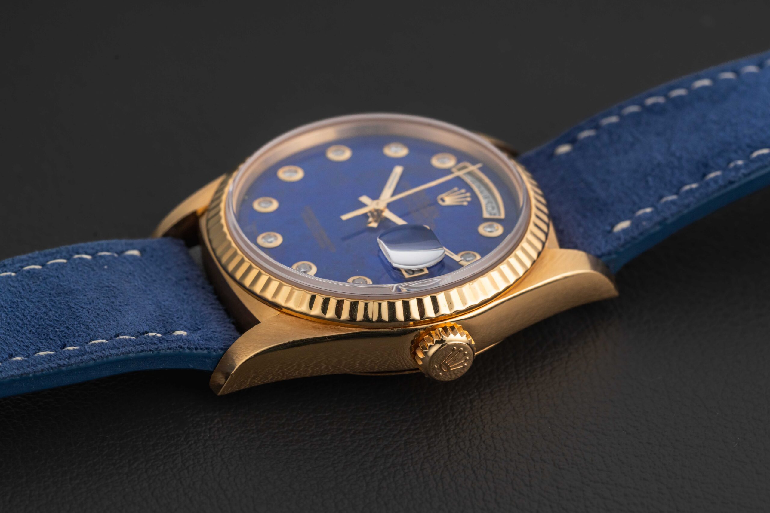 The condition of this Lapis Rolex Day-Date is excellent. The case is sharp, with thick and even lugs, likely very lightly polished in the past. The dial is devoid of any major flaws or cracks.