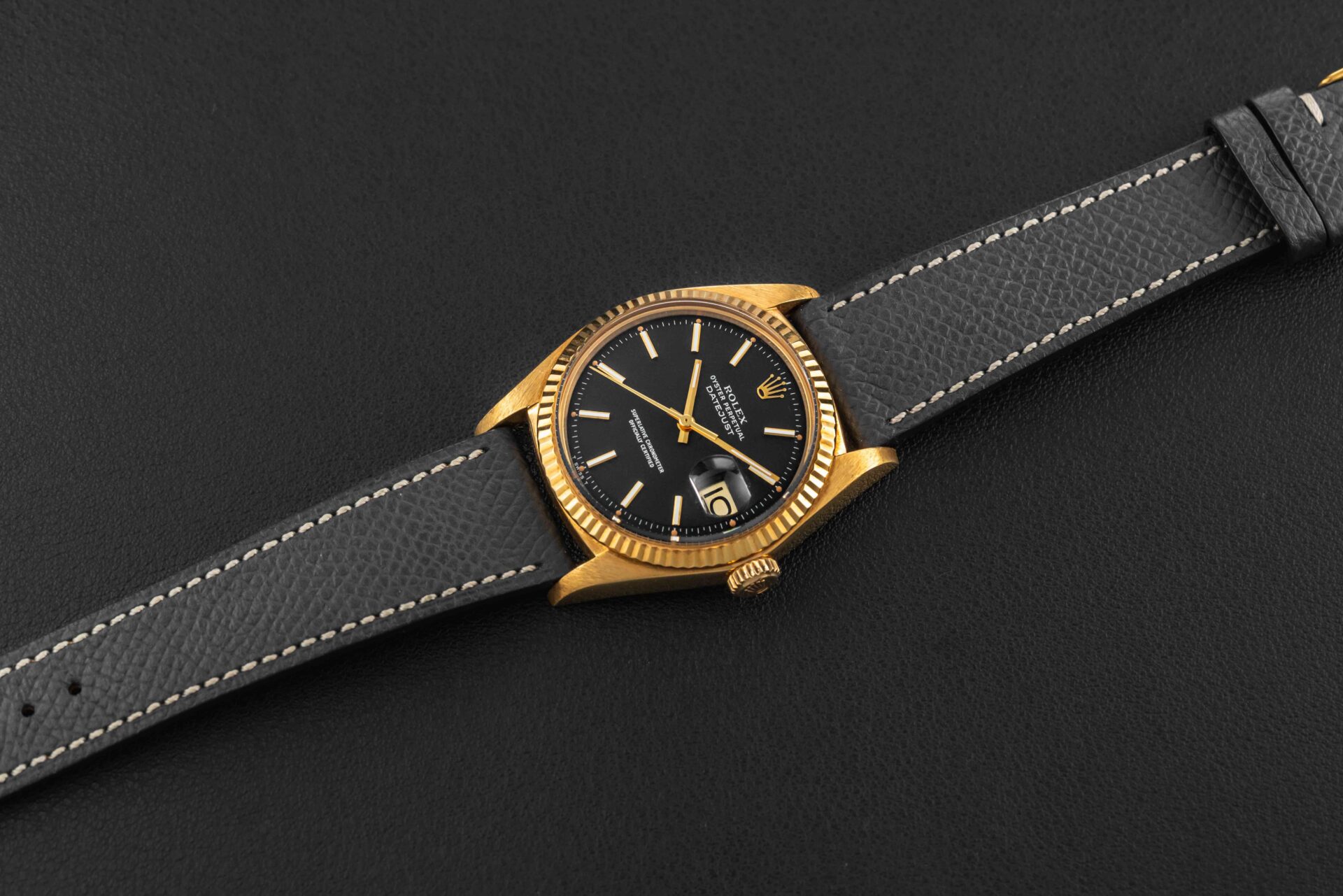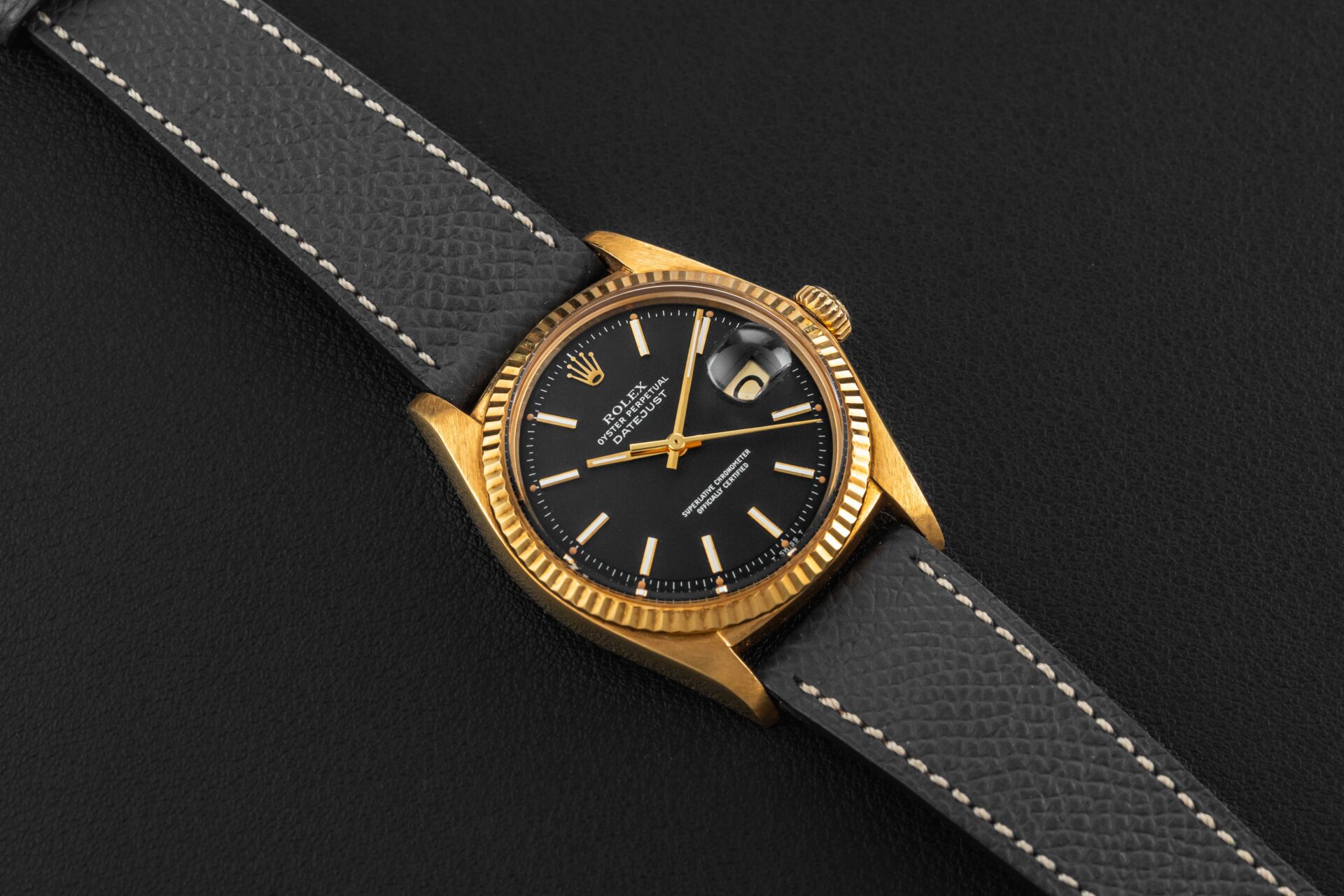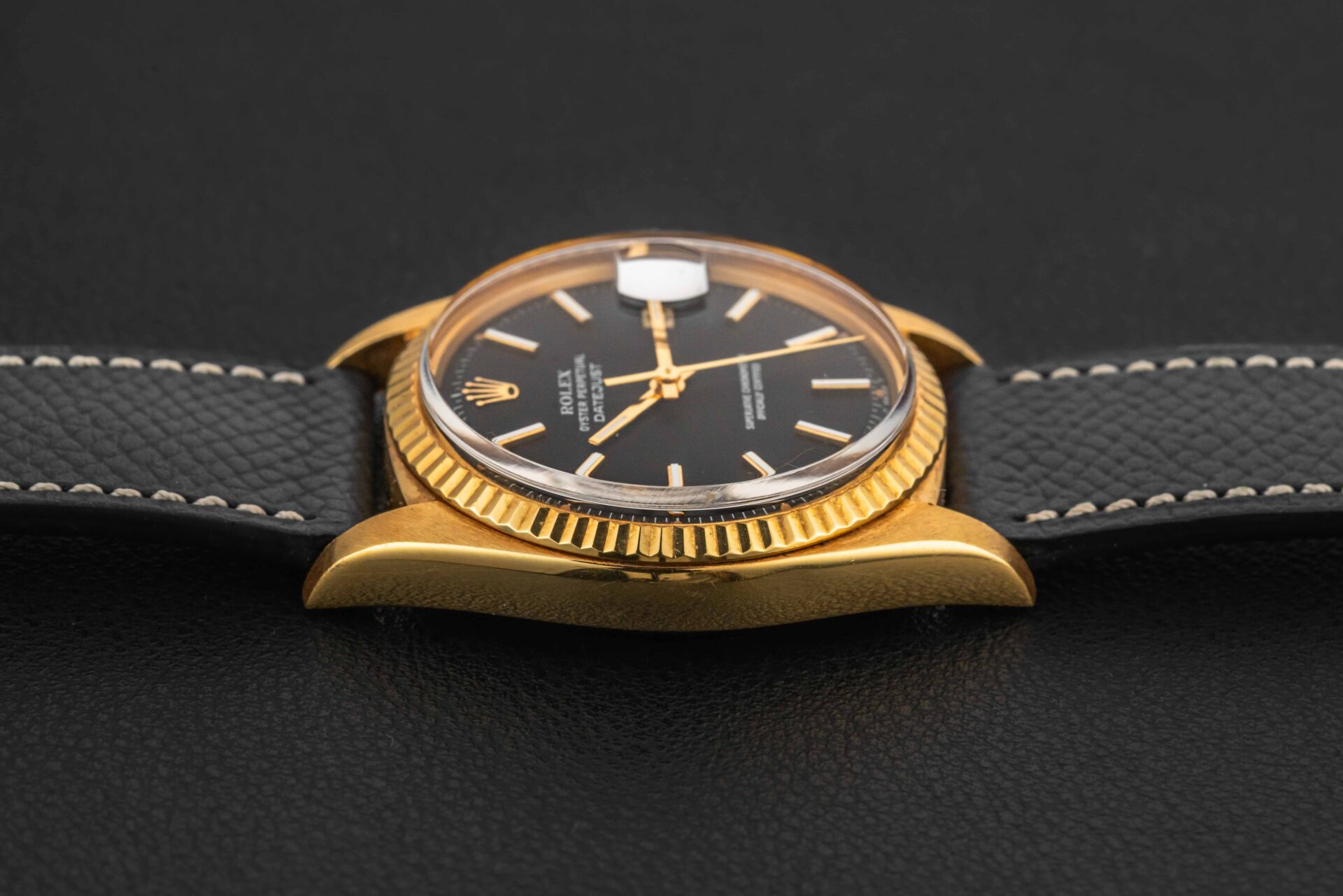 Up for grabs is a stunning Rolex Datejust, cased in 18kt yellow gold, circa 1974-75, fitted with a rare matte black dial. Further, this Rolex Datejust remains complete, with its original Rolex box, “punched Warranty Certificate (originally sold in Singapore in 1977), and Datejust booklet.