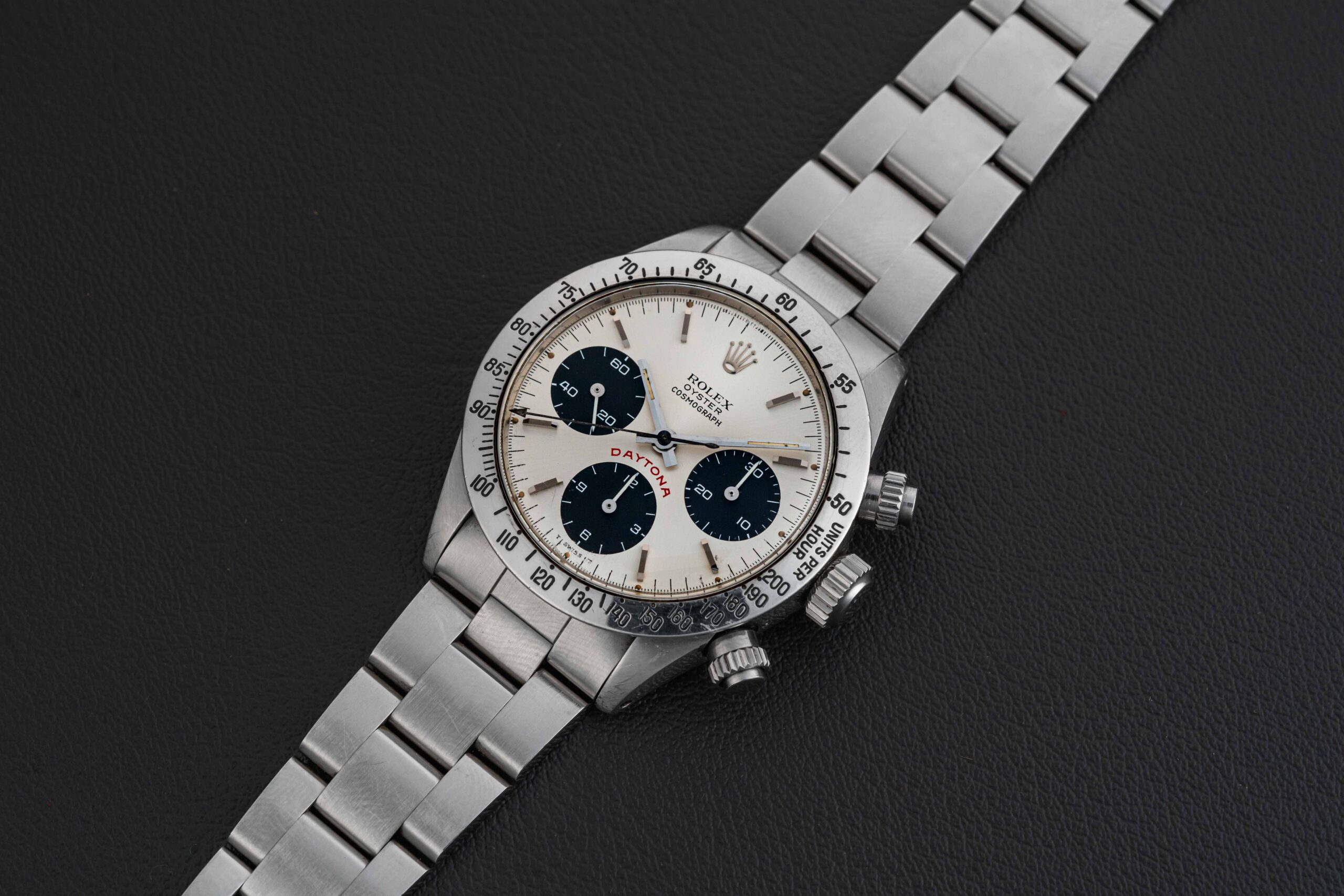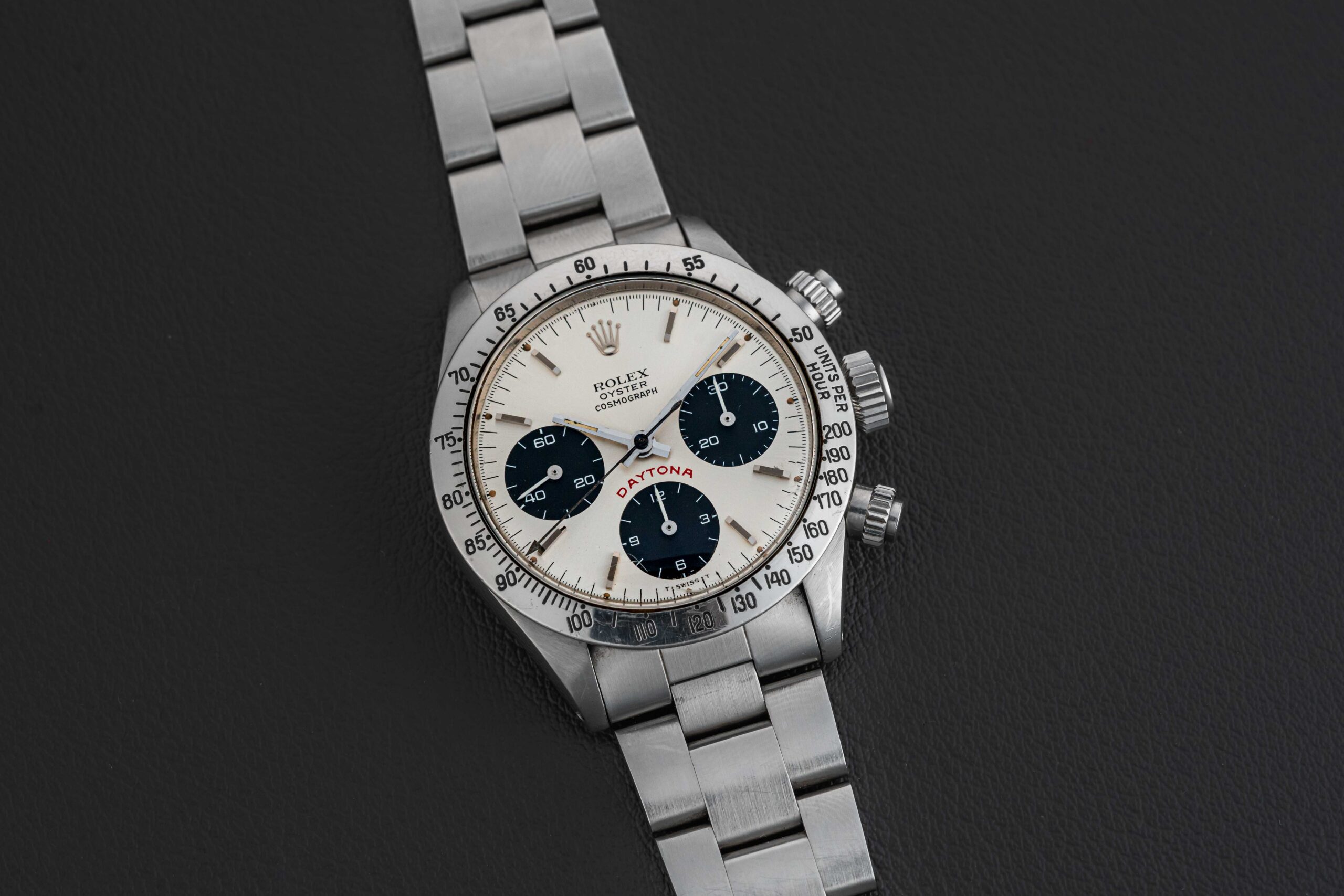 Offered here is a beautiful example of Rolex Daytona, Ref. 6265 (circa 1974; 3.9m serial), nicknamed the “Big Red” Daytona, due to the printing of “Daytona” in bright red letters in the center of the dial. This example is outfitted with a panda-silver dial, and features screwdown pushers. This particular Rolex Daytona comes complete with its original Rolex box (missing the inner cushion) and its original “punched” Warranty Certificate, originally sold in 1976.