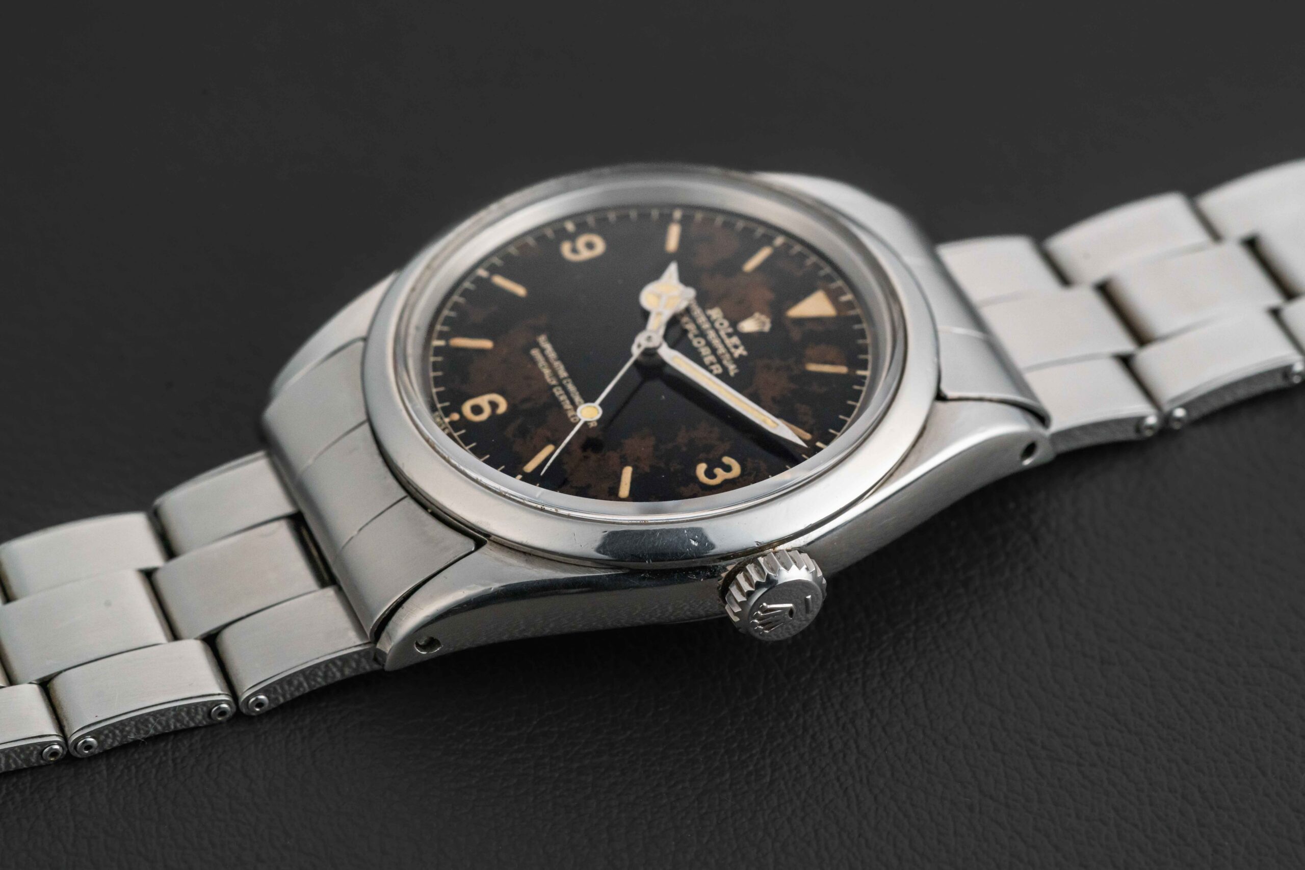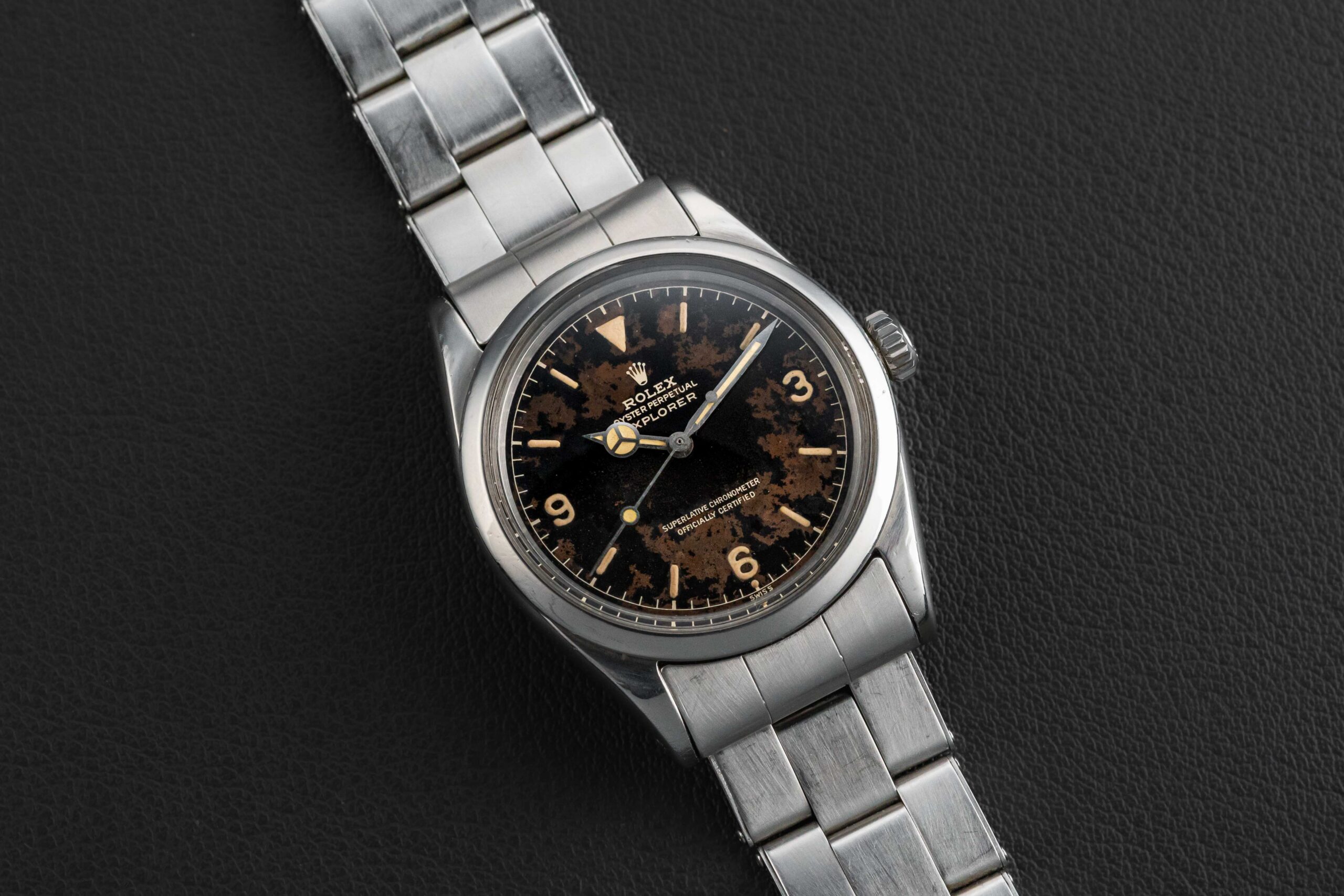 This Rolex Explorer is in very nice vintage condition. The case has been previously polished, but shows thick and even lugs. The gilt dial is well preserved and still glossy, showing no damage, and aged with a stunning and unique patina, giving this Explorer a truly stand-out appearance from the rest. The original lume is in-tact and preserved on the dial, aged to a golden yellow color; the hands have been professionally color-matched to the dial. Finally, the watch is fitted on a Rolex C&I stretch-rivet bracelet, dated to 1969, and has 12 full links with no stretch.
