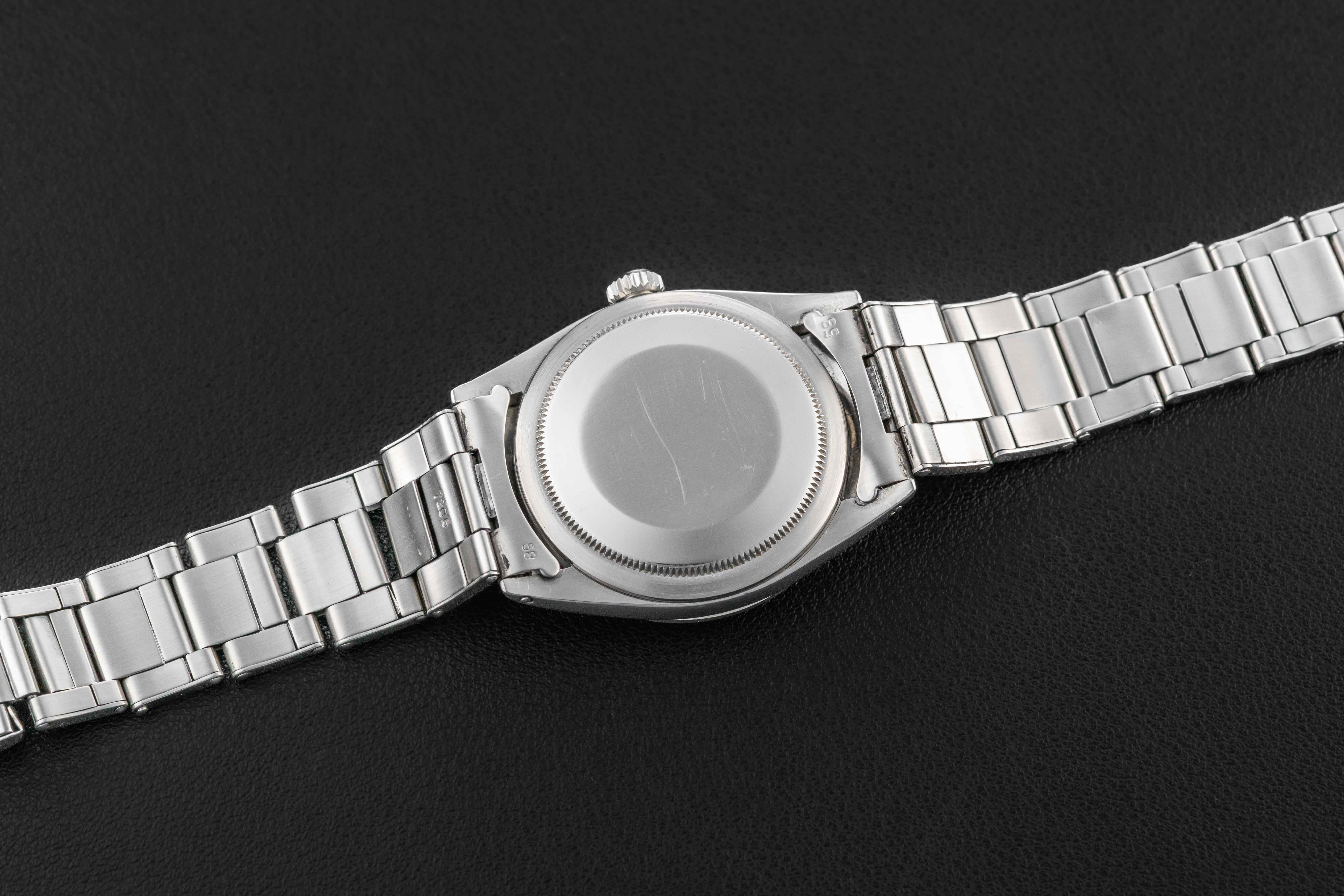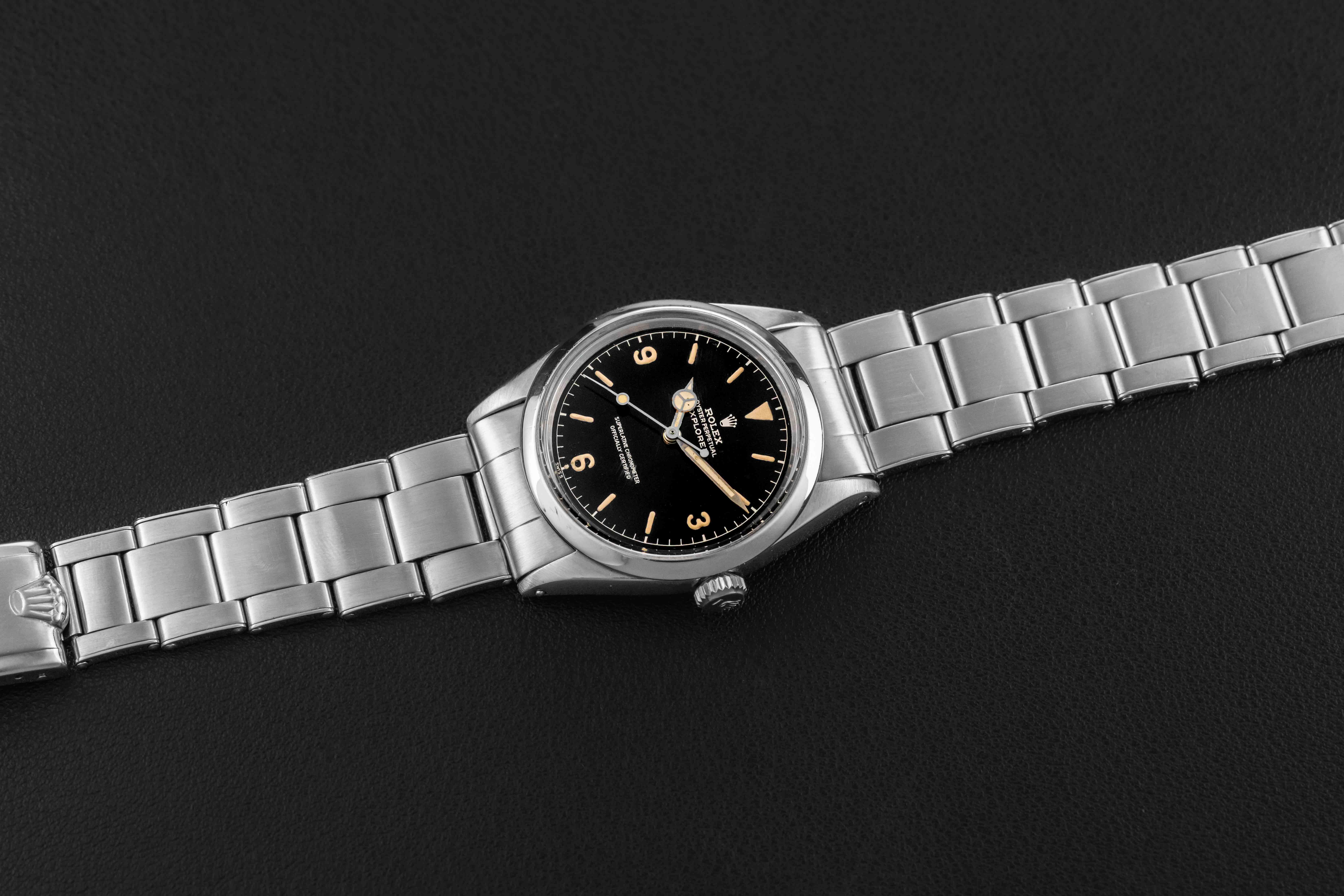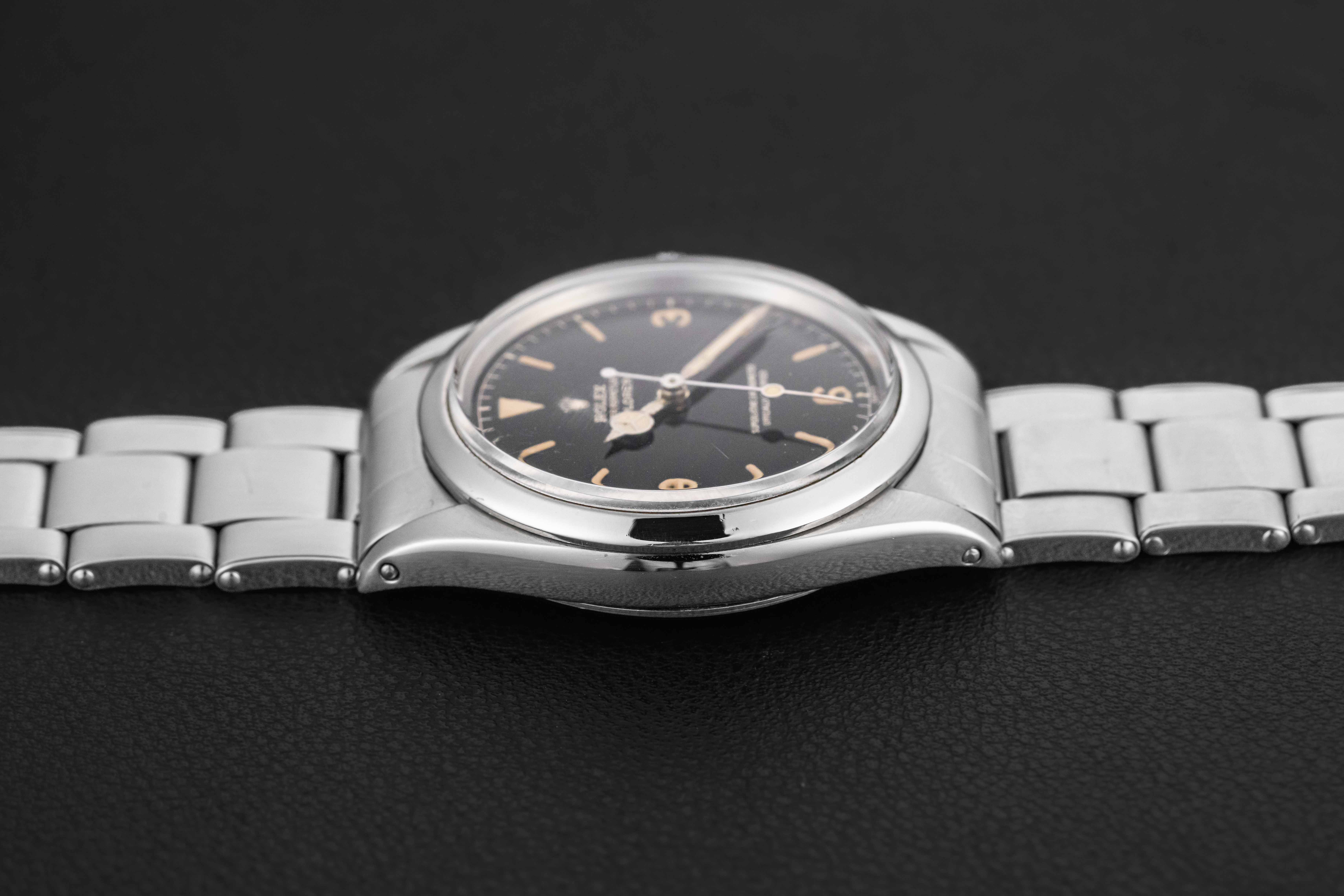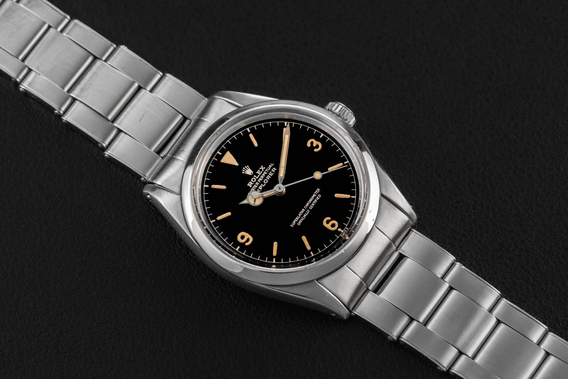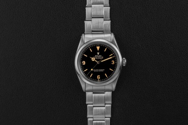 This Rolex Explorer is in very nice vintage condition. The case has been previously polished, but shows thick and even lugs. The gilt dial is well preserved and still glossy, showing no damage.. The original lume is in-tact and preserved on the dial and hands, aged to a golden yellow color. Finally, the watch is fitted on a Rolex Swiss Rivet 7206 bracelet with 58 endlinks and dating to 1962, and has 12 full links with very modest stretch.