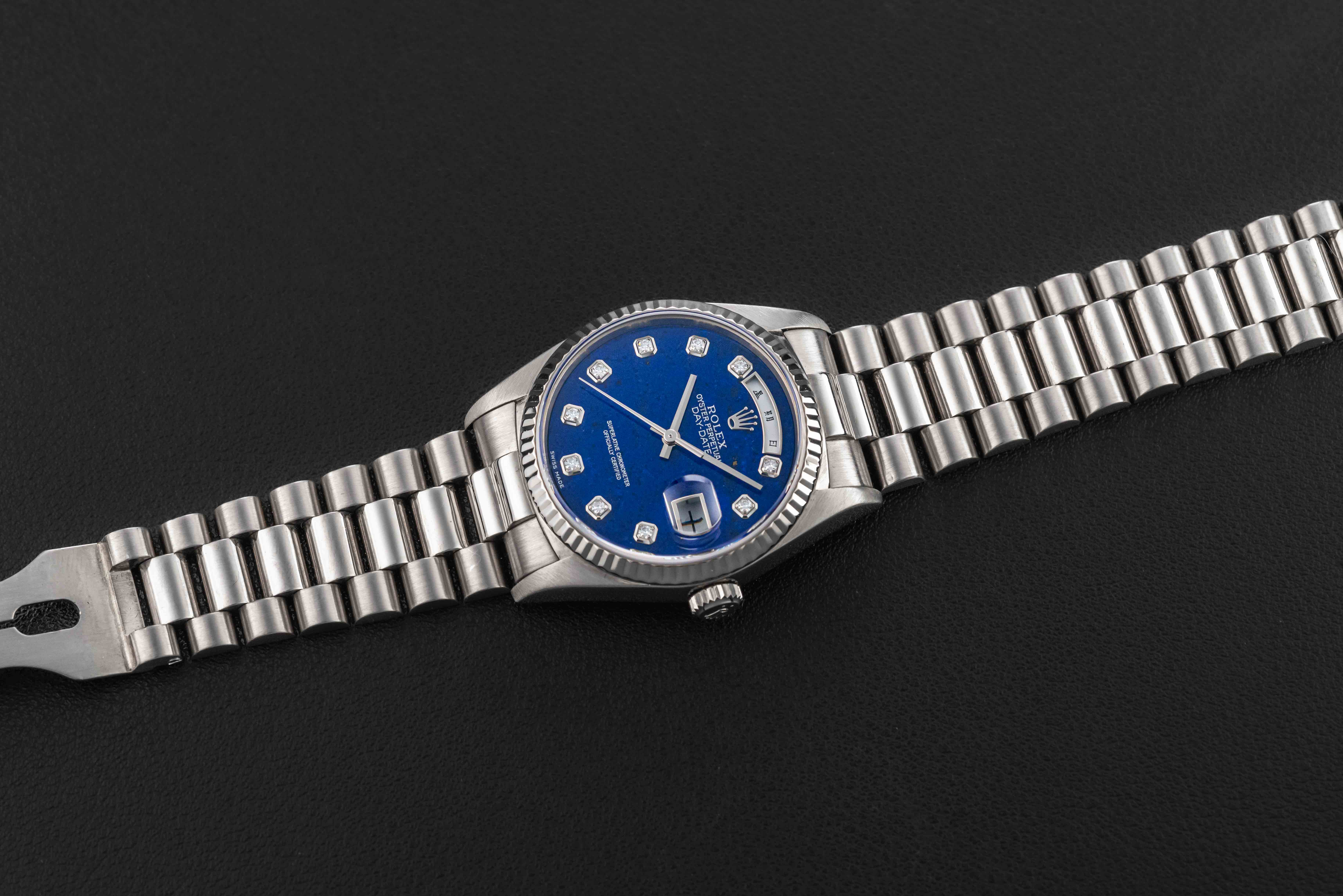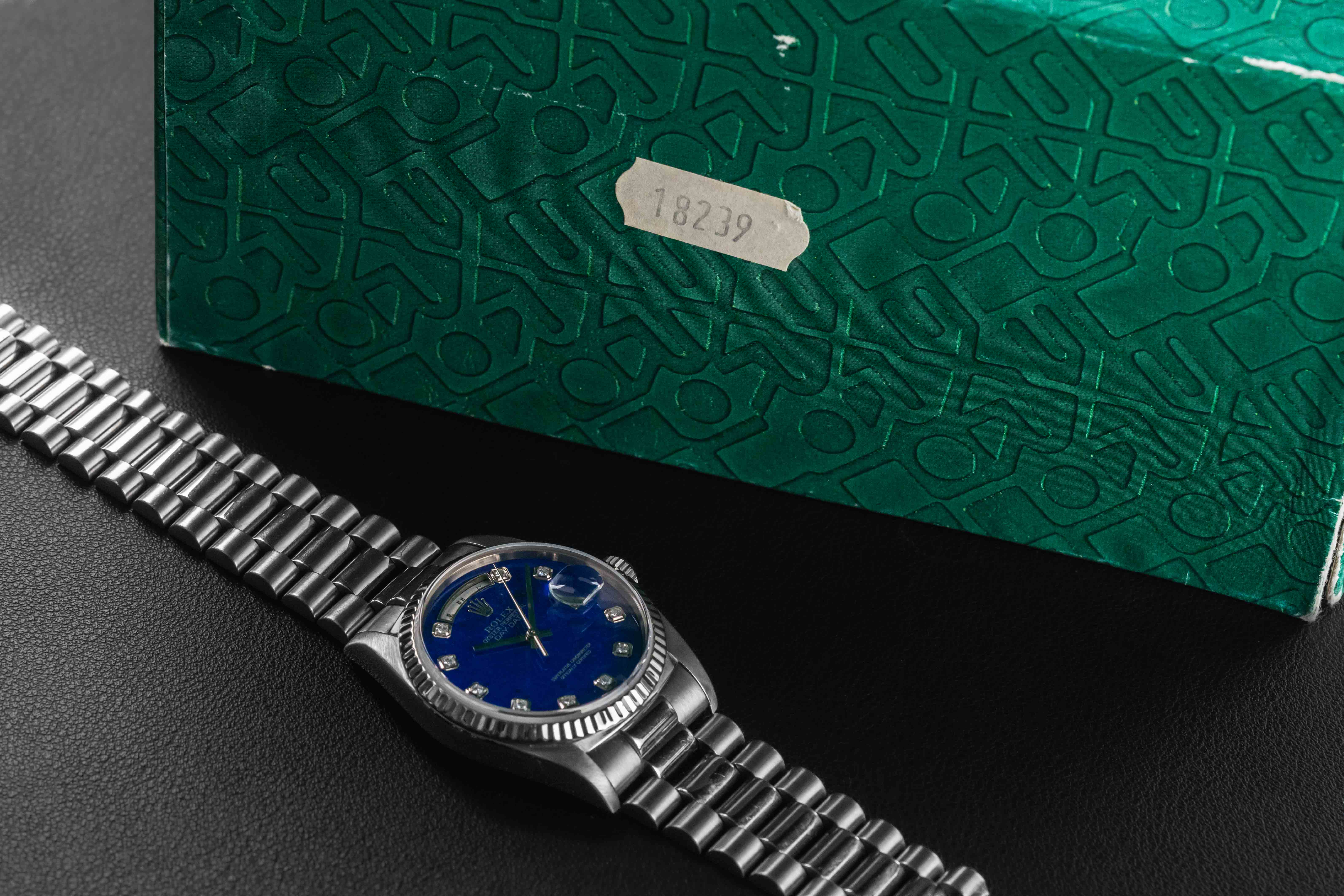 Up for grabs is an uncommon Rolex Day-Date, Ref. 18239, in 18kt white gold. This particular Rolex Day-Date was fit with an uncommon and rarely seen lapis lazuli stone dial, accented by diamond markers. Further, this watch comes with its original Rolex box (with original 18239 sticker) and associated booklets, as shown in the photos.