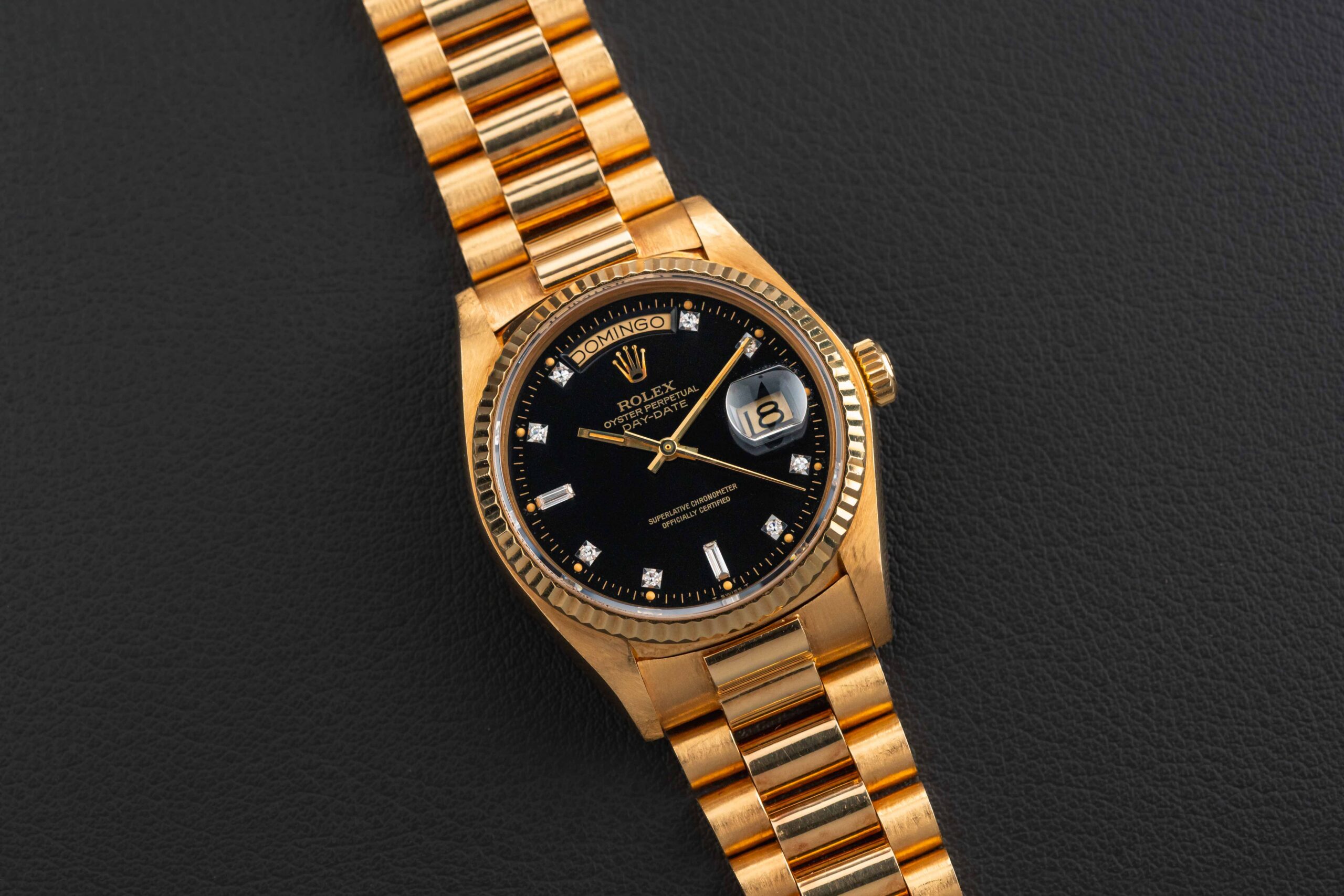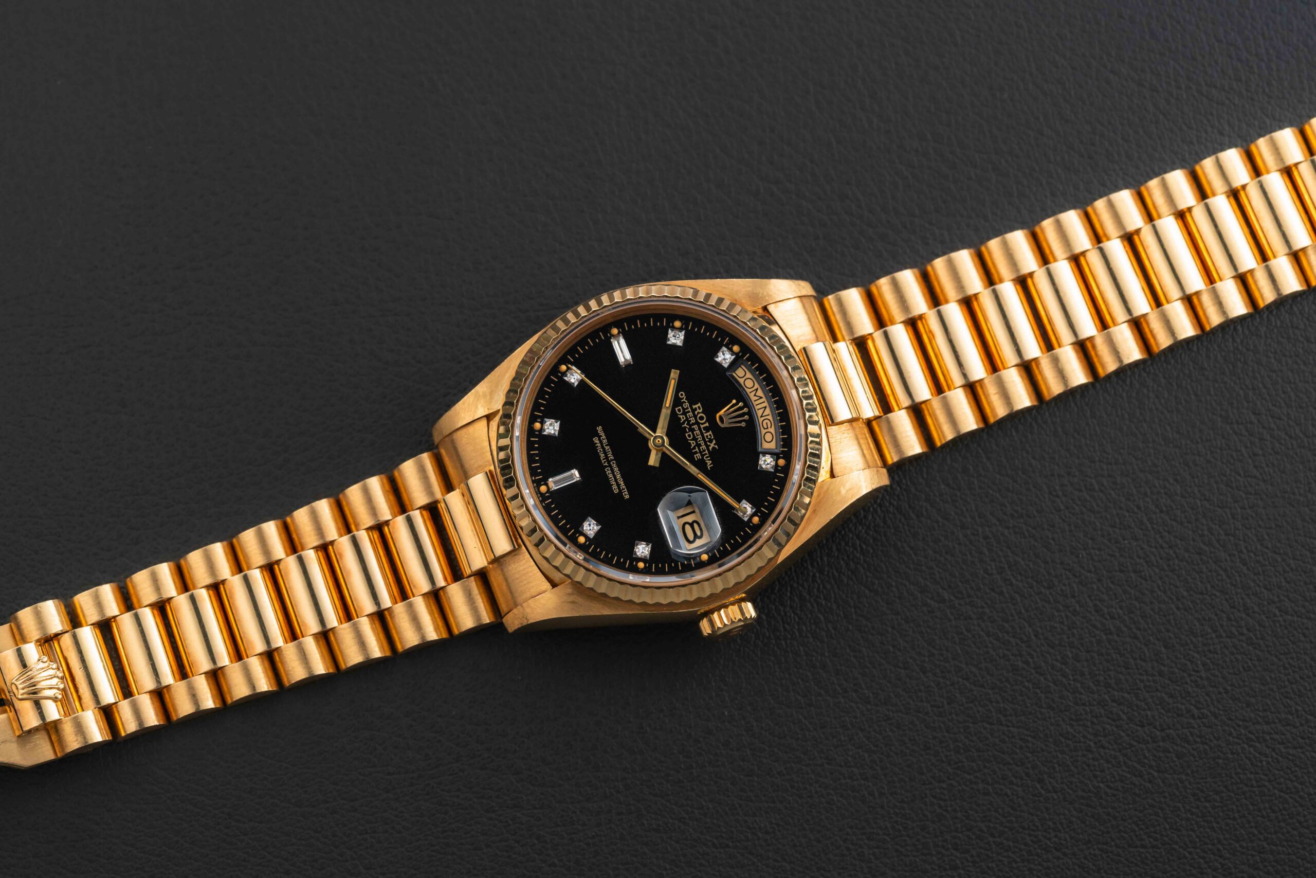 Up for grabs is an uncommon Rolex Day-Date, Ref. 18038, with a factory black gloss diamond dial. This example dates to 1990, and remains with its original Rolex box, booklets, and original sales receipt.