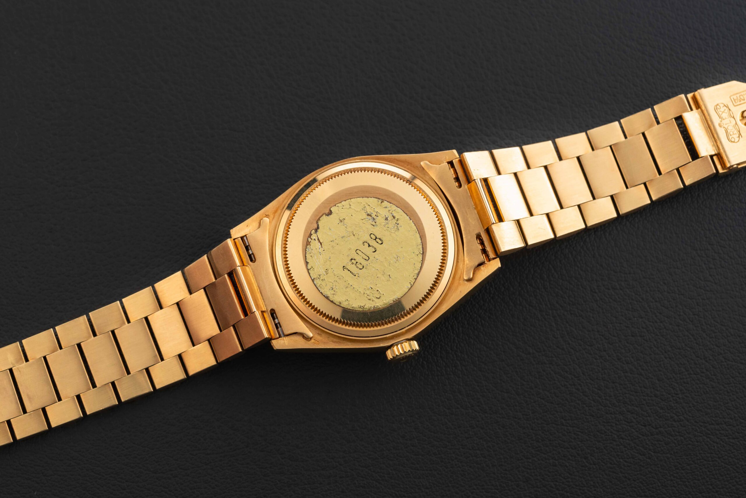 The condition of this Rolex Day-Date is excellent, seemingly barely used. The case is unpolished and sharp, retaining its original caseback sticker, and showing a beautiful patina/tarnish on the bracelet. The dial remains perfect, with no cracks or imperfections.