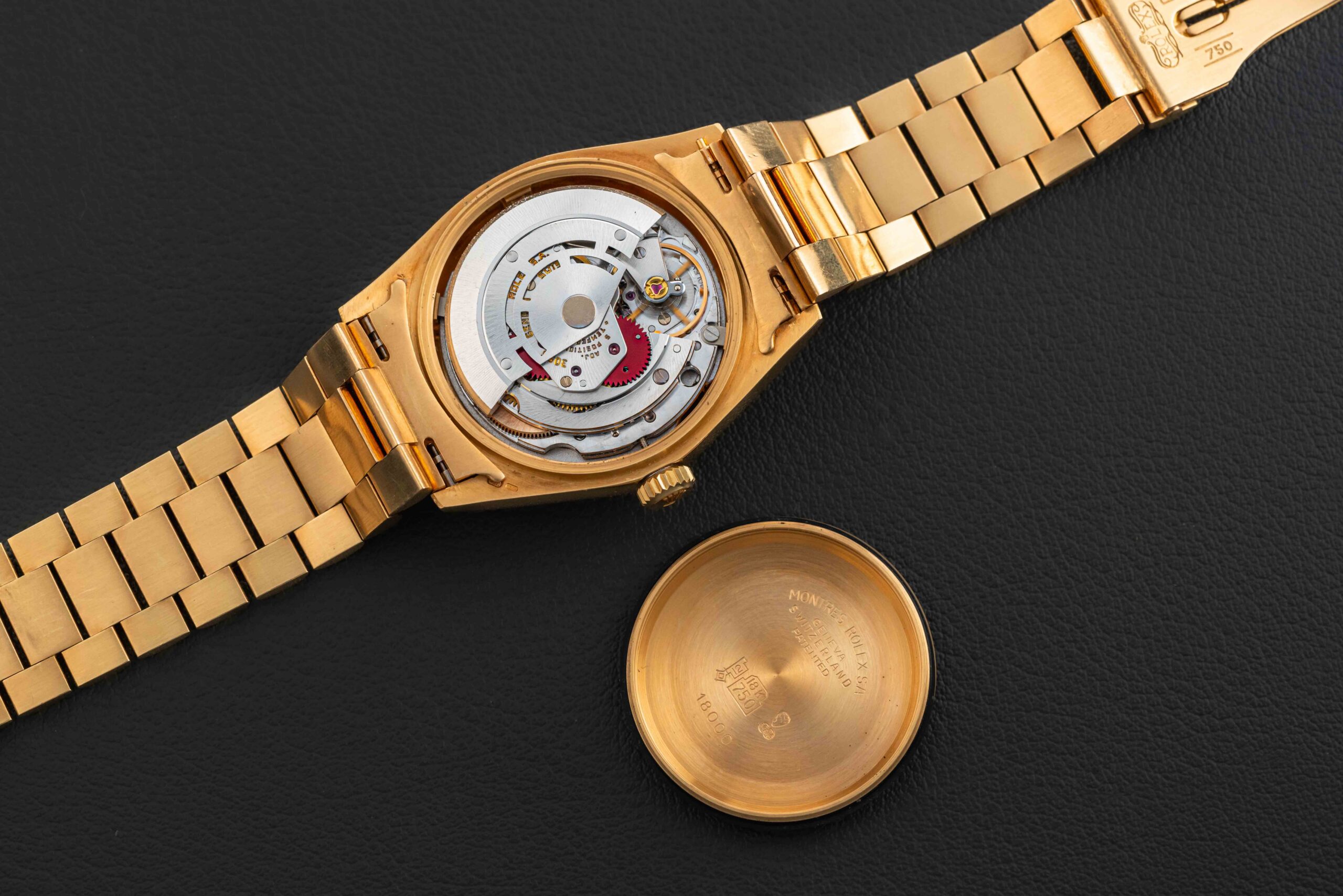 The watch comes on its original hidden-clasp 18kt Rolex D’Agosto bracelet, with no stretch, and will fit an approximate 7.25″ wrist.