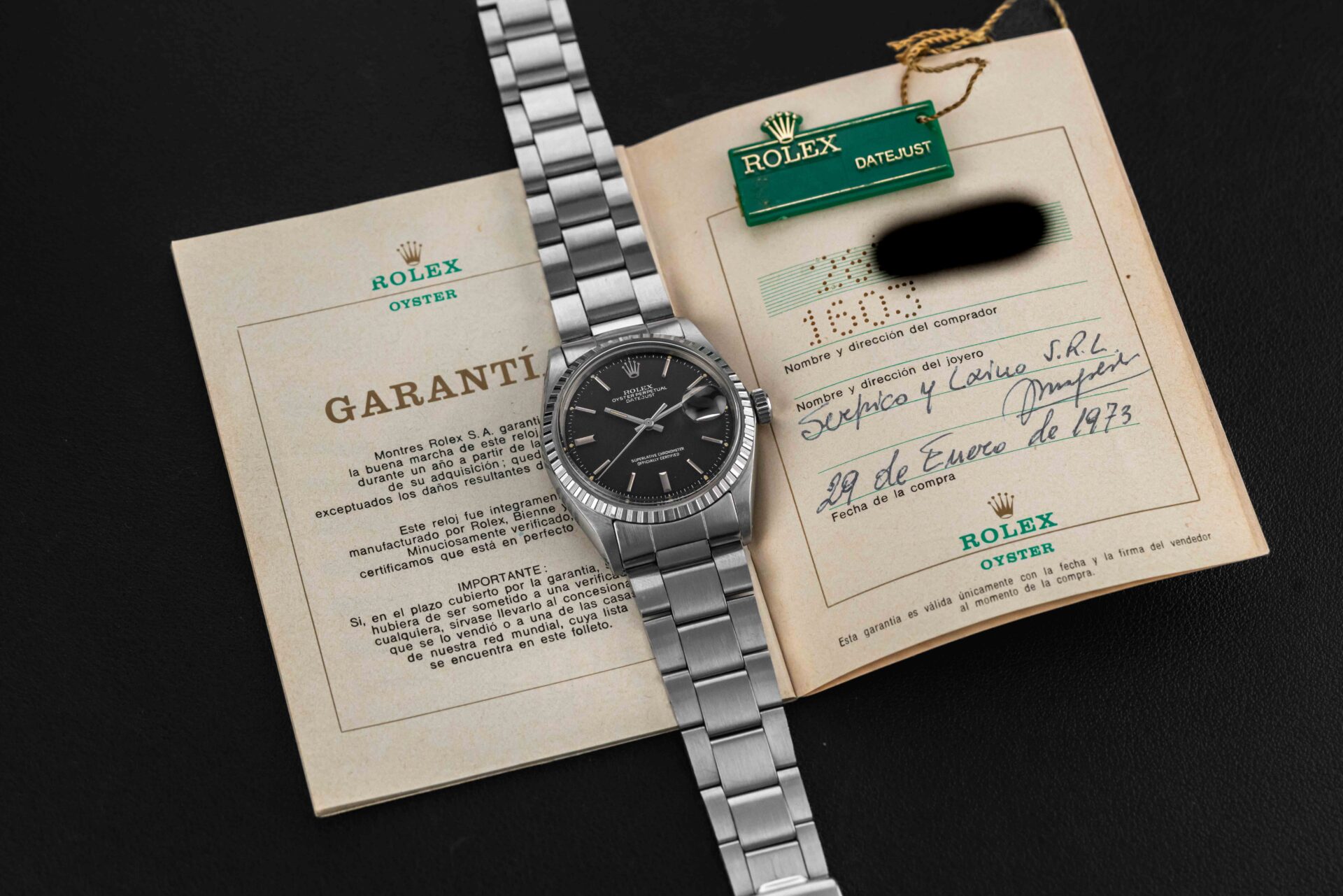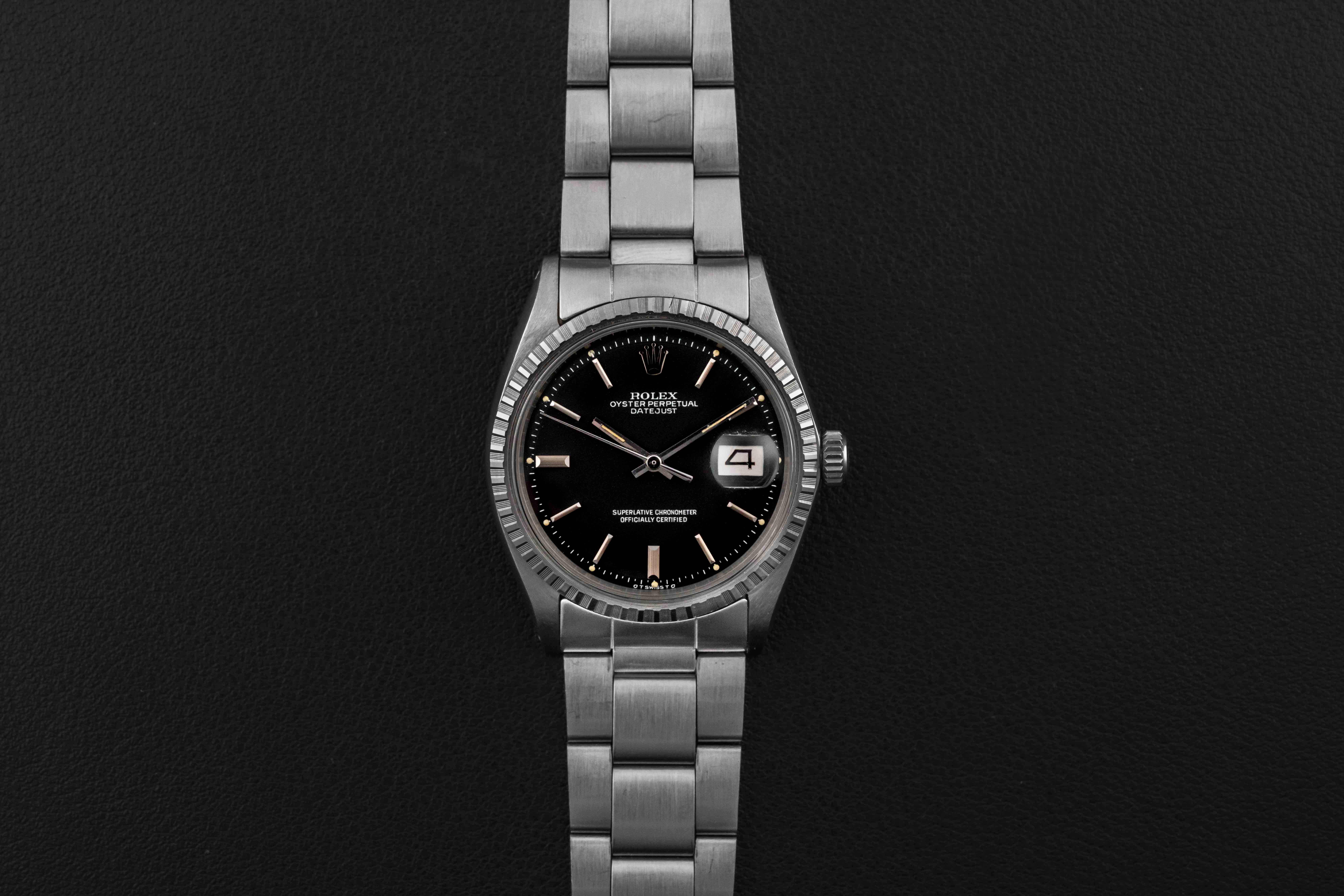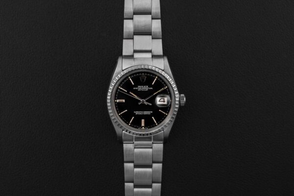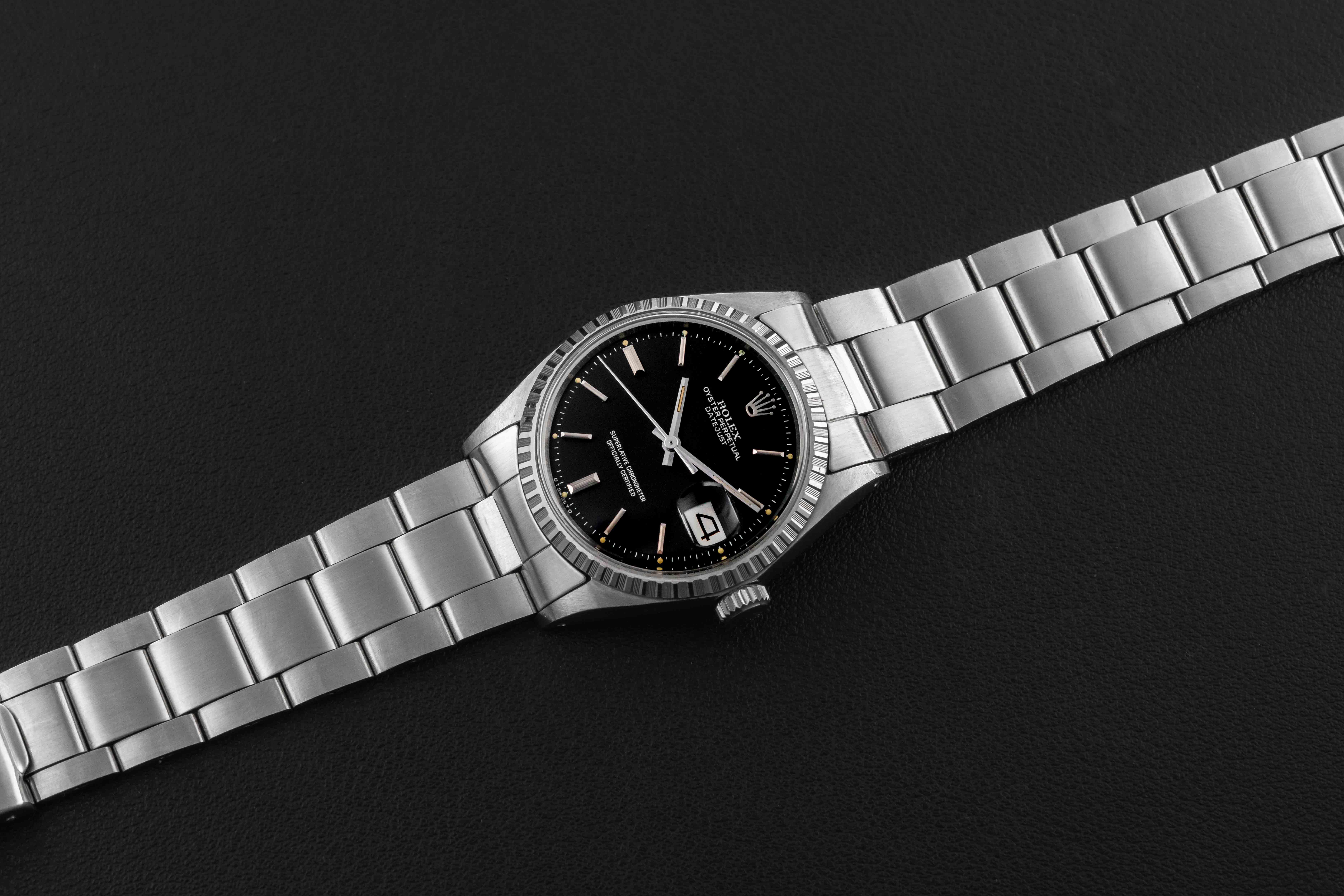 Up for grabs is a stunning example of a Rolex Datejust, Ref. 1603, circa 1970. This Datejust features a fluted bezel, and a rare black dial. Further, it comes complete with its original Rolex box and “punched” papers, showing the original point of sale by Serpico Y Laino in Venezuela in 1973.