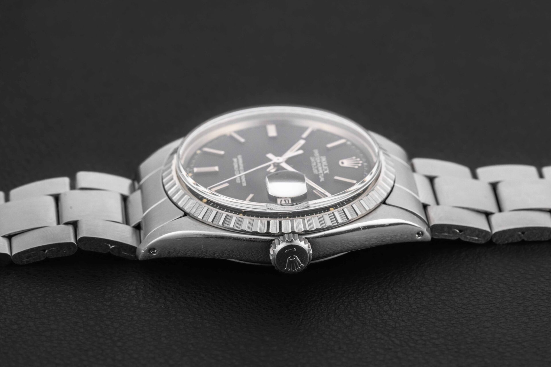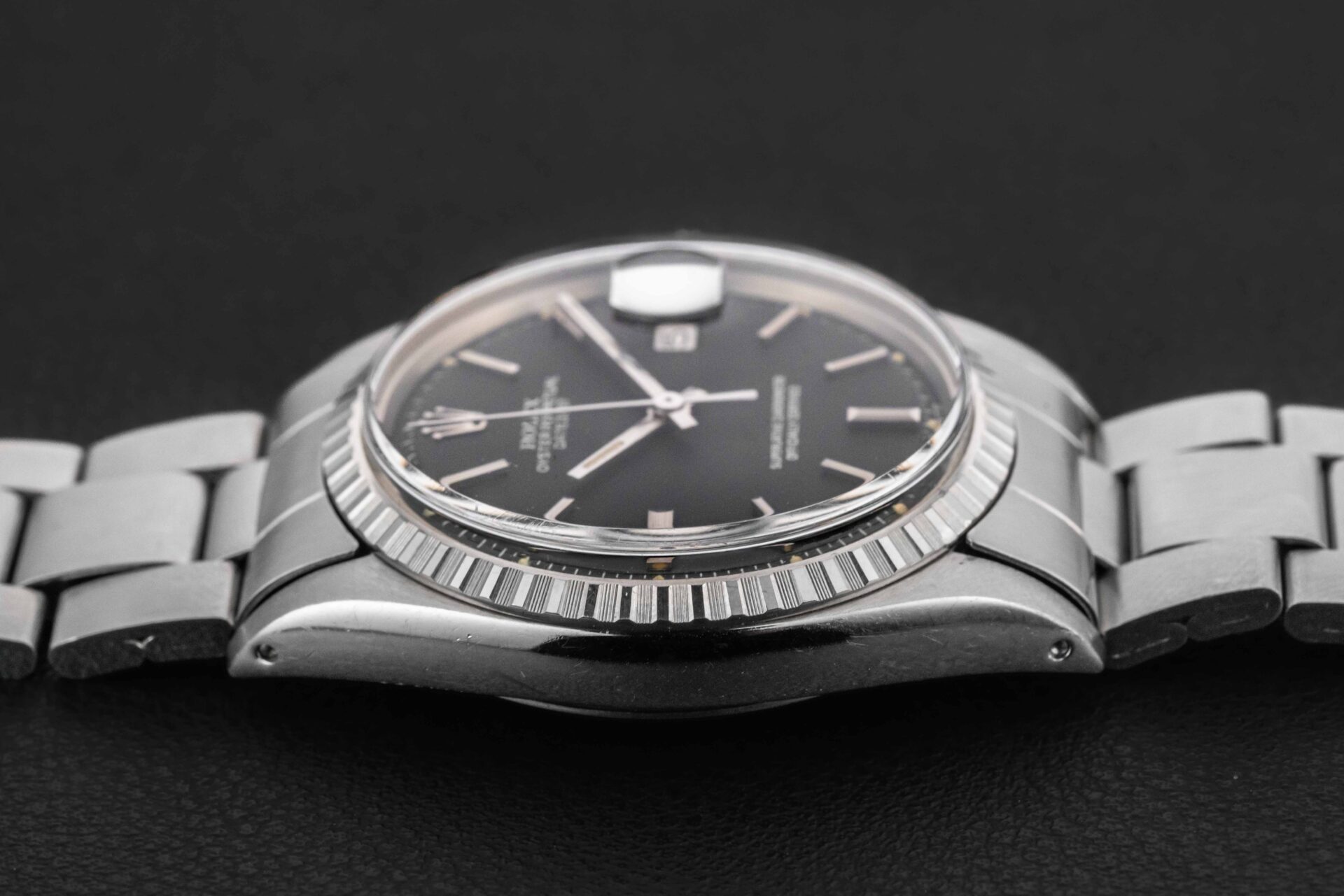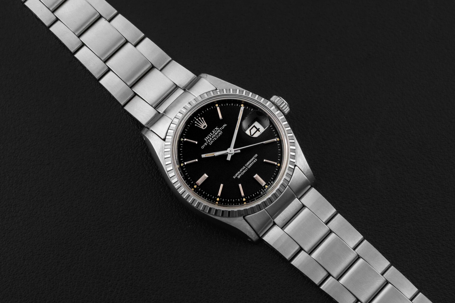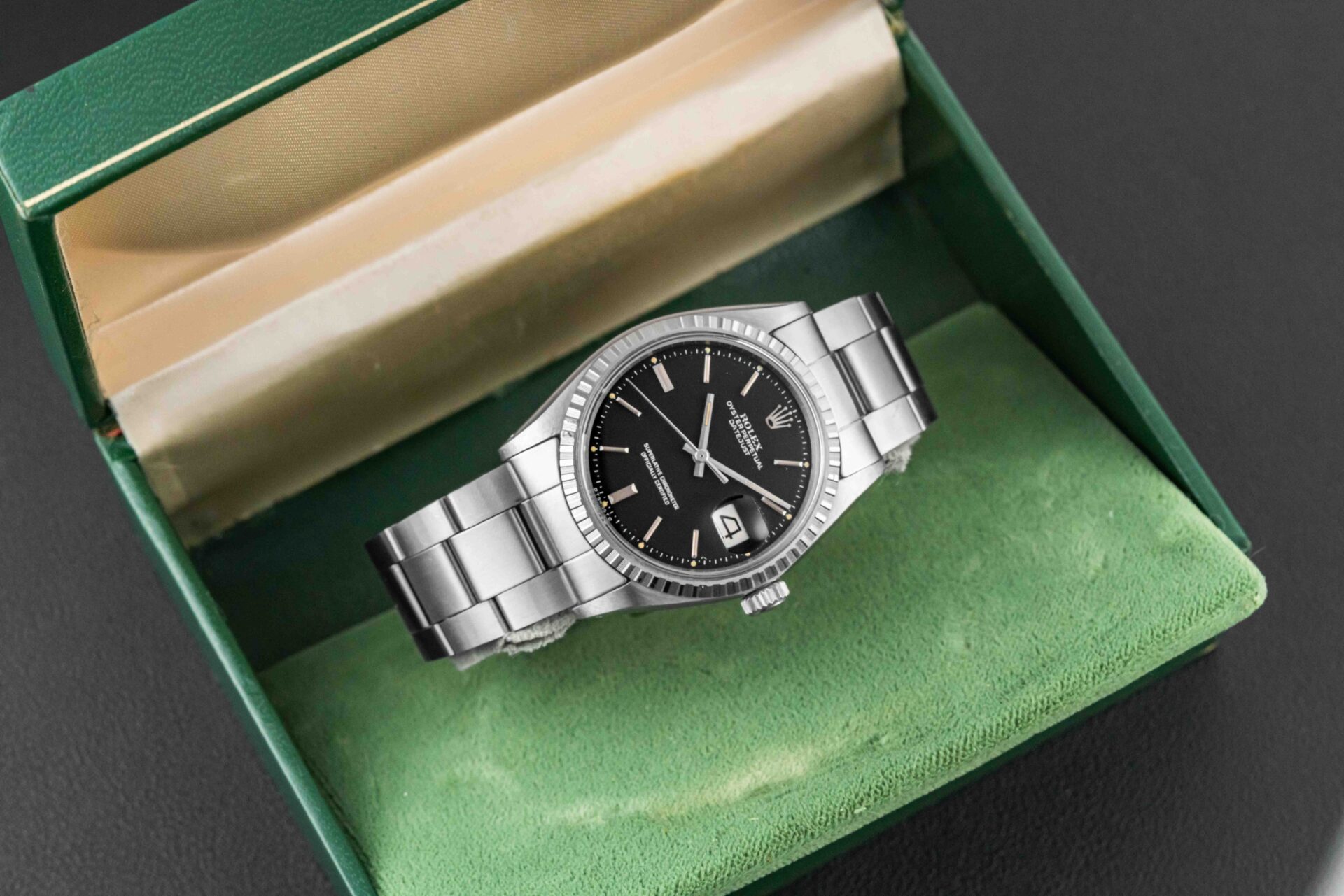 Up for grabs is a stunning example of a Rolex Datejust, Ref. 1603, circa 1970. This Datejust features a fluted bezel, and a rare black dial. Further, it comes complete with its original Rolex box and “punched” papers, showing the original point of sale by Serpico Y Laino in Venezuela in 1973.