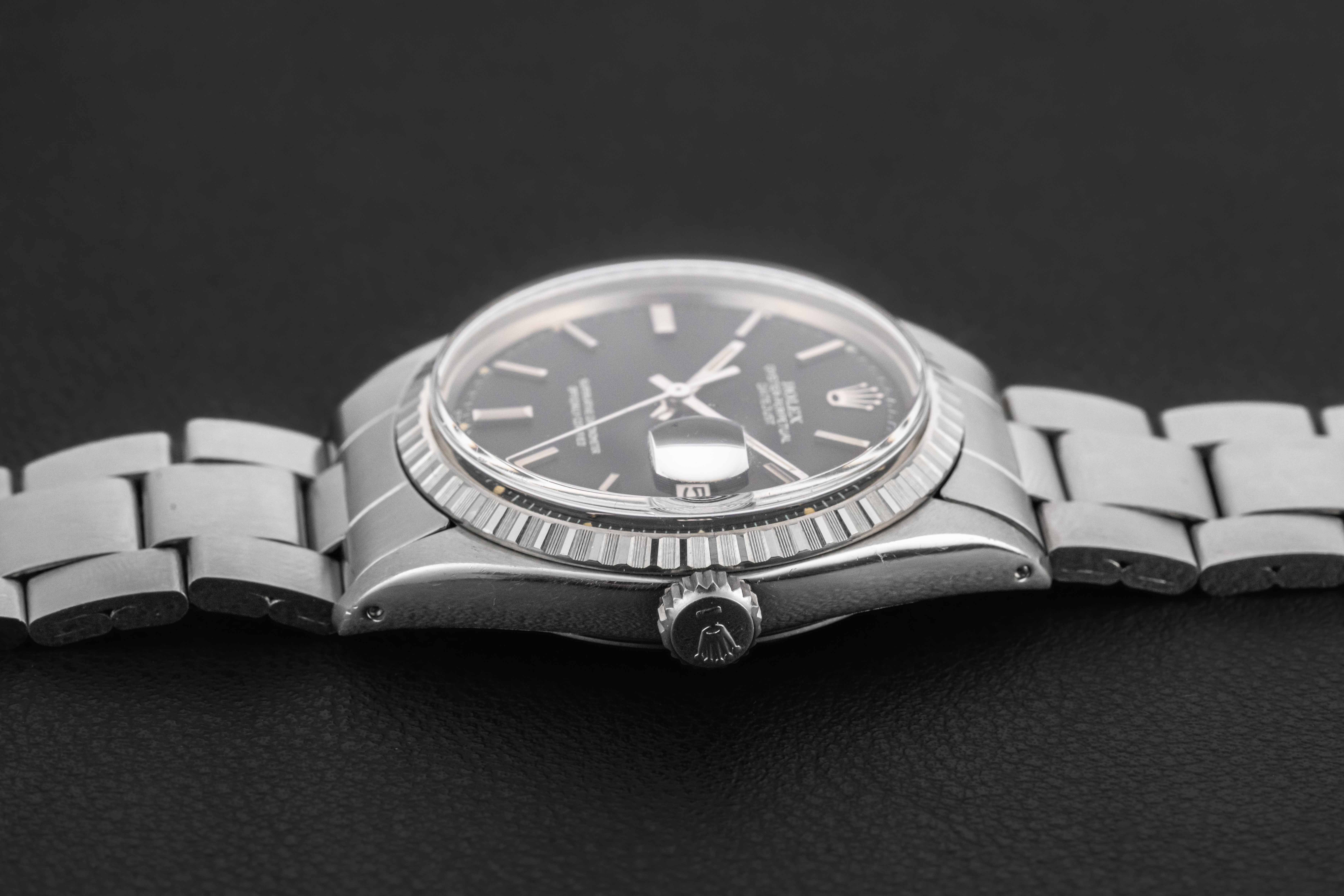 The condition of this Rolex Datejust is excellent. The case is unpolished and retains its original caseback sticker. The dial is beautiful, with no wear; likewise the original tritium lume is present on both dial and hands, with no loss, and aged to a lovely yellow color. The watch comes fitted on a Rolex Swiss folded-link 7836 bracelet with 280 endlinks, and has 12 full links with no stretch.