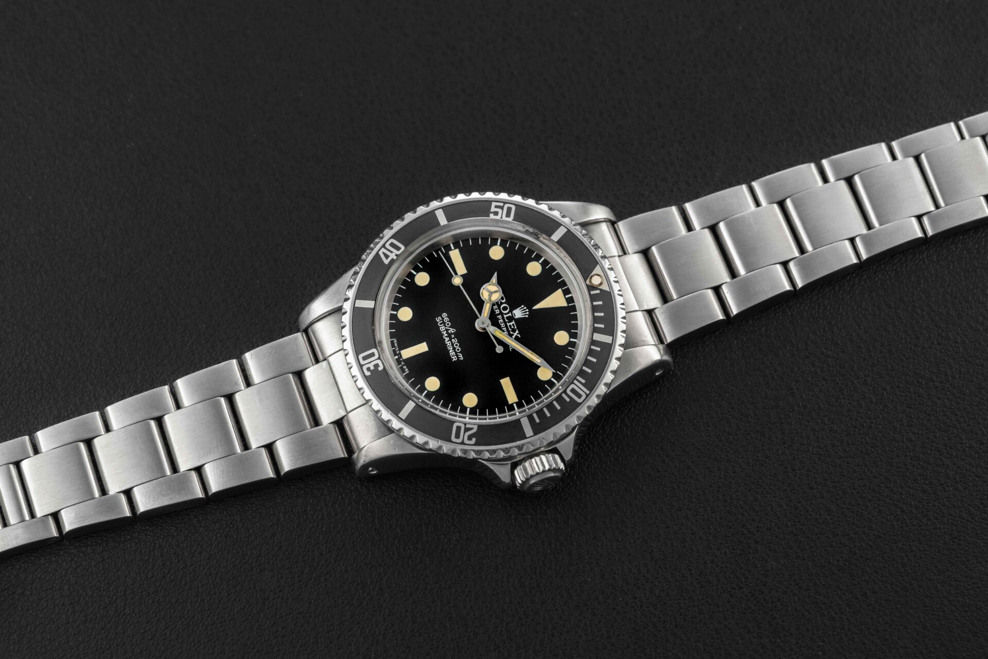 This Rolex Submariner is in nice vintage condition. The case has been lightly polished in the past, retaining thick and even lugs. The dial is immaculate, with no chips, scratches, or major flaws. The original tritium lume is present on both dial and hands, aged to a lovely yellow color. The MK3 bezel insert is period correct to this reference, and is in good condition, with no major wear.