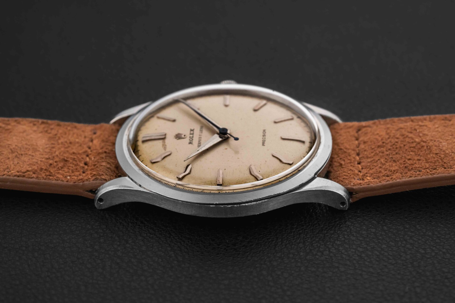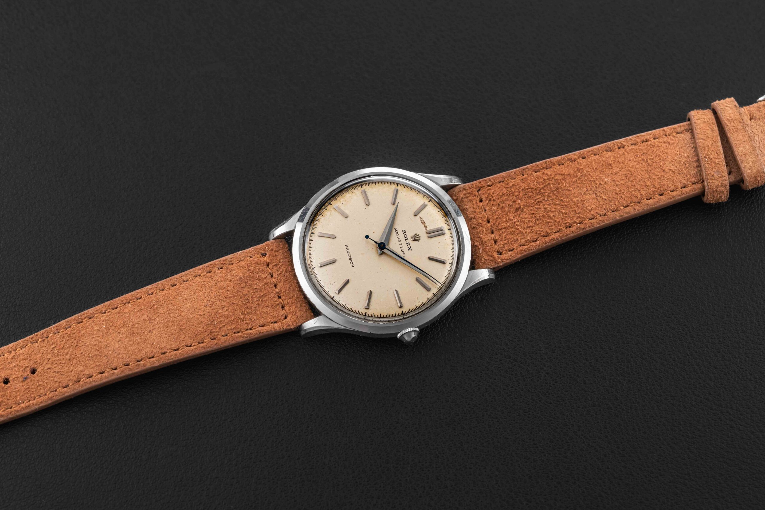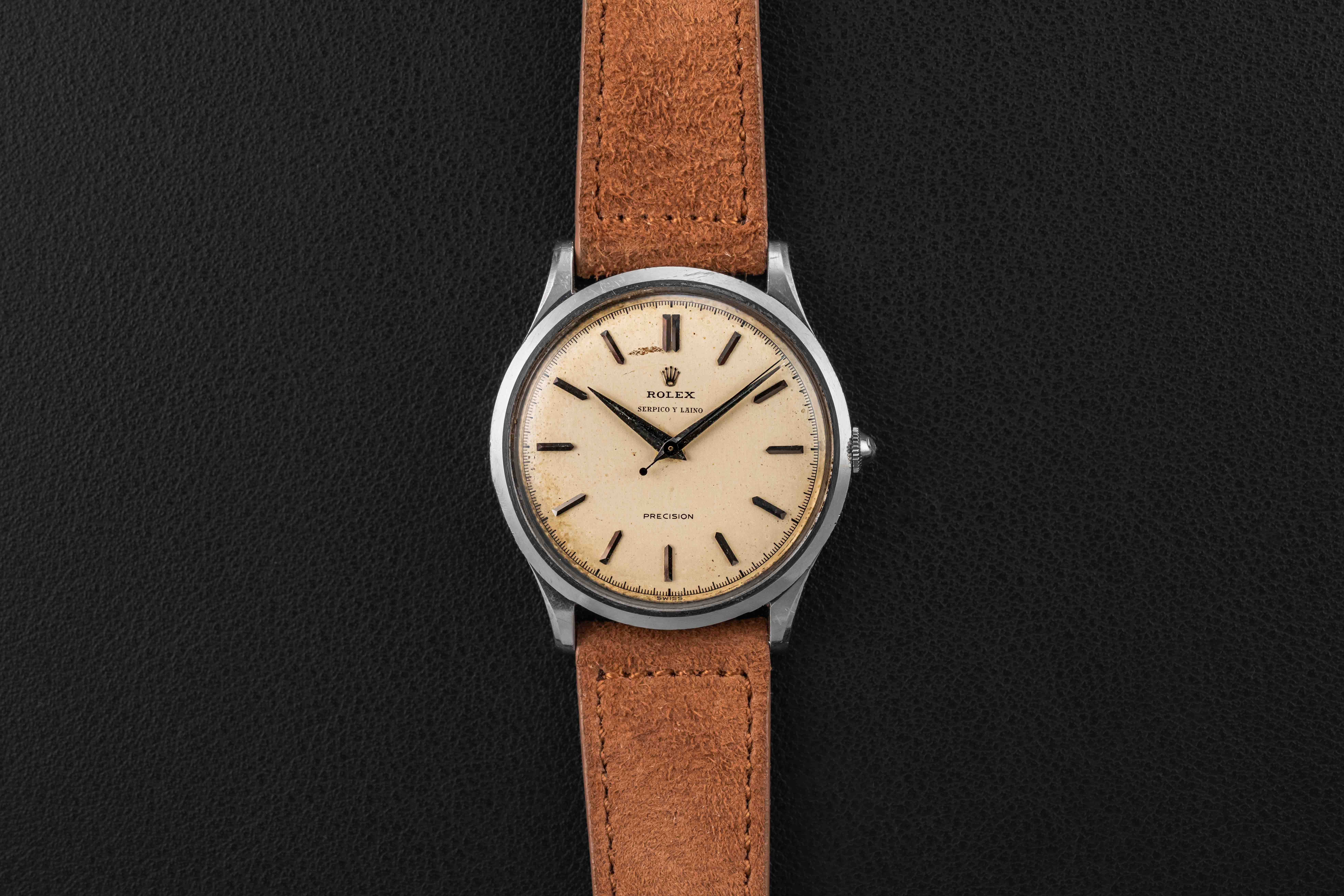The condition of this rare Rolex Precision is beautiful. The case appears unpolished, albeit worn from use, with original and defined beveled lugs, and shows the serial number and Rolex coronet on the outside of the caseback, in addition to the trademark “S&L Acero” stamp. Further, the dial is original and honest, showing an even and natural patina spread throughout.