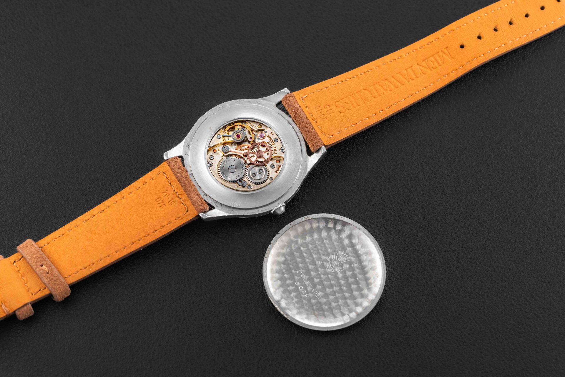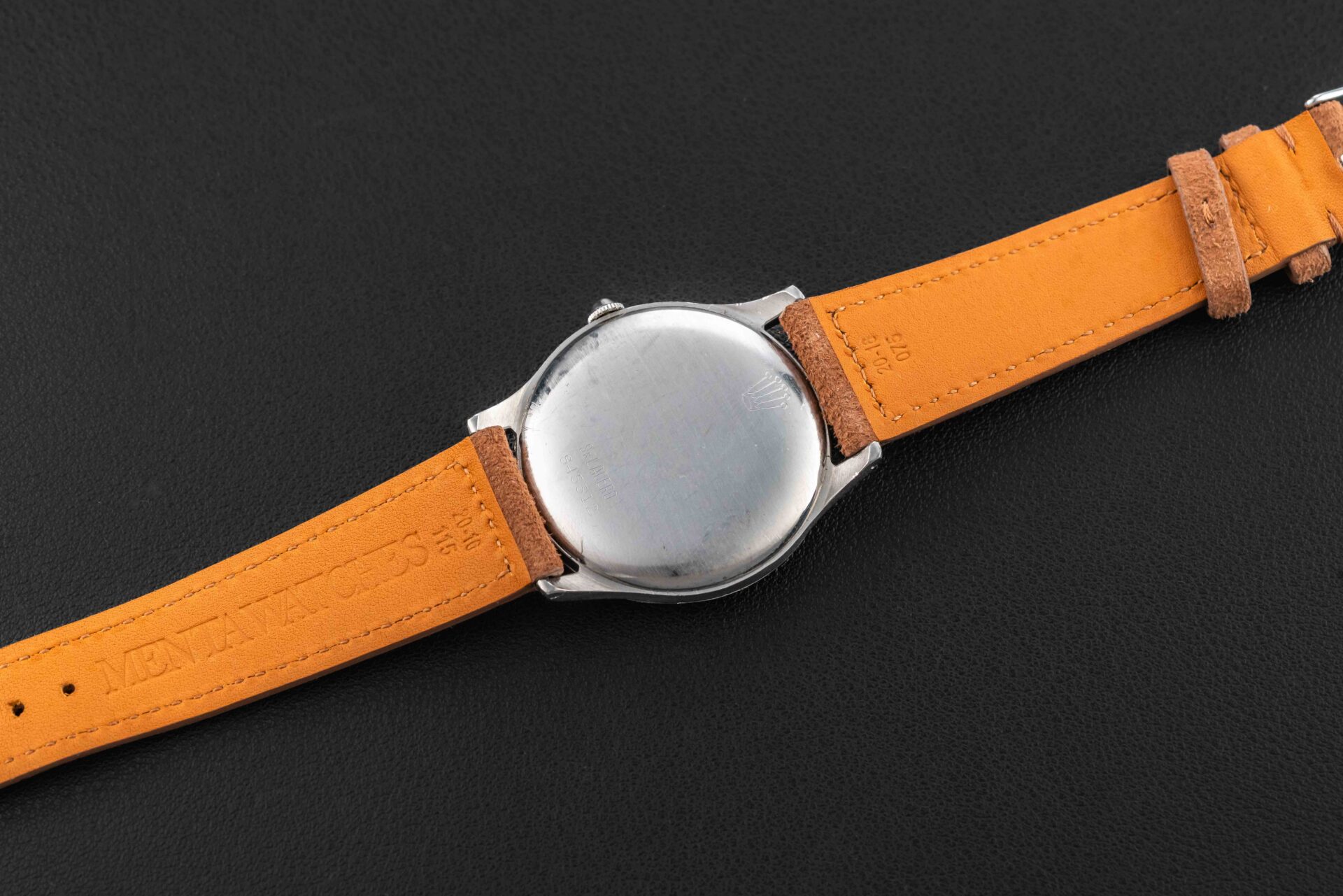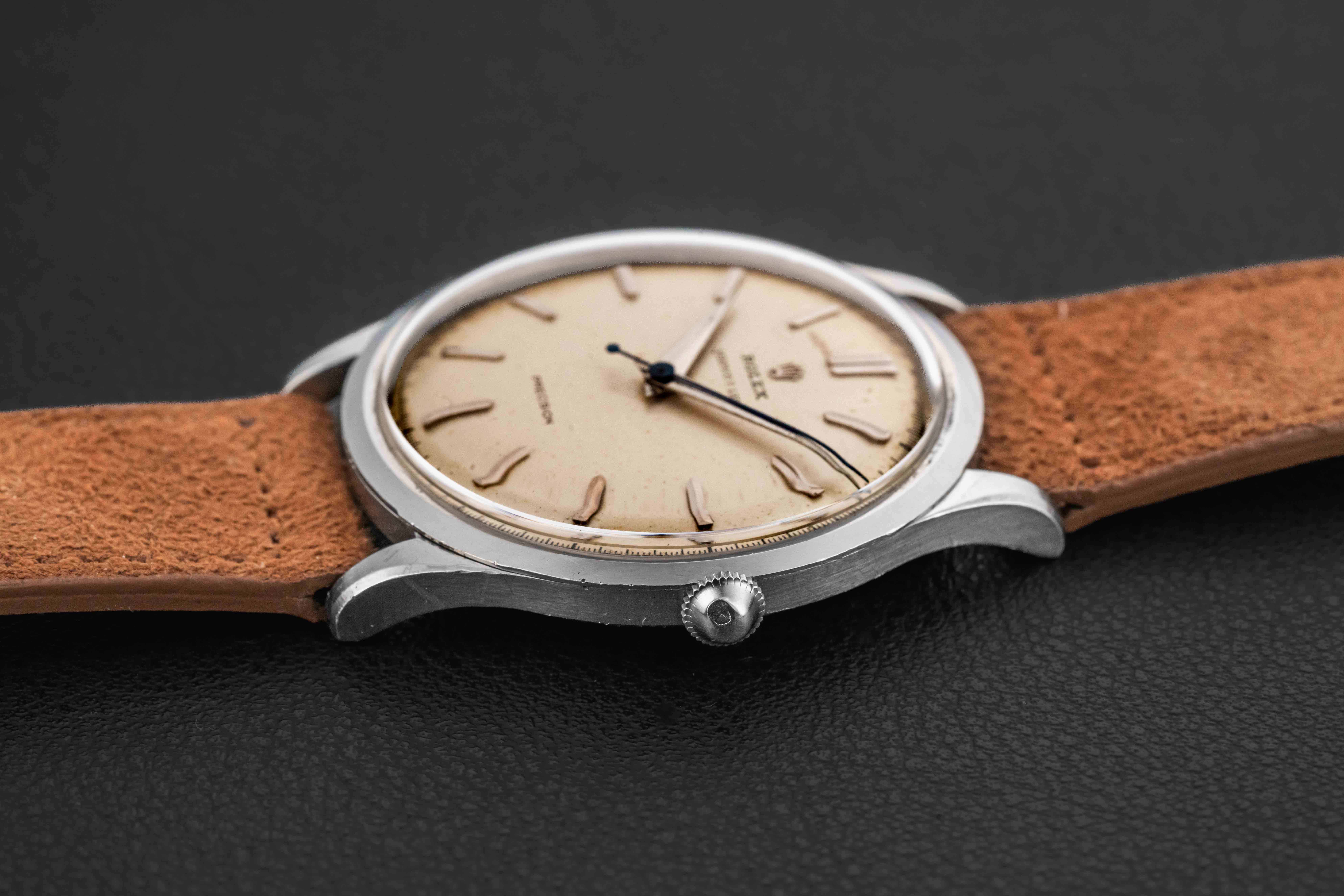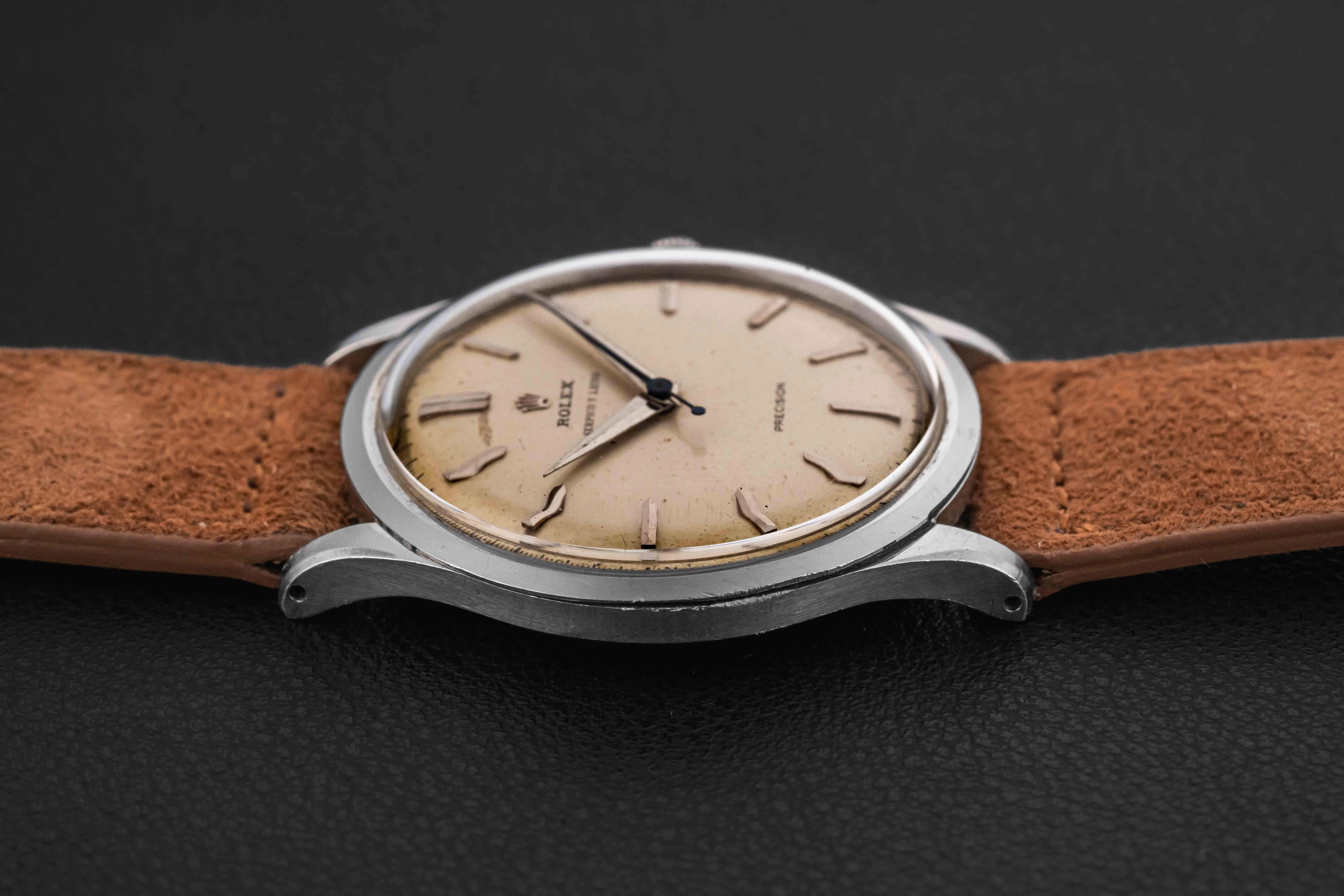 The condition of this rare Rolex Precision is beautiful. The case appears unpolished, albeit worn from use, with original and defined beveled lugs, and shows the serial number and Rolex coronet on the outside of the caseback, in addition to the trademark “S&L Acero” stamp. Further, the dial is original and honest, showing an even and natural patina spread throughout.