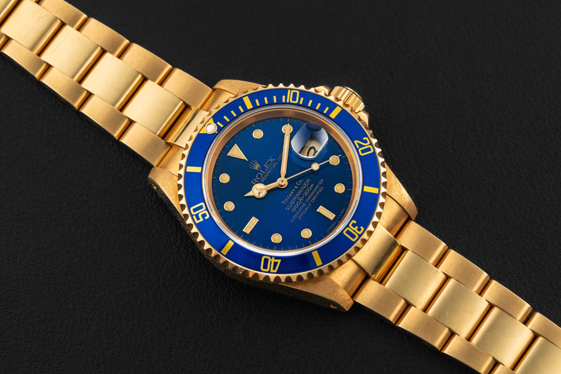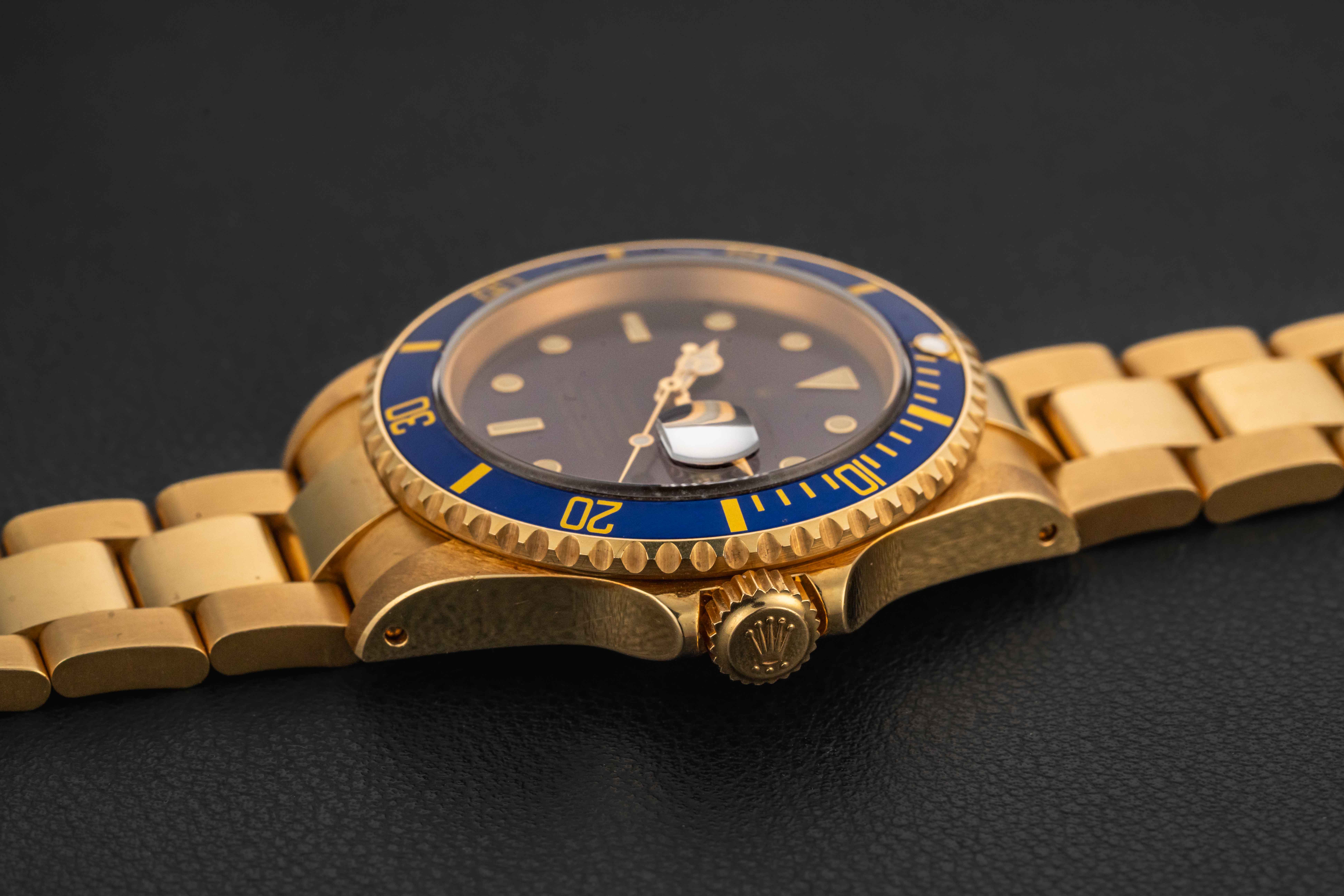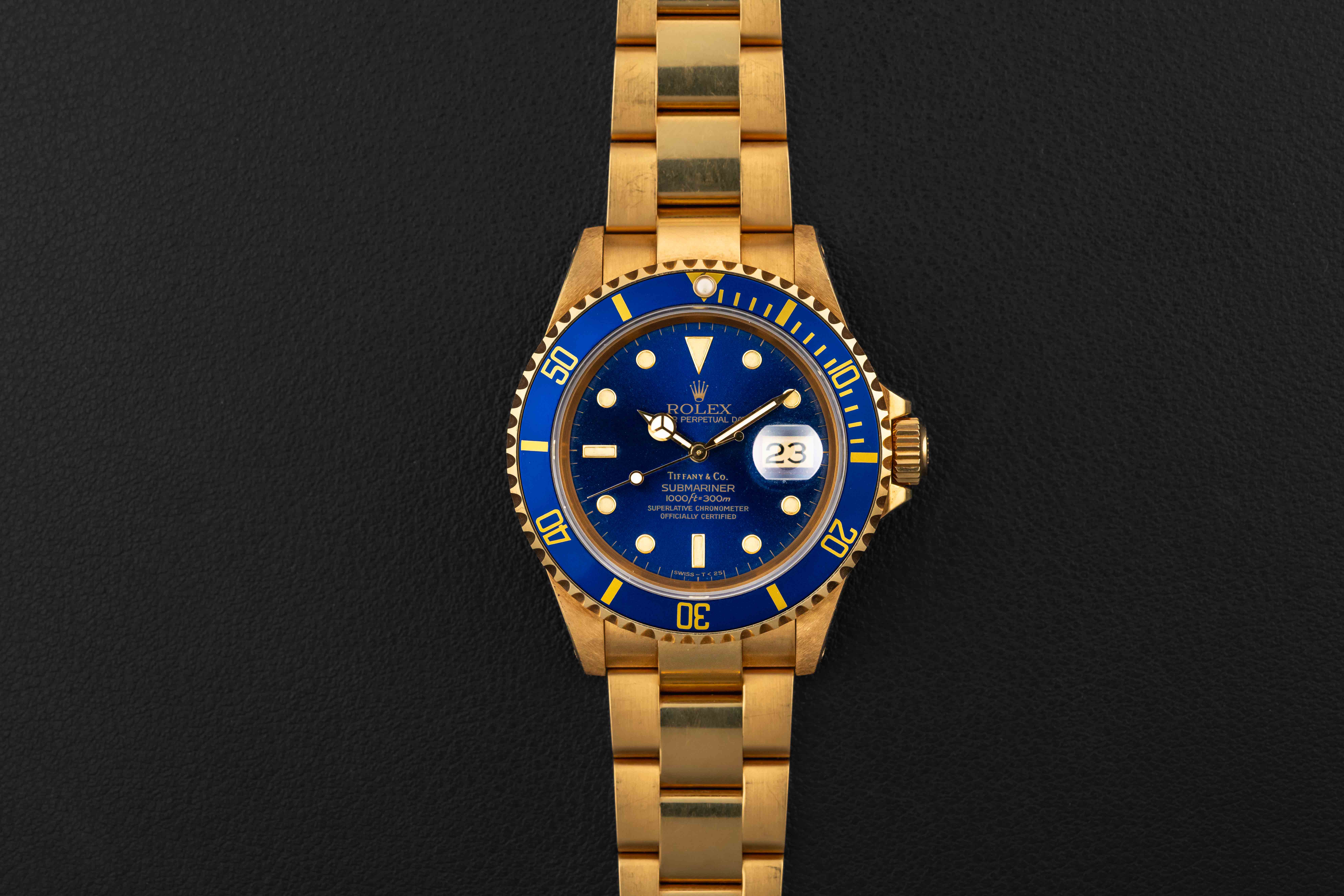 Offered here is a beautiful example of a Rolex Submariner, in solid 18kt yellow gold, circa 1989, bearing the reference 16618. However, what sets this example apart from the rest is the fact that it was retailed by Tiffany & Co. This Rolex Submariner is in excellent vintage condition, extremely sharp and well-preserved. The case does not appear to have been polished in the past (albeit worn from use), with sharp and even lugs, beveled edges still visible, and its original caseback sticker still visible on the back. The dial and lume are perfect, with no wear or damage, and aged to a lovely yellow color. The watch retains its original solid gold Rolex Oyster flip-lock bracelet with 11 full links and minimal stretch.